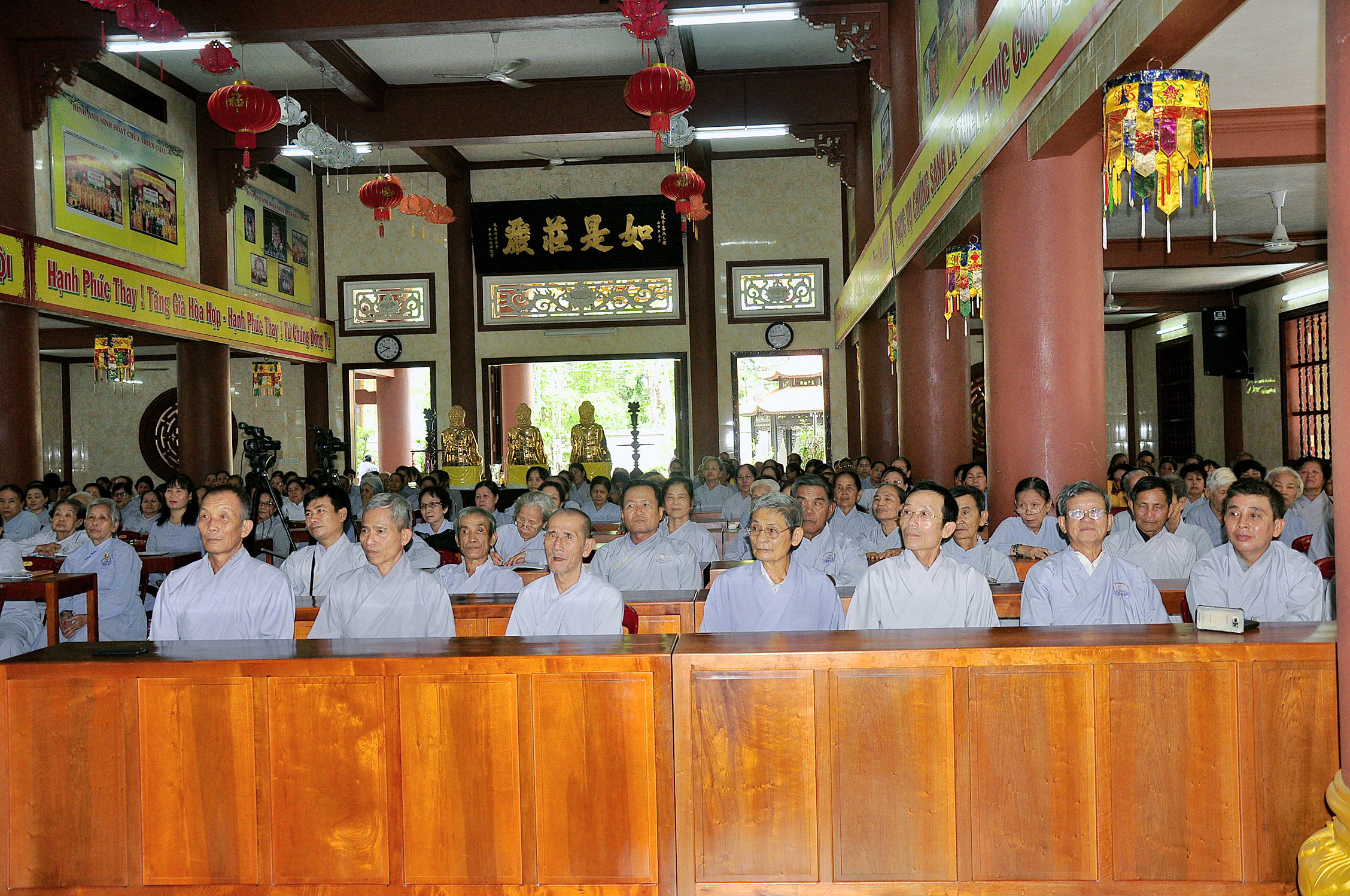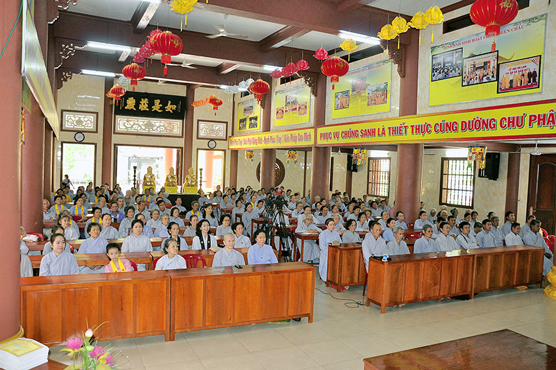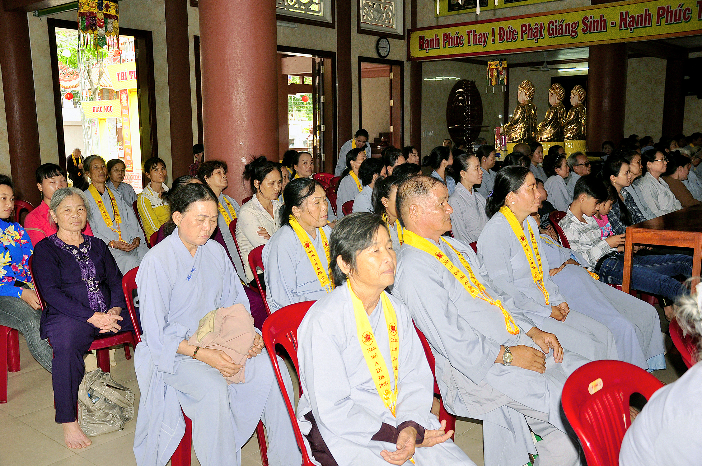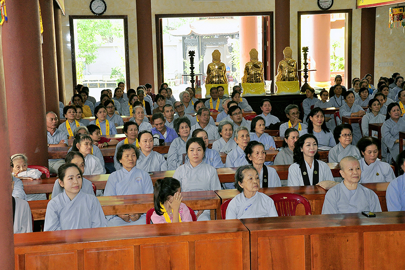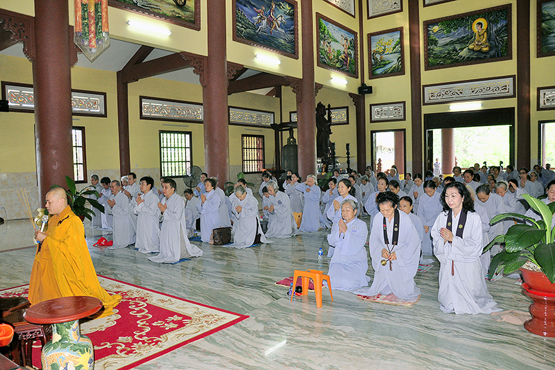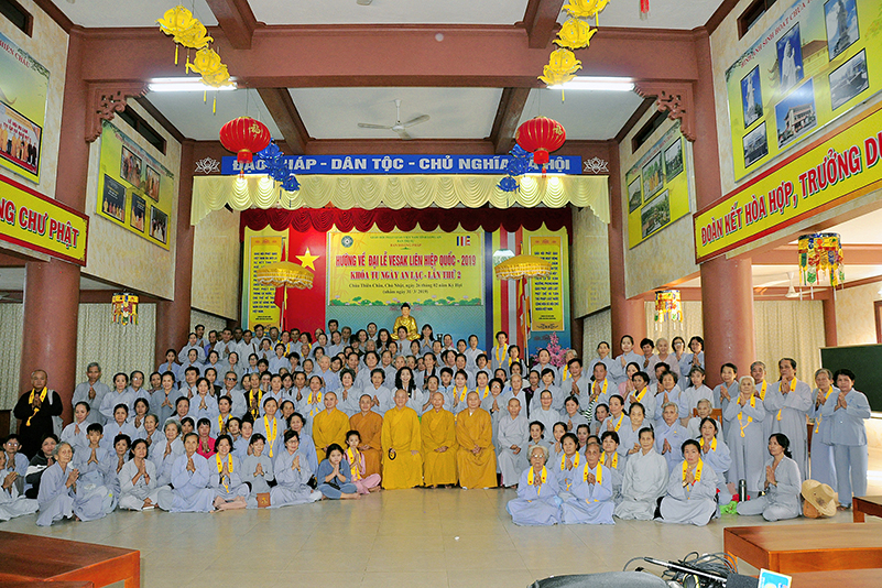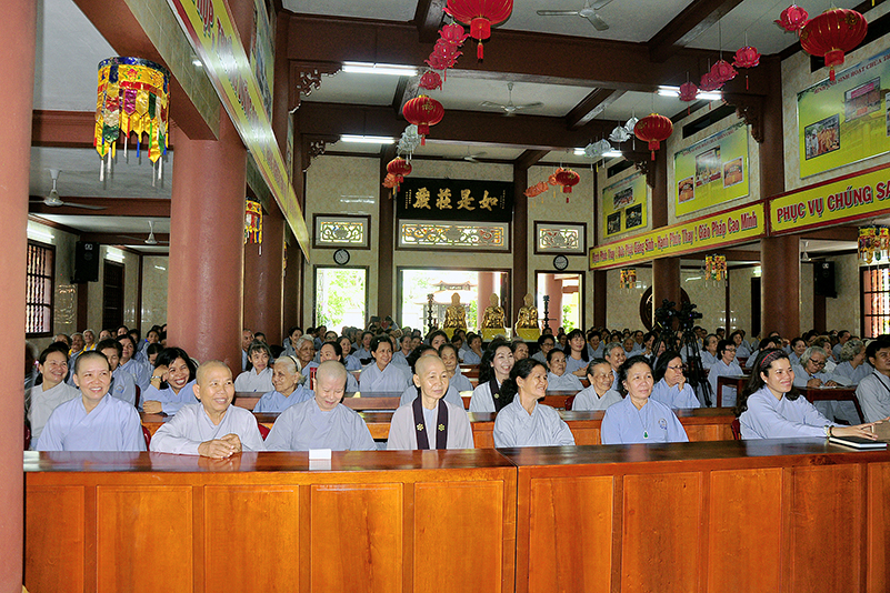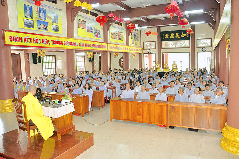 Theo chương trình được ấn định của khóa tu: 7h 30 chư Phật tử vân tập dùng điểm tâm sáng; 8h00 khóa tụng kinh cầu Quốc Thái Dân An; 9h00 nghe thuyết pháp do ĐĐ. Thích An Đạt tổ trưởng Tổ Báo Chí văn phòng II TƯ GHPGVN với chủ đề “ Hướng Về Đại Lễ Vesak Liên Hiệp Quốc” qua nội dung bài giảng Đại Đức giảng giải cho Phật tử hiểu về sự ra đời và những hoạt động của đại lễ Phật đản liên hiệp quốc. Ngoài ra, Đại Đức còn hướng dẫn cho Phật tủ phương pháp tu tập, nhằm thay đổi cuộc sống đưa đến sự an lạc, hạnh phúc. Điều chỉnh tự thân, tu sửa khẩu nghiệp, thay đổi từ thể xác đến tâm hồn cho được thanh tịnh trong sạch.