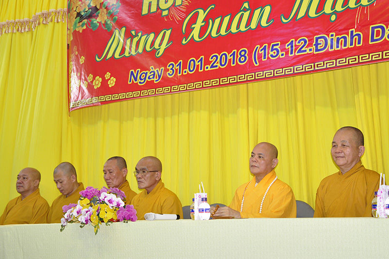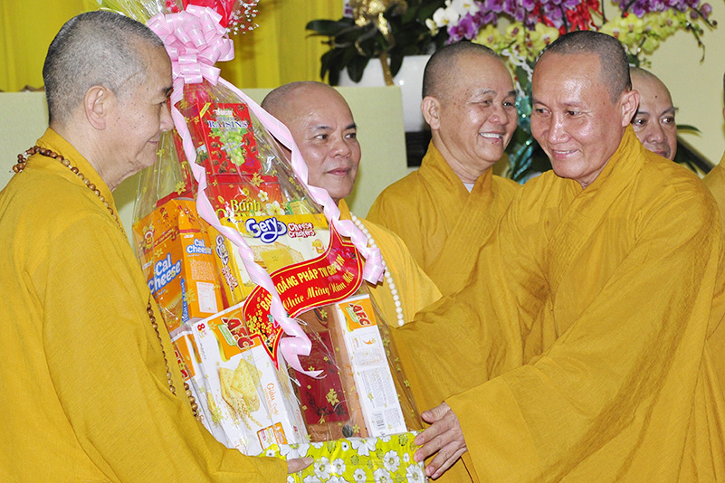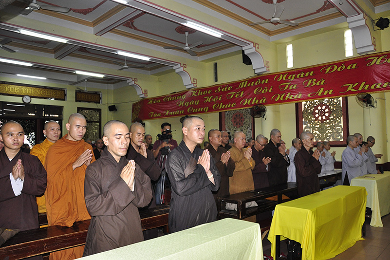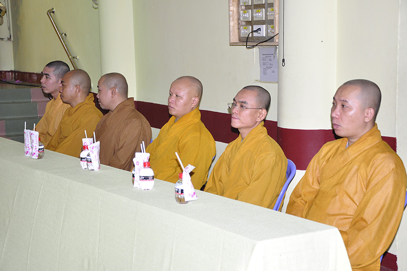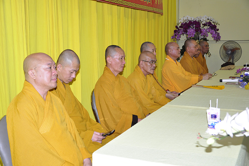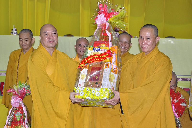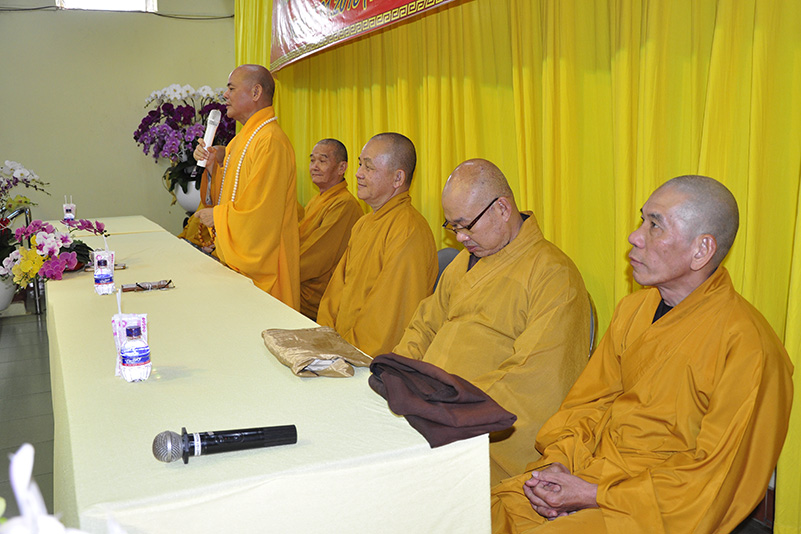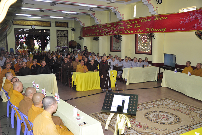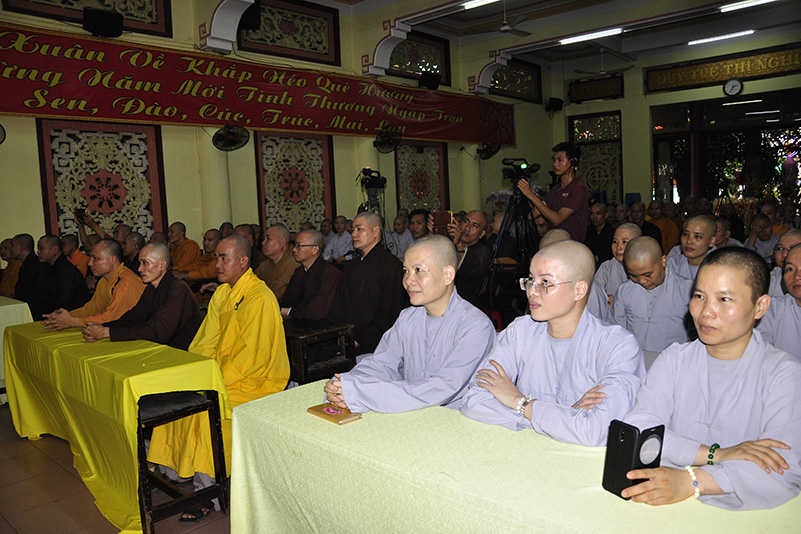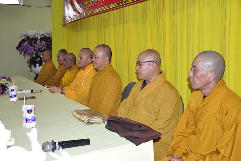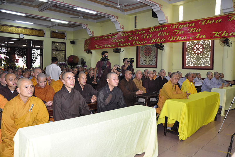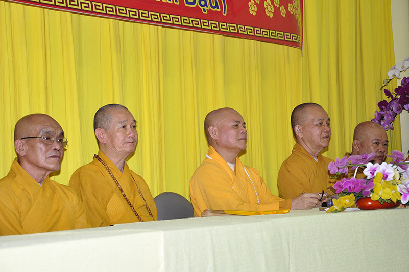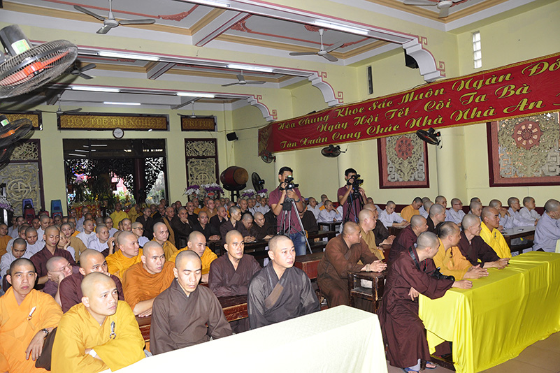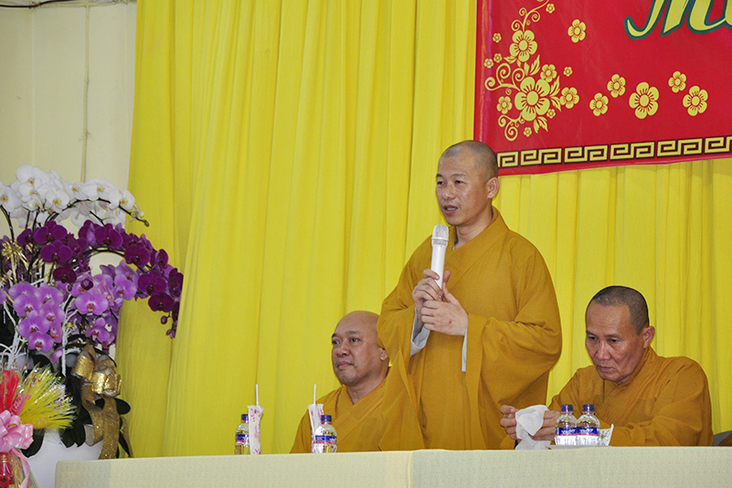 Thay mặt Tăng – Ni giảng sinh ĐĐ. Thích Huệ Tâm cùng một số vị cán bộ 2 lớp giảng sư đối trước chư tôn đức lãnh đạo trong Ban hoằng pháp, 2 lớp đào tạo Cao – Trung cấp giảng sư dâng lên lời tác bạch khánh tuế chúc xuân.