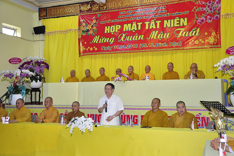 Phát biểu khai mạc Hoà thượng Thích Tấn Đạt nhắc lại truyền thống của Phật giáo Việt Nam luôn đồng hành với dân tộc ở mọi phương diện văn hoá, tư tưởng qua các lễ hội của dân tộc. Trong ý nghĩa đó để chuẩn bị chào đón năm mới xuân Mậu tuất, Ban hoằng pháp TW cũng như ban tổ chức 2 lớp đào tạo Cao – Trung cấp giảng sư đã có sáng kiến tổ chức buổi họp mặt tất niên của chư Tôn giáo phẩm lãnh đạo ban Hoằng pháp và Tăng-Ni sinh. Qua đó Hoà thượng cũng sách tấn anh em Tăng – Ni sinh về nghỉ tết hãy cố gắng, nỗ lực tuỳ theo cương vị, trai trò của mình tại trú xứ mà phát huy tổ chức lễ hội đón xuân thật ý nghĩa, góp phần vào xiểng dương chánh pháp, đem lại lợi lạc cho quần chúng nhân dân Phật tử sở tại. Đồng thời cũng là dịp để chư tôn giáo phẩm lão đạo trong Ban Hoằng pháp gửi chúc xuân và vấn an sức khoẻ đến chư vị thầy tổ, bổn sư của anh em giảng sinh. Và để Tăng -Ni sinh thể hiện tấm lòng của người học trò đảnh lễ khánh tuế chư tôn đức đã dày công dạy dỗ trong tinh thần tôn sư trọng đạo.