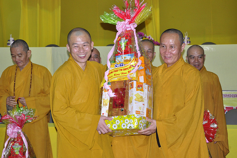 Sau lời phát biểu của Ông vụ trưởng Phật giáo là những lẵng hoa tươi thắm và phần quà biểu thị lòng tôn kính của Tăng -Ni giảng sinh dâng lên cúng dường chúc mừng khánh tuế chư tôn giáo phẩm lãnh đạo.