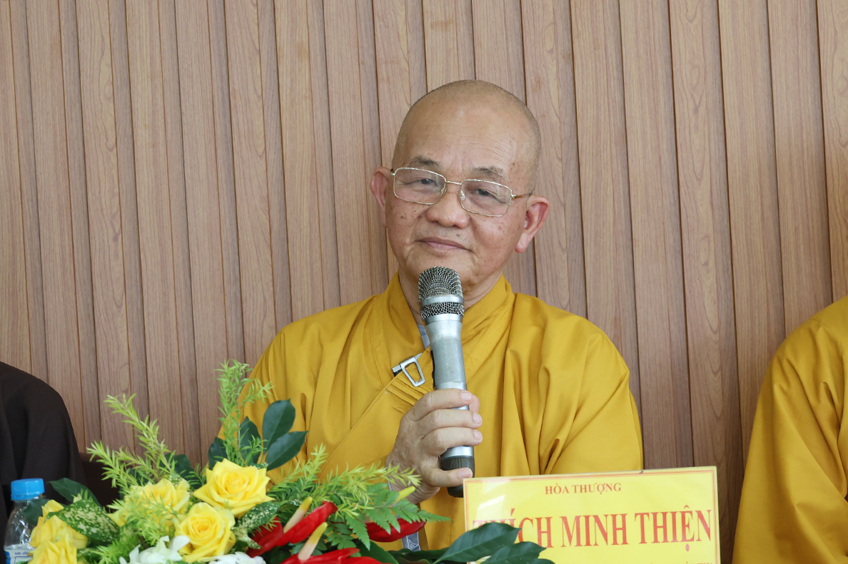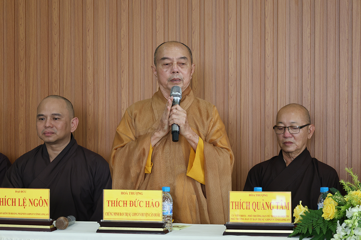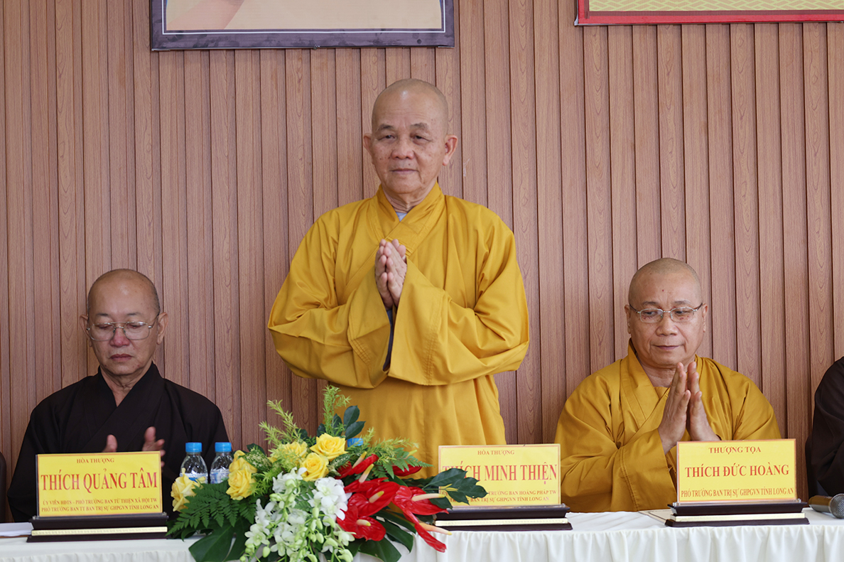 Chứng minh buổi lễ, HT. Thích Minh Thiện – Trưởng BTS GHPGVN tỉnh Long An đã ban lời đạo từ, khơi gợi nguồn cội tâm linh phát triển Phật giáo đồng hành cùng dân tộc, đề cao giá trị của việc hoằng pháp, giáo dục Tăng Ni trẻ học tập, tu học, kế nghiệp thầy tổ làm xương minh Phật giáo, xây dựng củng cố tổ chức Giáo hội ổn định, luôn đúng với tinh thần dân tộc, phát luật Nhà nước, hiến chương GHPGVN.