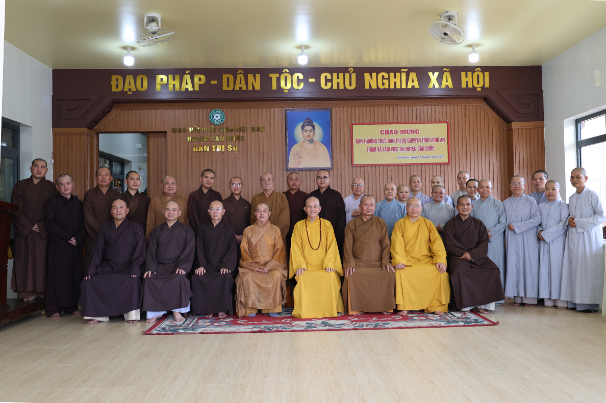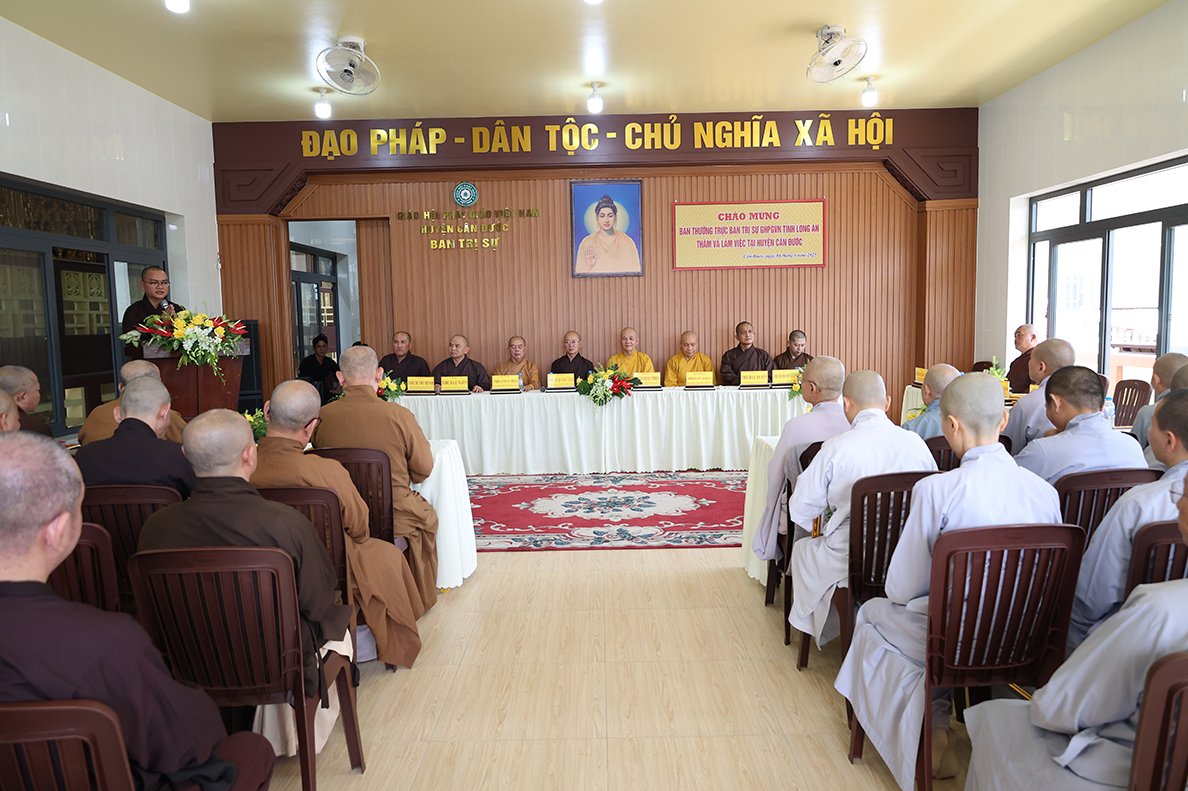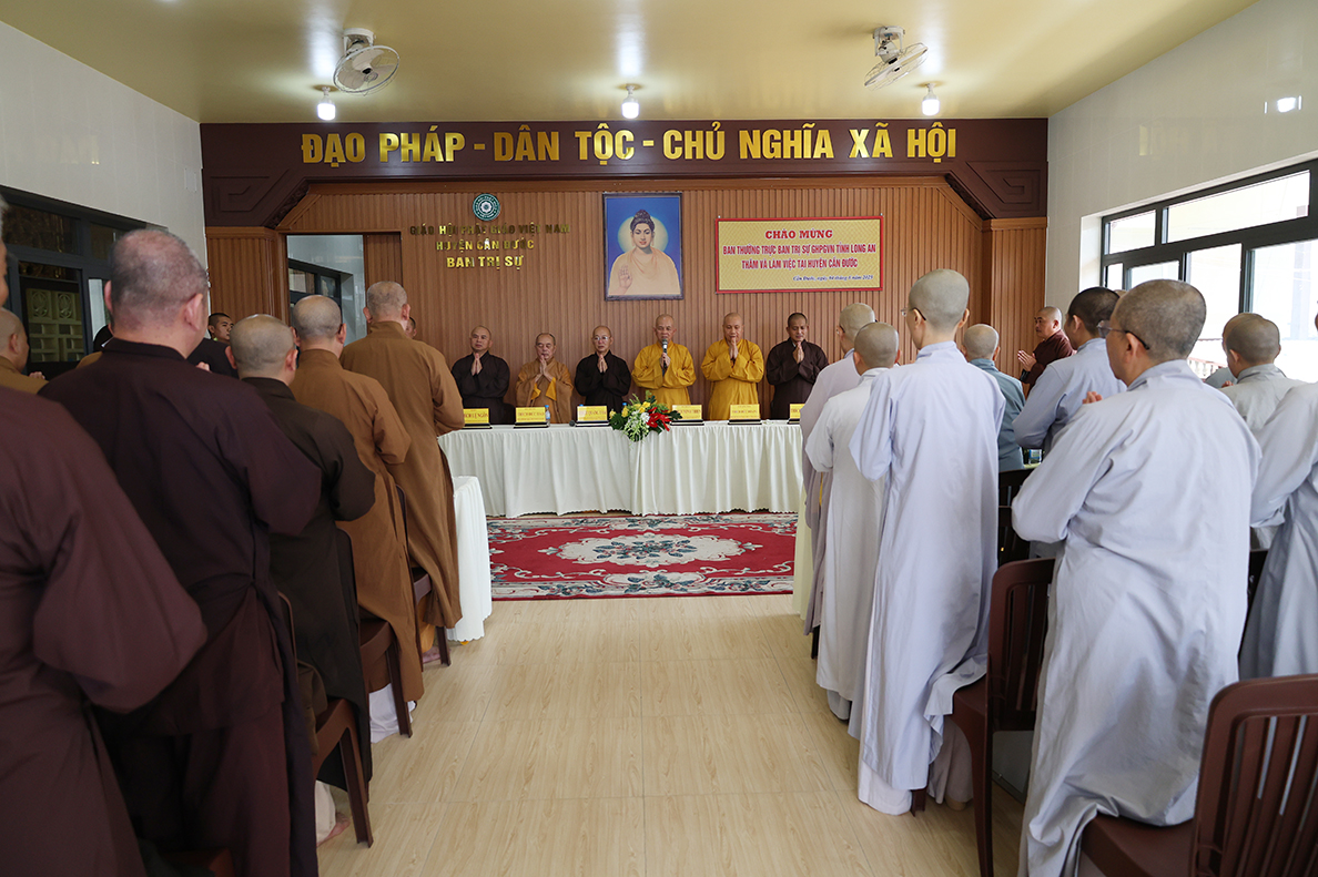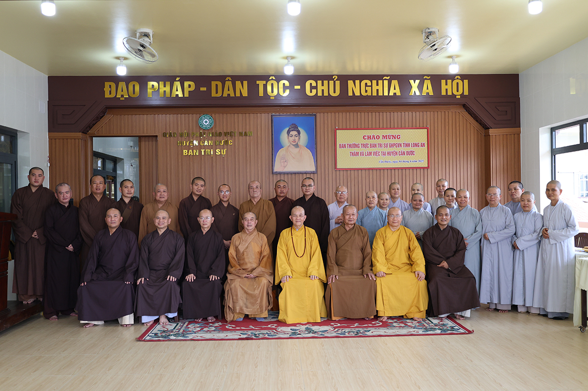 Đón tiếp phái đoàn có HT. Thích Đức Hảo – Chứng minh BTS GHPGVN huyện Cần Đước; ĐĐ. Thích Trí Minh – Ủy viên Thường trực BTS GHPGVN tỉnh, Trưởng BTS GHPGVN huyện Cần Đước; TT. Thích Tâm Hướng – Ủy viên BTS GHPGVN tỉnh, Phó trưởng ban Thường trực BTS GHPGVN huyền Cần Đước; ĐĐ. Thích Quảng Giác – Ủy viên BTS GHPGVN, Phó trưởng BTS GHPGVN huyện Cần Đước; ĐĐ. Thích Nguyên Tịnh – Ủy viên BTS GHPGVN tỉnh, Chánh Thư ký BTS GHPGVN huyện Cần Đước; Chư tôn đức Tăng, Ni, Trụ trì các tự viện trong đia bàn huyện Cần Đước đồng tham dự.