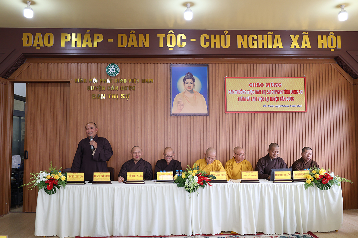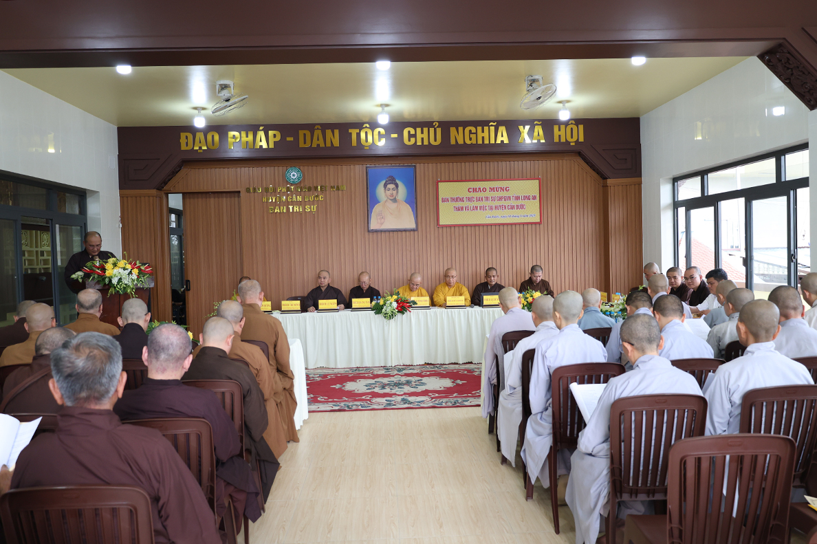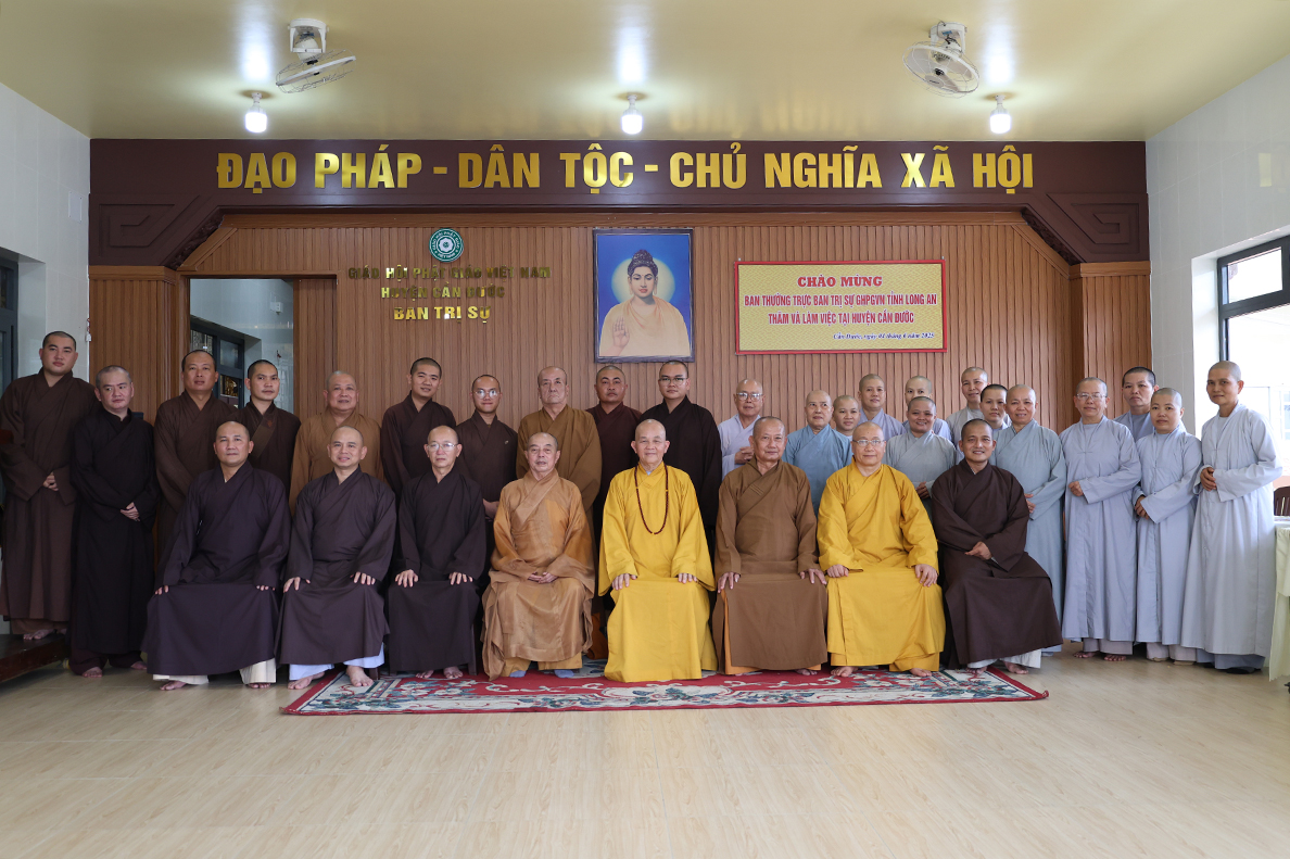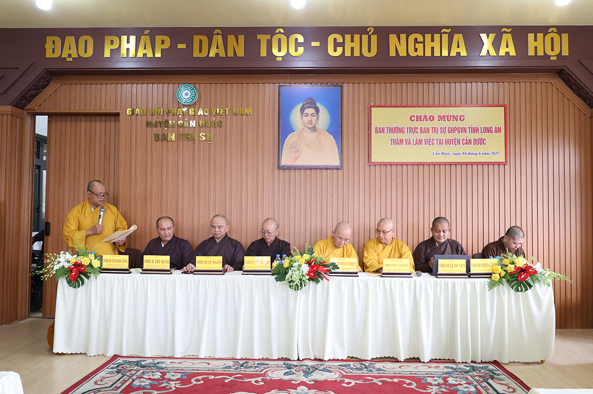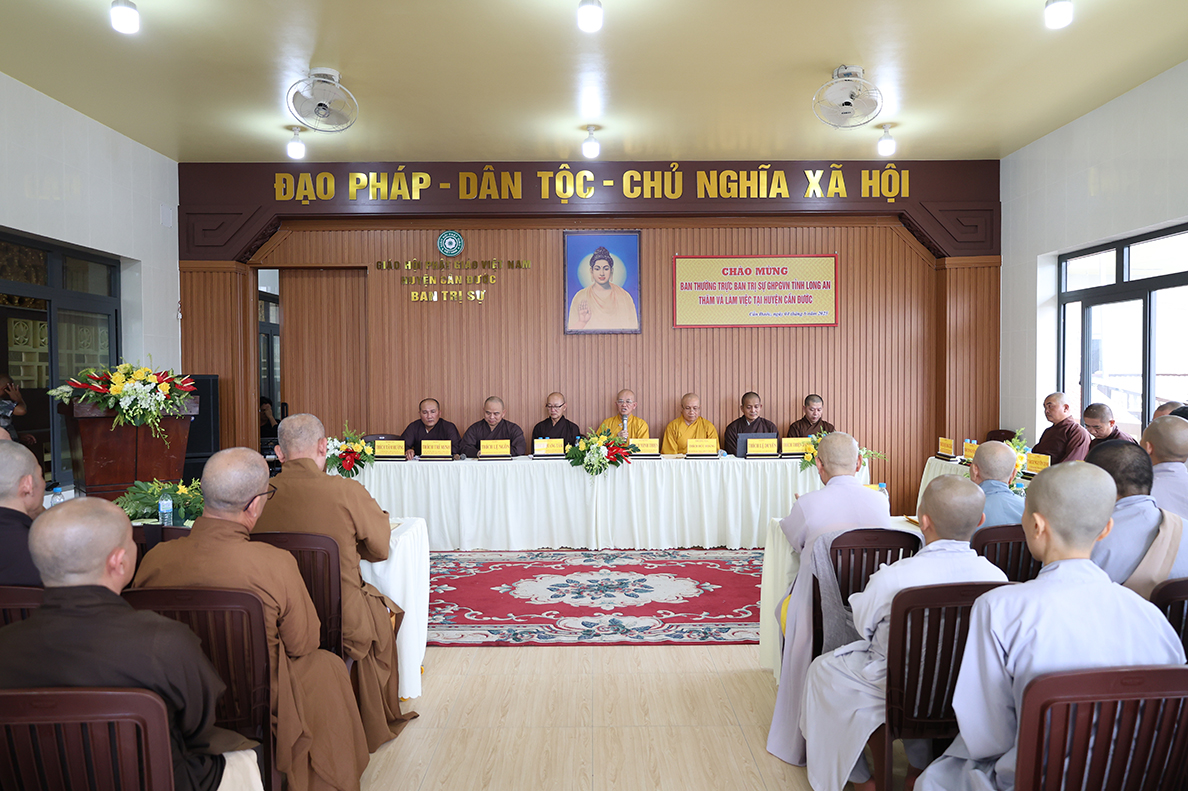 Đón tiếp phái đoàn có HT. Thích Đức Hảo – Chứng minh BTS GHPGVN huyện Cần Đước; ĐĐ. Thích Trí Minh – Ủy viên Thường trực BTS GHPGVN tỉnh, Trưởng BTS GHPGVN huyện Cần Đước; TT. Thích Tâm Hướng – Ủy viên BTS GHPGVN tỉnh, Phó trưởng ban Thường trực BTS GHPGVN huyền Cần Đước; ĐĐ. Thích Quảng Giác – Ủy viên BTS GHPGVN, Phó trưởng BTS GHPGVN huyện Cần Đước; ĐĐ. Thích Nguyên Tịnh – Ủy viên BTS GHPGVN tỉnh, Chánh Thư ký BTS GHPGVN huyện Cần Đước; Chư tôn đức Tăng, Ni, Trụ trì các tự viện trong đia bàn huyện Cần Đước đồng tham dự.