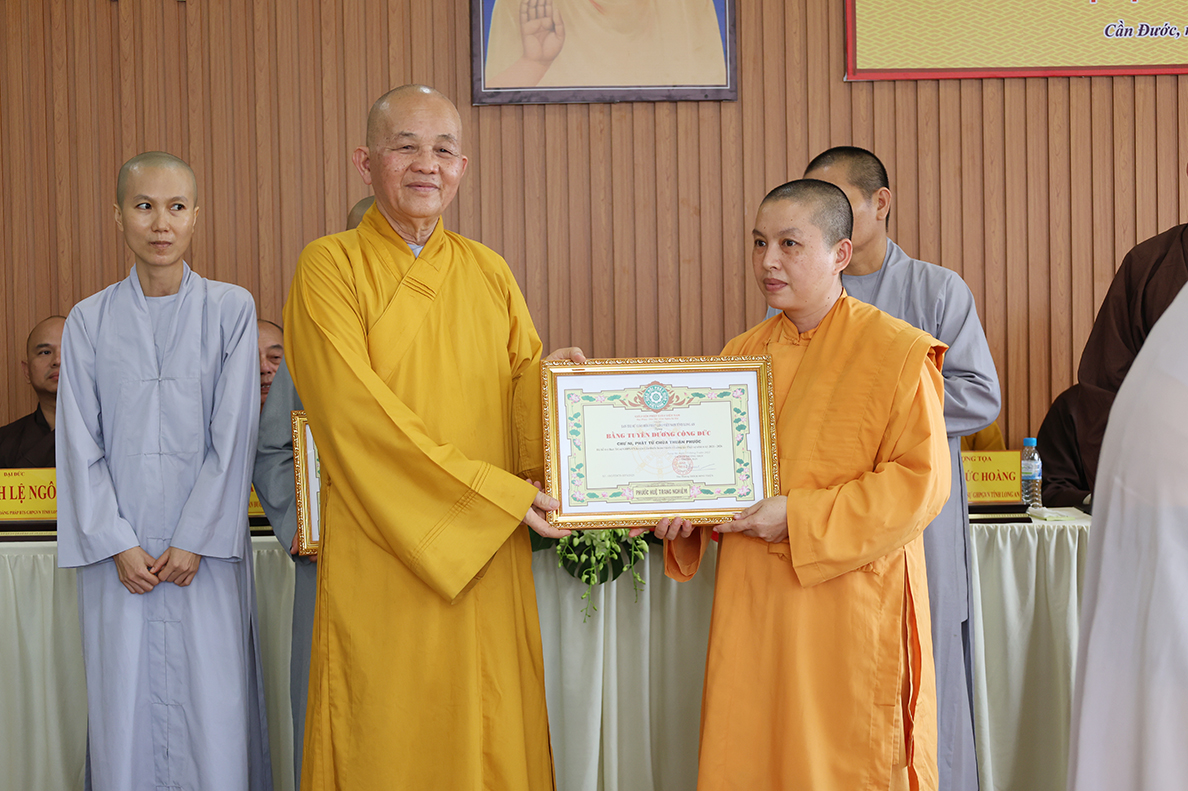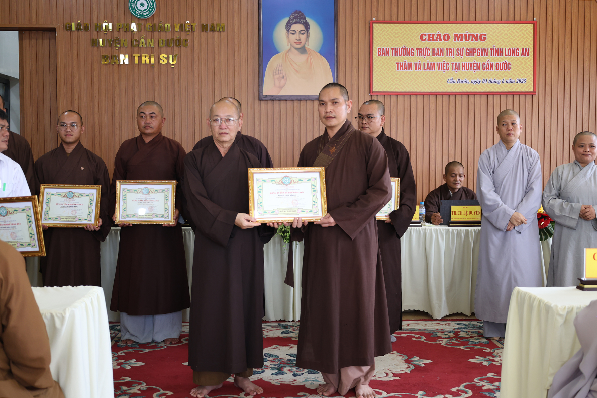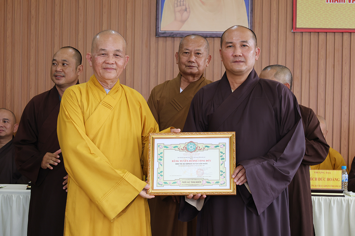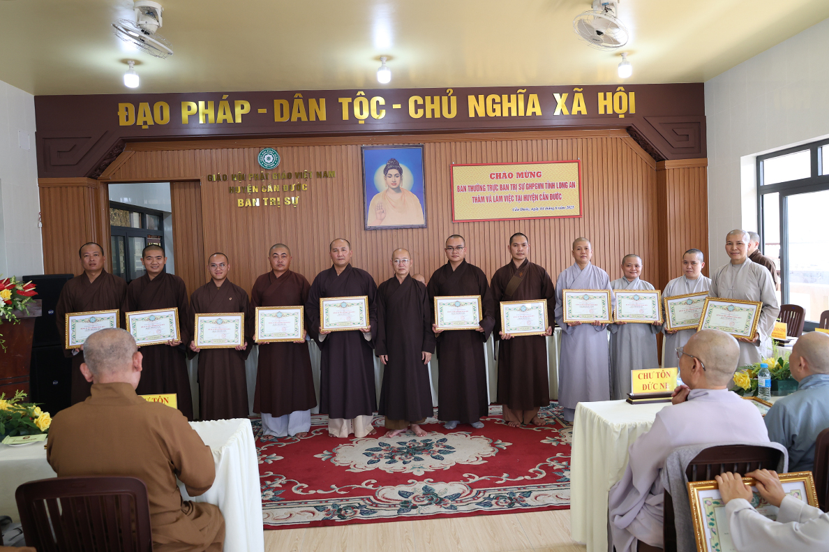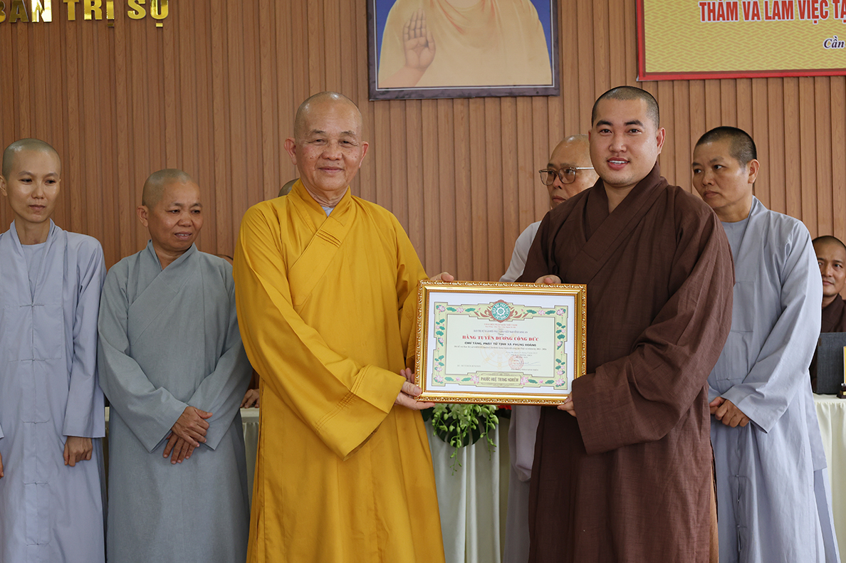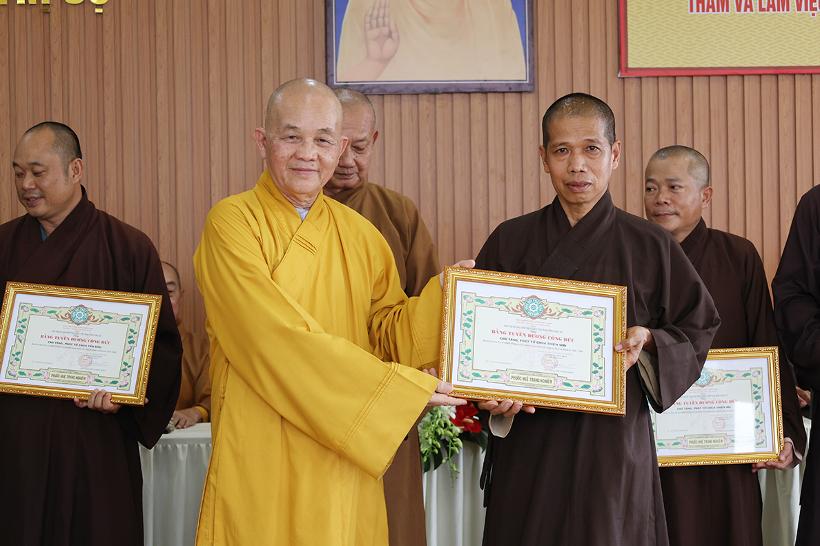 Nhân dịp này, BTS GHPGVN tỉnh Long An đã trao bằng tuyên dương công đức đến các cá nhân và tập thể đã hoàn thành xuất sắc công tác Phật sự nhiệm kỳ 2021 – 2025.