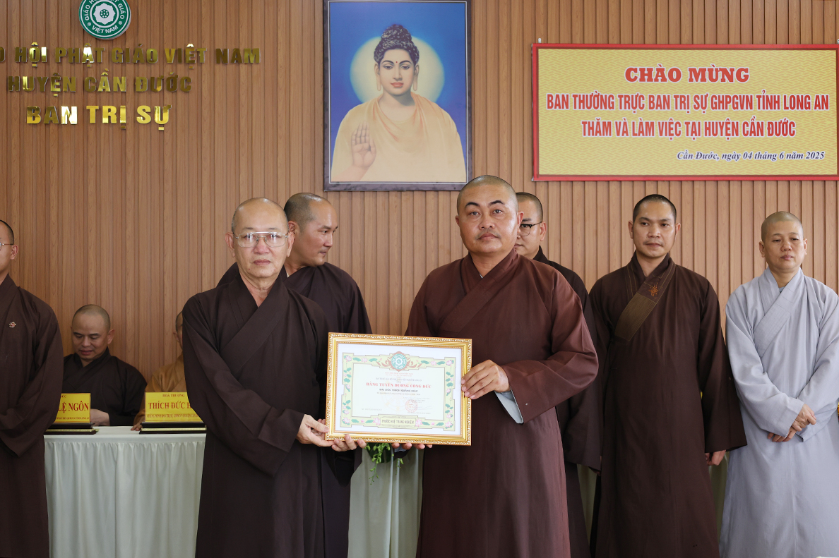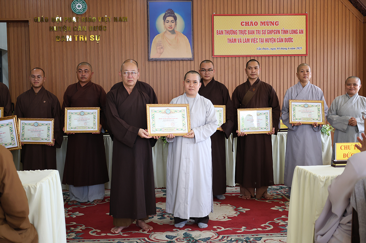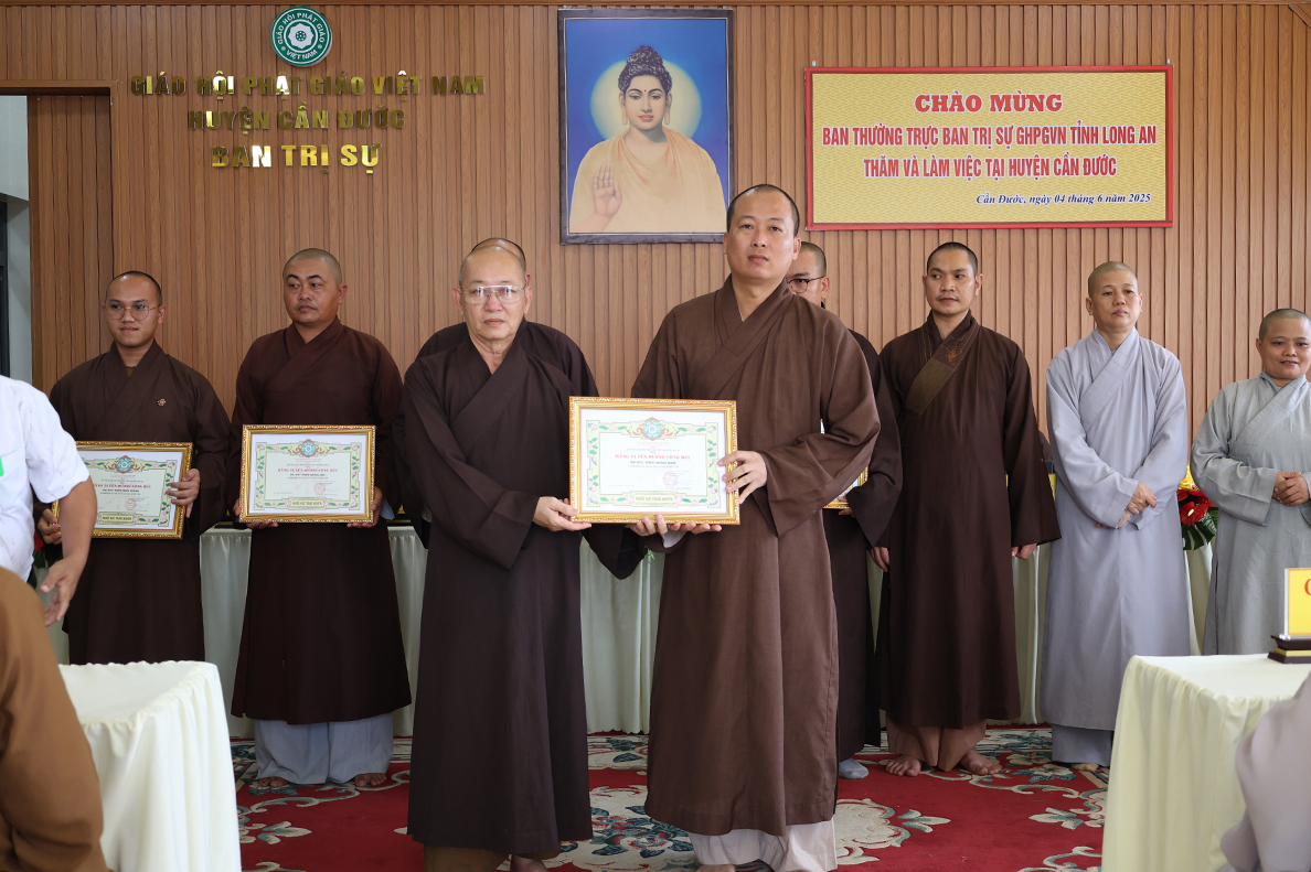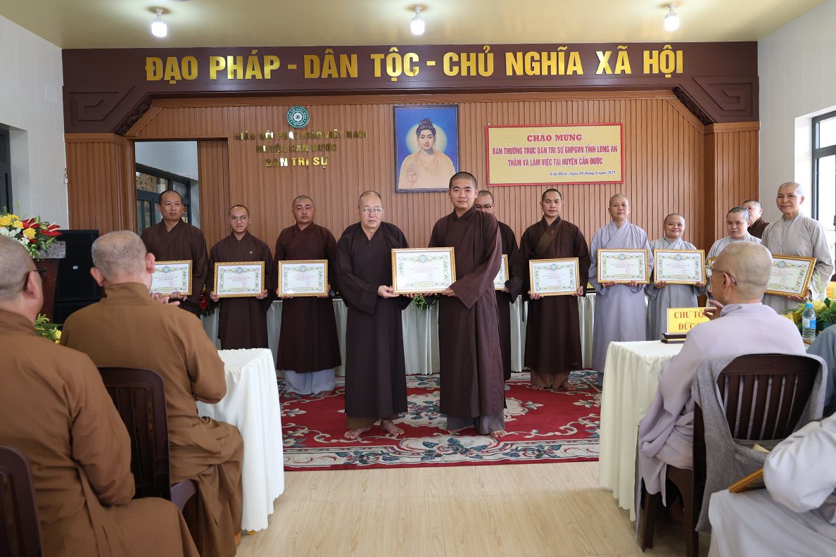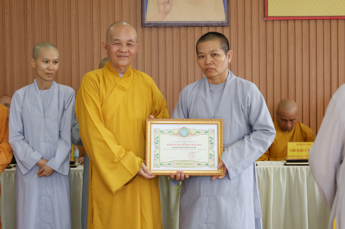 Nhân dịp này, BTS GHPGVN tỉnh Long An đã trao bằng tuyên dương công đức đến các cá nhân và tập thể đã hoàn thành xuất sắc công tác Phật sự nhiệm kỳ 2021 – 2025.
