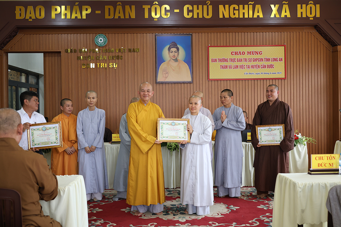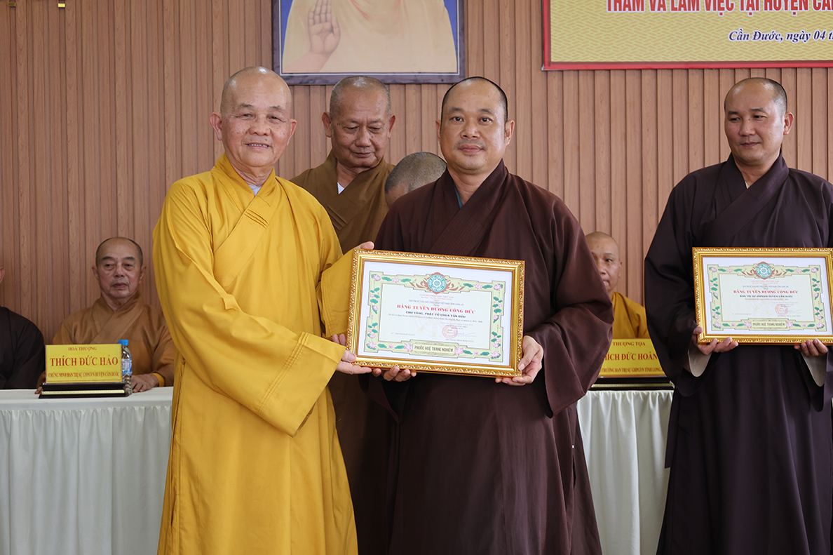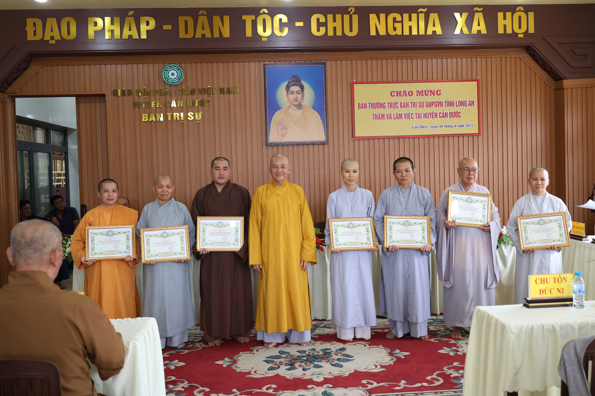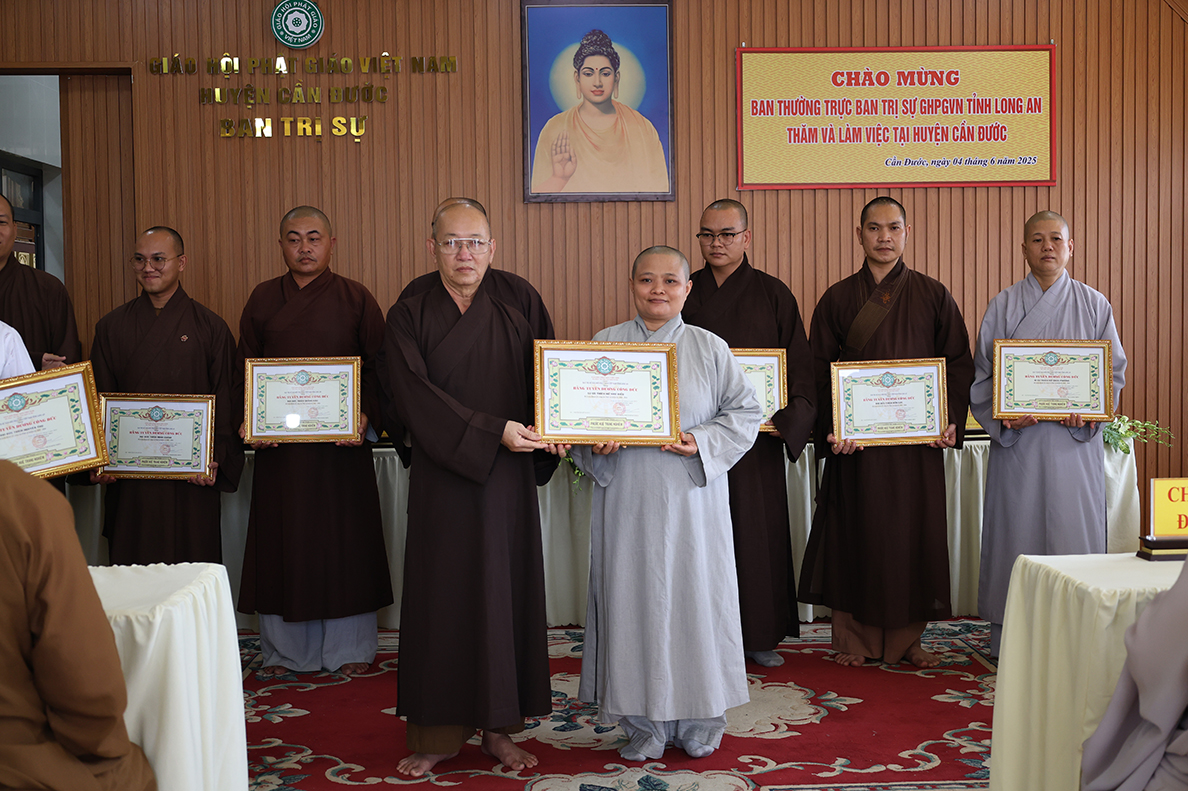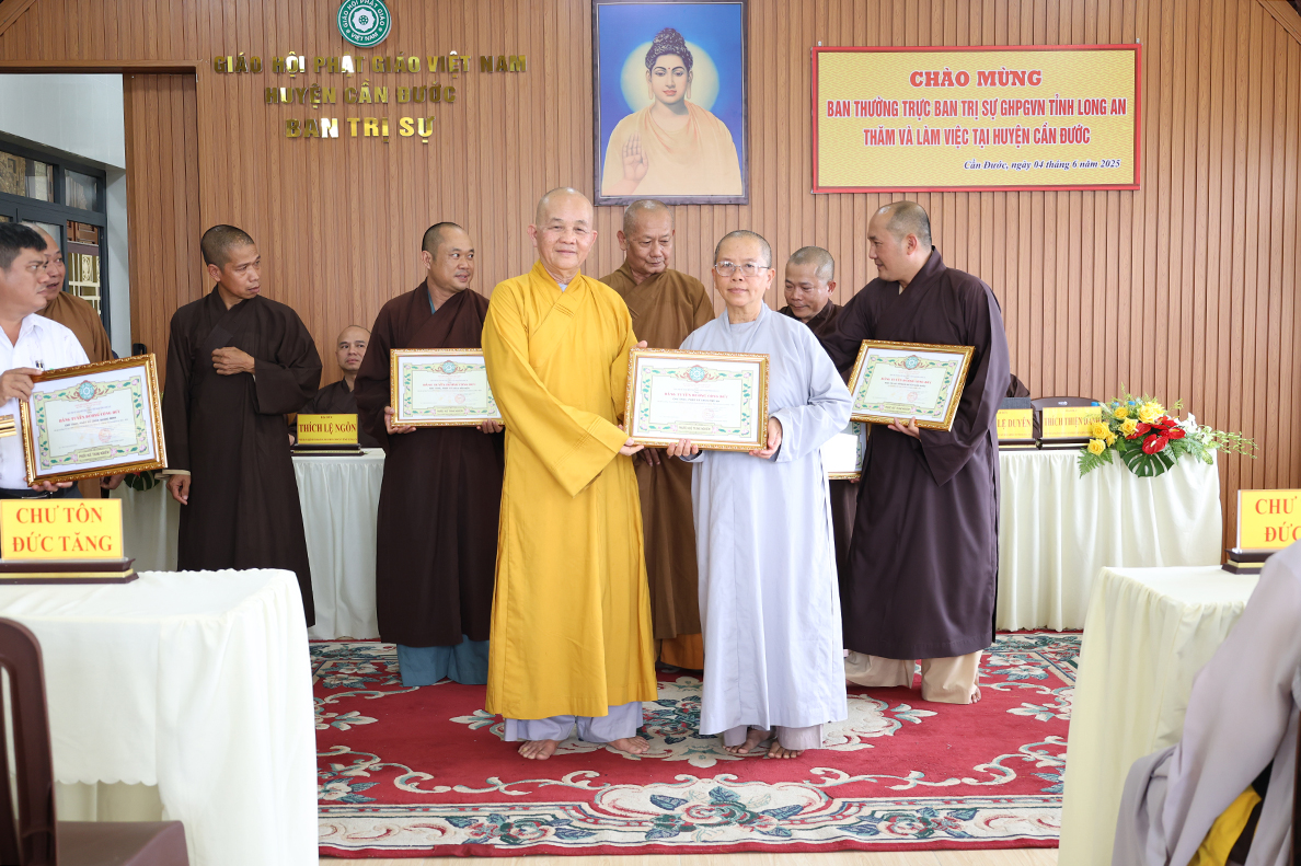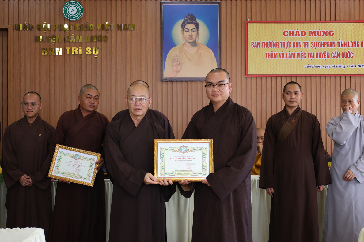 Nhân dịp này, BTS GHPGVN tỉnh Long An đã trao bằng tuyên dương công đức đến các cá nhân và tập thể đã hoàn thành xuất sắc công tác Phật sự nhiệm kỳ 2021 – 2025.