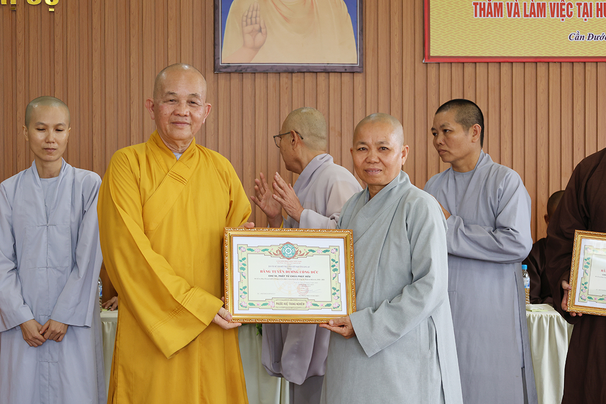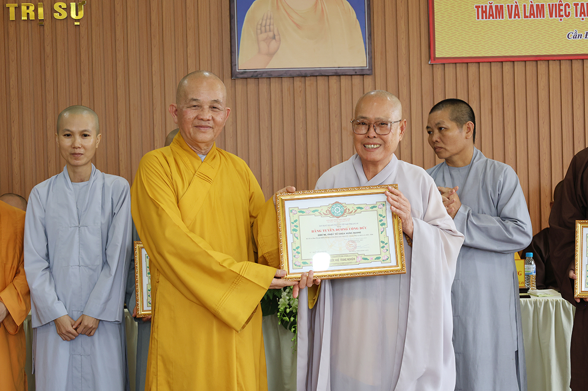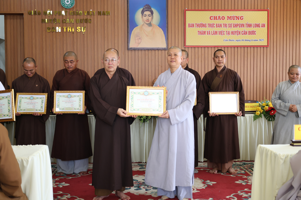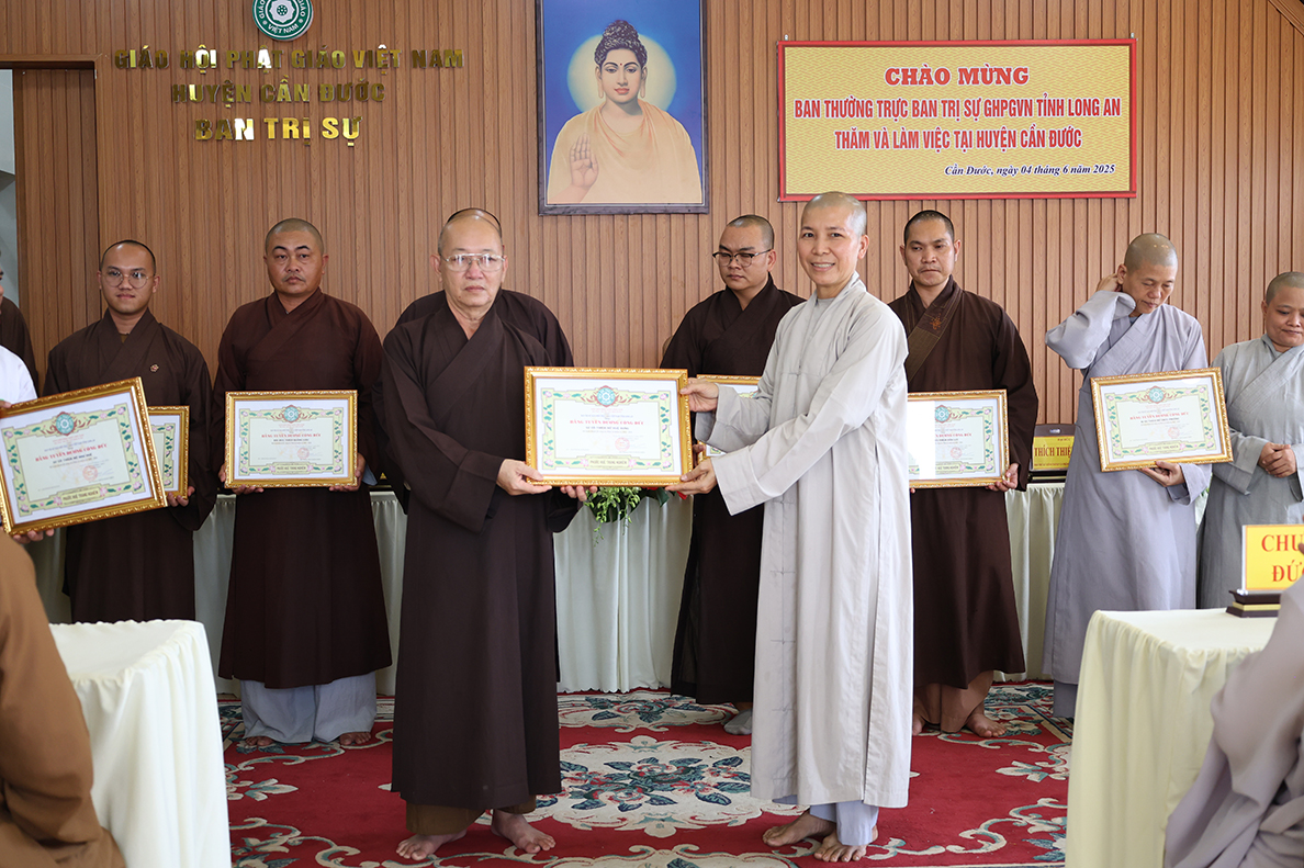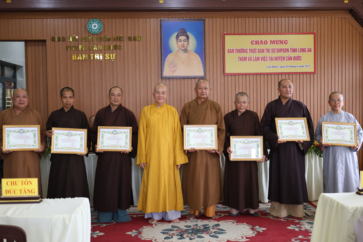 Nhân dịp này, BTS GHPGVN tỉnh Long An đã trao bằng tuyên dương công đức đến các cá nhân và tập thể đã hoàn thành xuất sắc công tác Phật sự nhiệm kỳ 2021 – 2025.