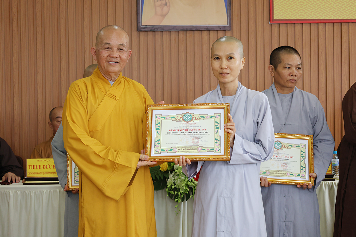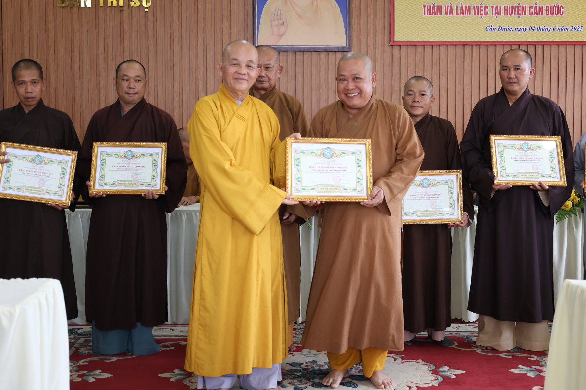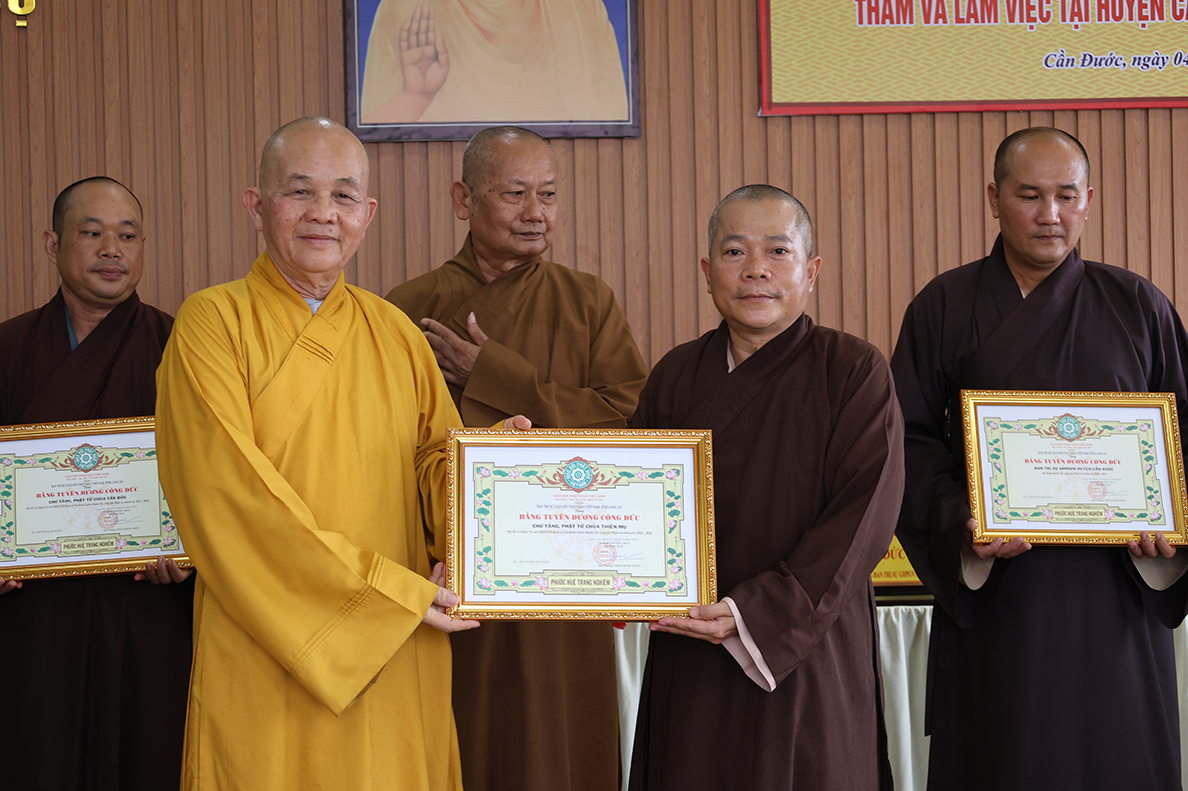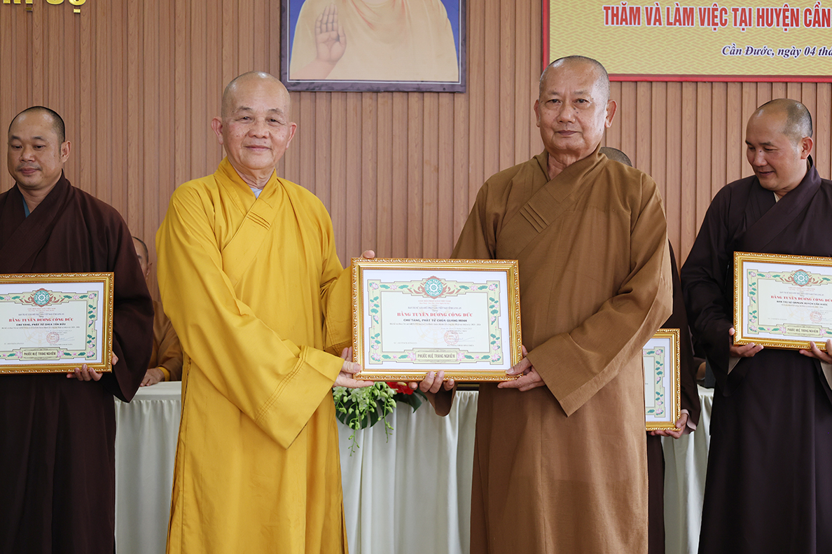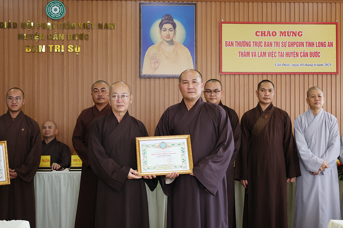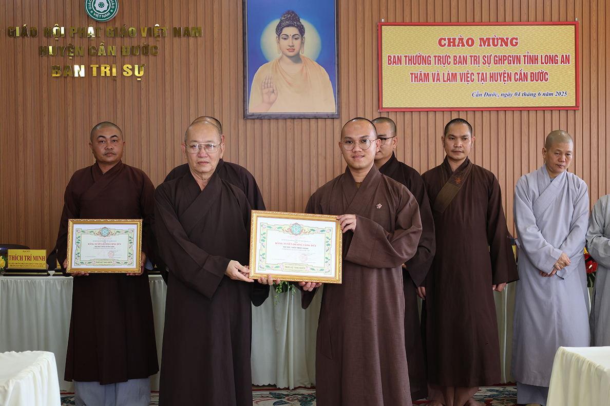 Nhân dịp này, BTS GHPGVN tỉnh Long An đã trao bằng tuyên dương công đức đến các cá nhân và tập thể đã hoàn thành xuất sắc công tác Phật sự nhiệm kỳ 2021 – 2025.