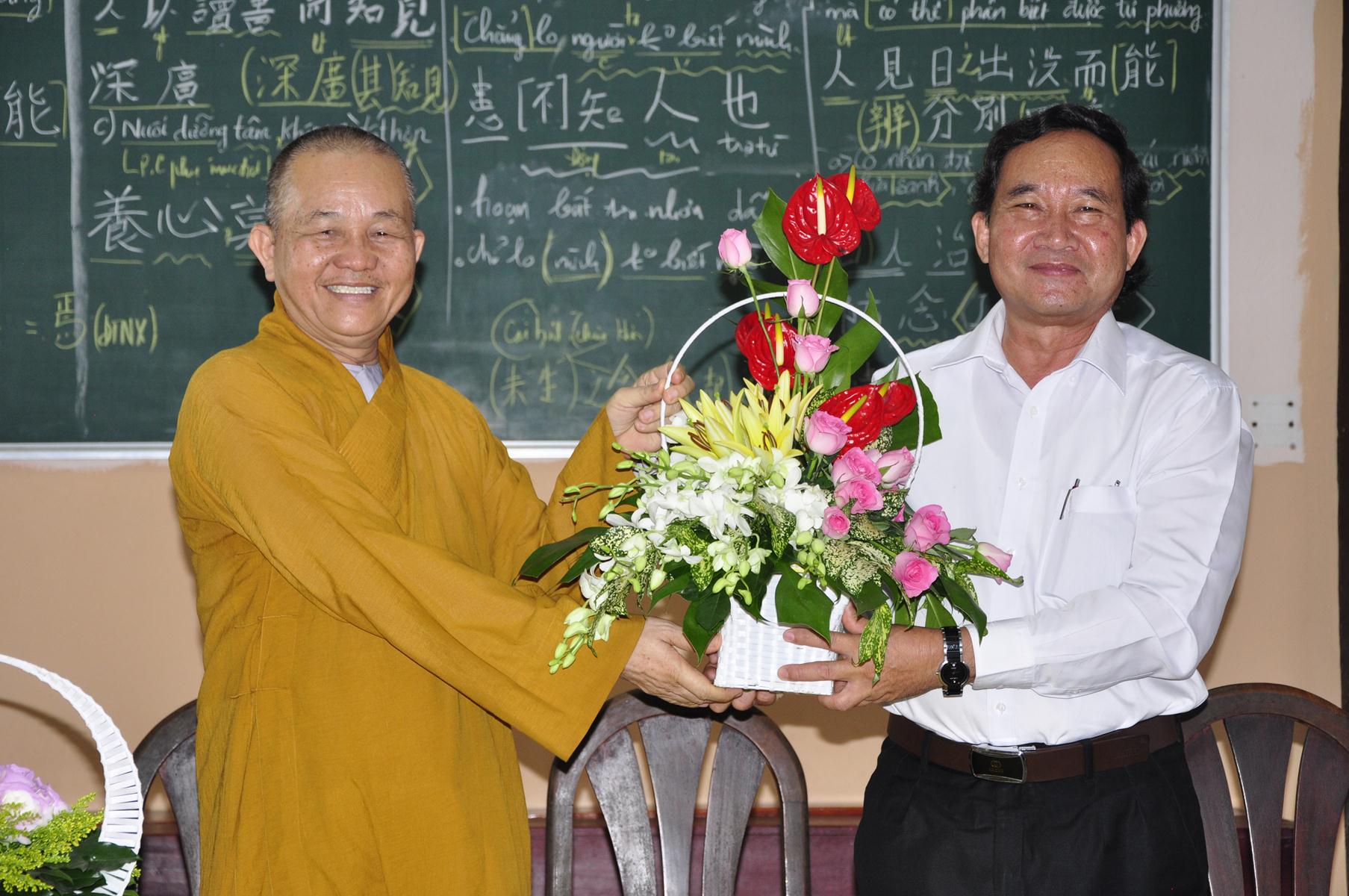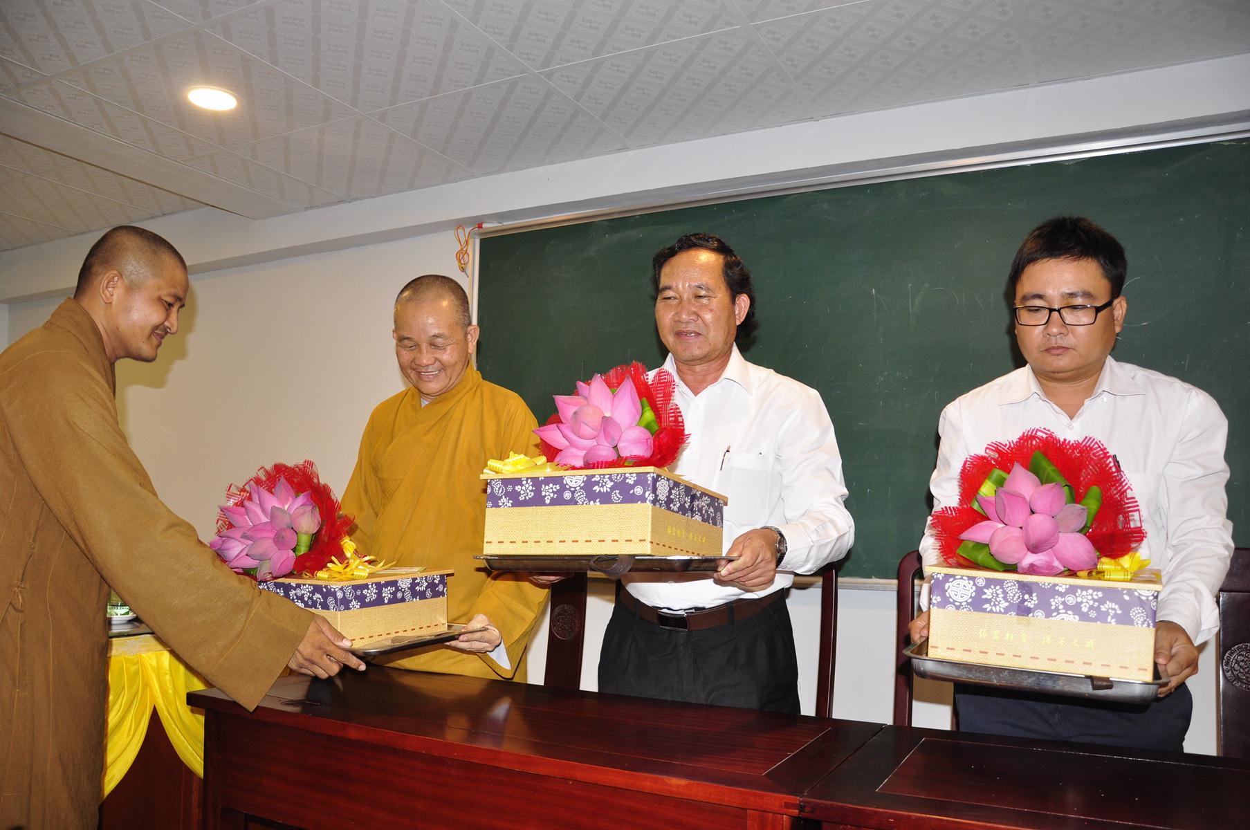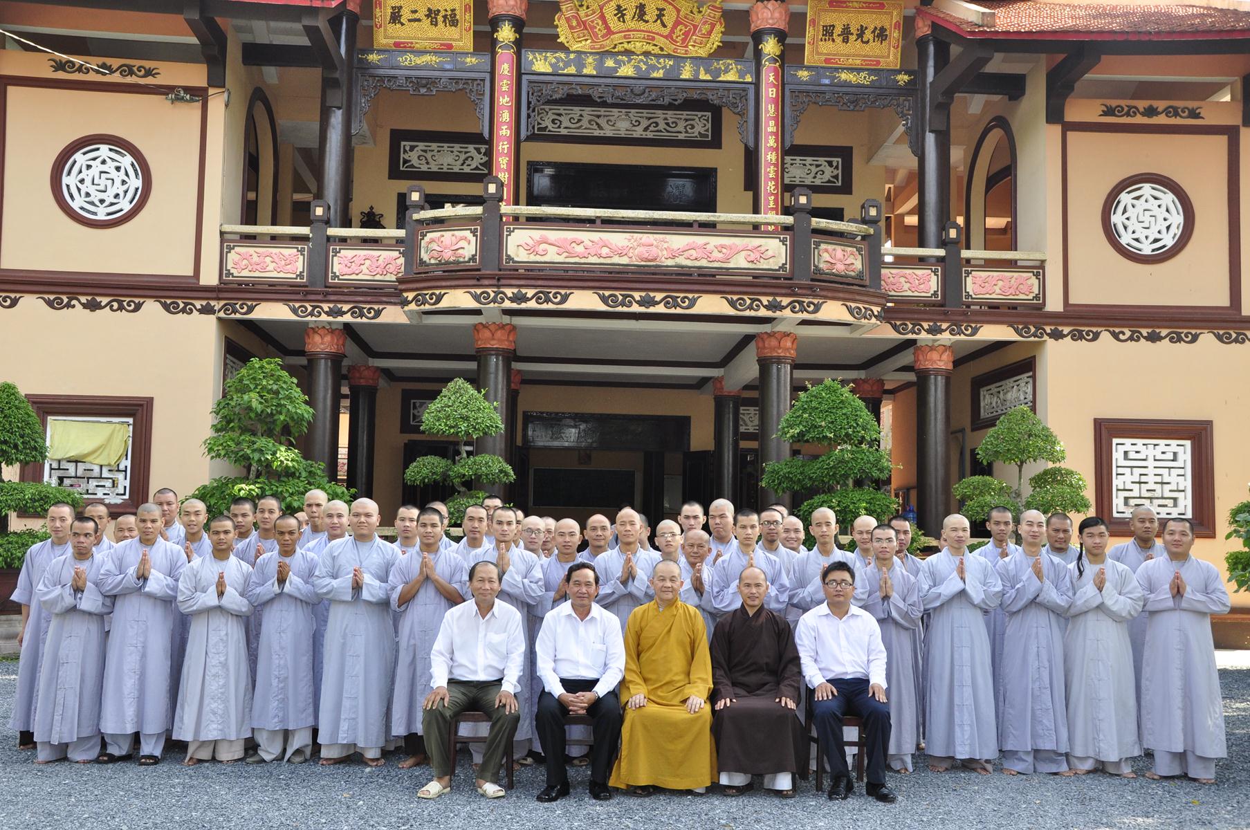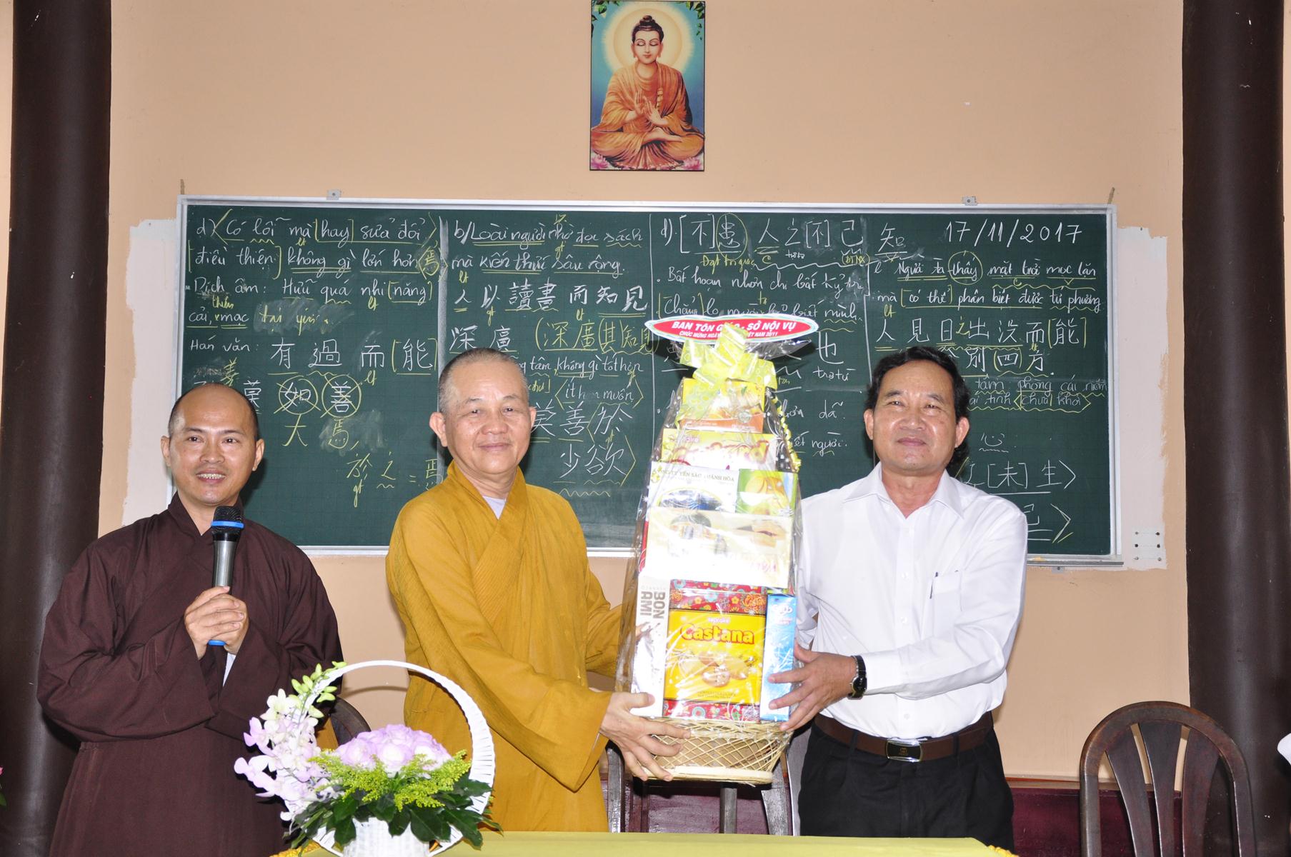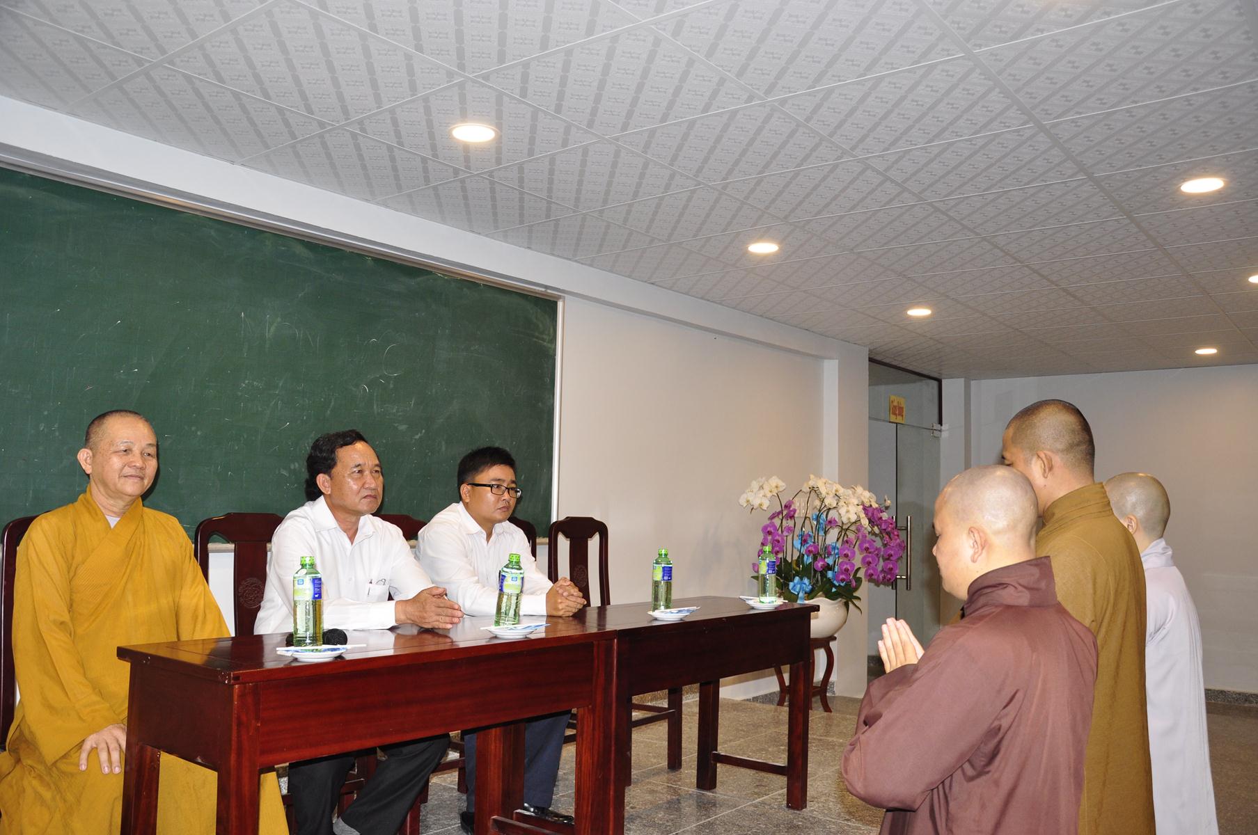 Tiếp đoàn Ban Tôn giáo tỉnh có sự hiện của HT Thích Minh Thiện: Ủy viên Hội đồng Trị sự, Phó Trưởng ban Hoằng pháp TƯ, Trưởng ban Trị sự GHPGVN tỉnh Long An, Hiệu Trưởng Trường Trung cấp Phật học Long An; TT Thích Quảng Tâm: Phó Trưởng ban Thường trực kiêm Trưởng ban TTXH GHPGVN tỉnh Long An, Chủ tịch Hội đồng Quản trị Trường Bồ đề Phương Duy; ĐĐ Thích Lệ Trí: Phó Trưởng ban kiêm Trưởng ban GDTN tỉnh, Hiệu phó Trường Trung cấp Phật học Long An; ĐĐ Thích Lệ Duyên: Chánh Thư ký BTS GHPGVN tỉnh Long An, Chủ nhiệm Lớp Sơ cấp Phật học Long An; ĐĐ Thích Trí Huệ: Thư ký Lớp Sơ cấp Phật học Long An; NS TN Diệu Phước: UV BTS GHGPVN tỉnh, Chánh văn phòng cơ sở II Trung cấp Phật học Long An; SC TN Bảo Giác: Trưởng ban Văn hóa GHPGVN tỉnh Long An; SC TN Huệ Như: Chánh văn phòng Lớp Sơ cấp Phật học Long An.