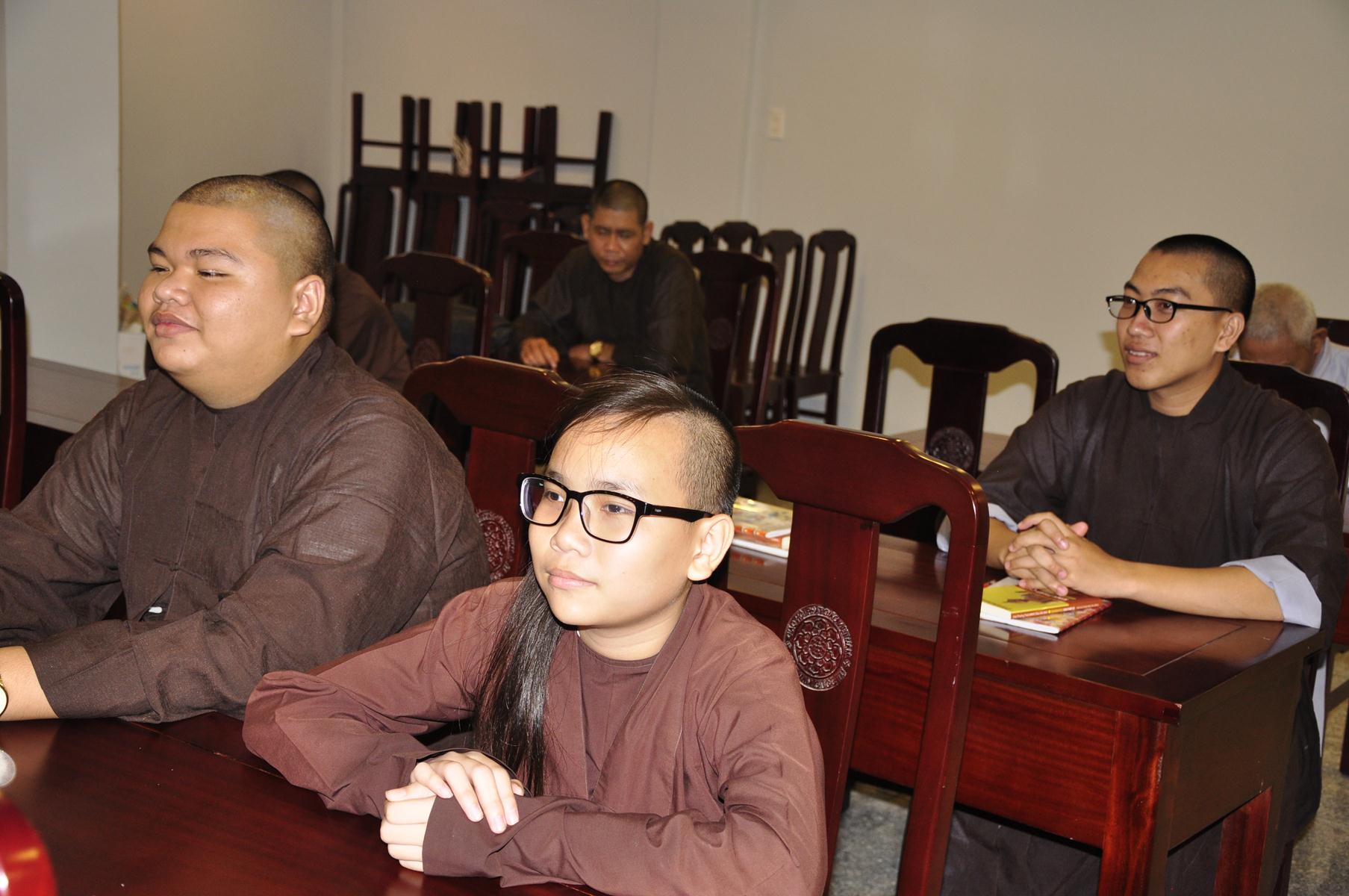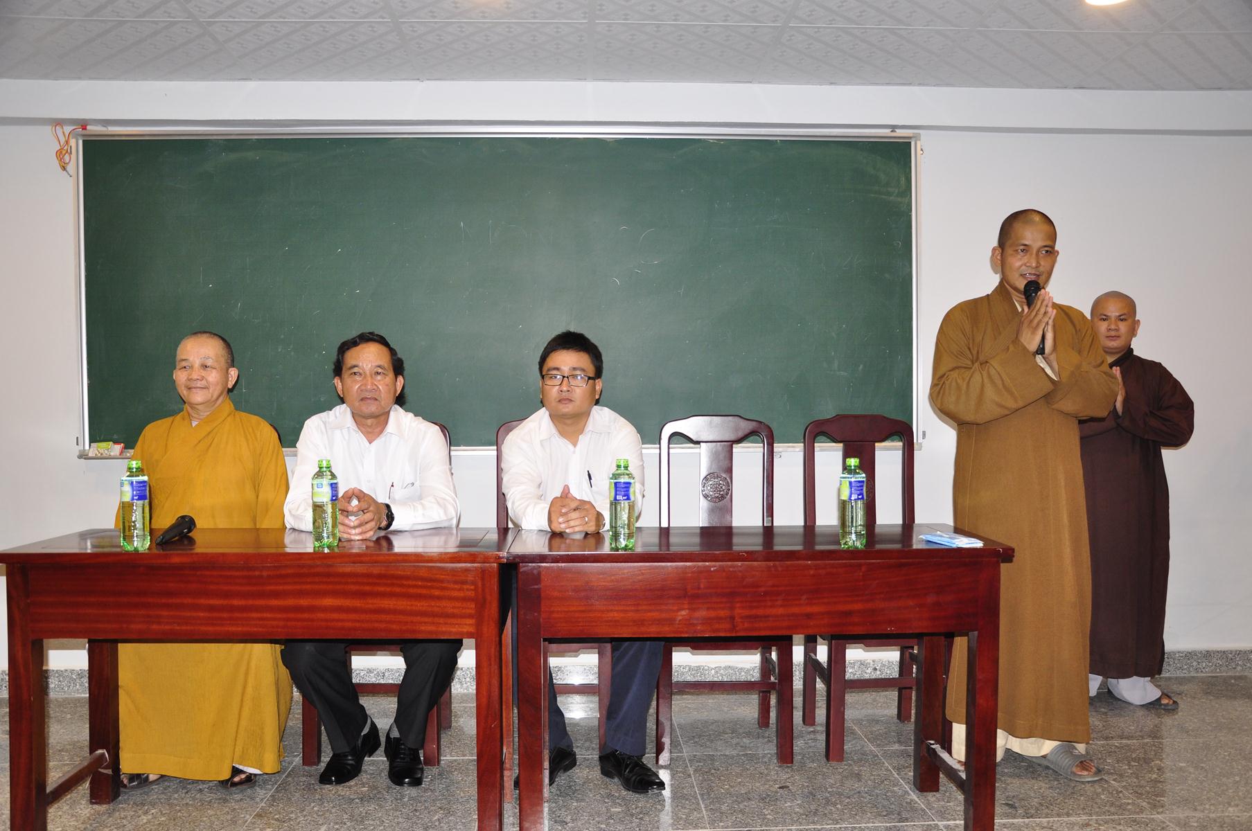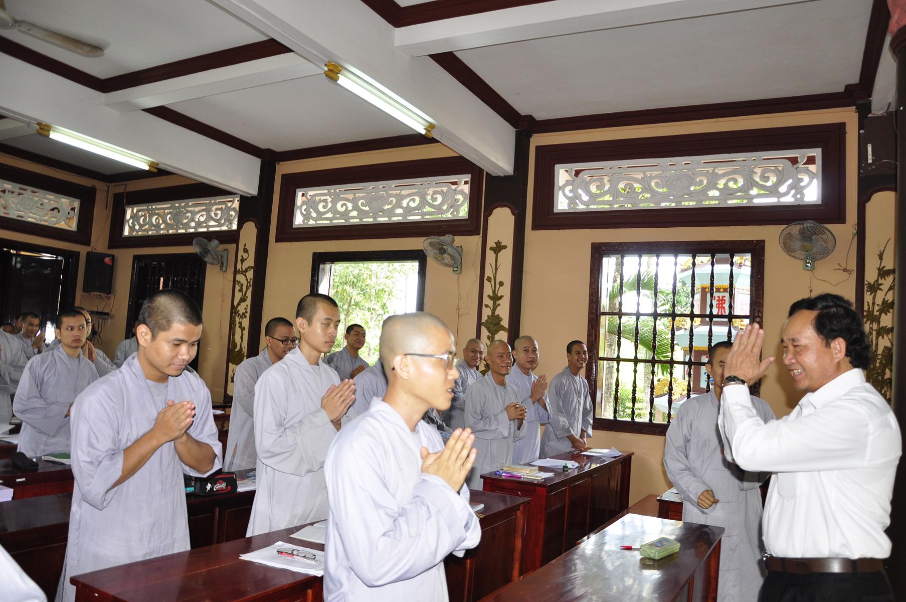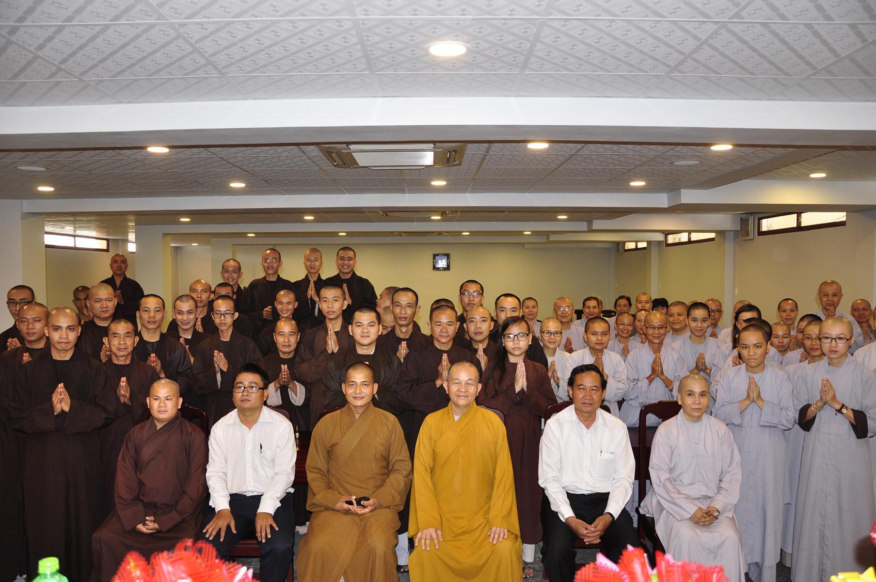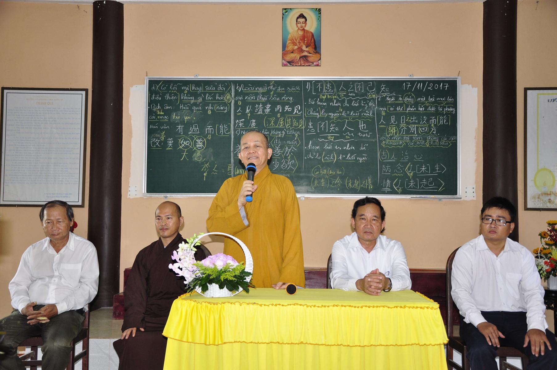 Tiếp đoàn Ban Tôn giáo tỉnh có sự hiện của HT Thích Minh Thiện: Ủy viên Hội đồng Trị sự, Phó Trưởng ban Hoằng pháp TƯ, Trưởng ban Trị sự GHPGVN tỉnh Long An, Hiệu Trưởng Trường Trung cấp Phật học Long An; TT Thích Quảng Tâm: Phó Trưởng ban Thường trực kiêm Trưởng ban TTXH GHPGVN tỉnh Long An, Chủ tịch Hội đồng Quản trị Trường Bồ đề Phương Duy; ĐĐ Thích Lệ Trí: Phó Trưởng ban kiêm Trưởng ban GDTN tỉnh, Hiệu phó Trường Trung cấp Phật học Long An; ĐĐ Thích Lệ Duyên: Chánh Thư ký BTS GHPGVN tỉnh Long An, Chủ nhiệm Lớp Sơ cấp Phật học Long An; ĐĐ Thích Trí Huệ: Thư ký Lớp Sơ cấp Phật học Long An; NS TN Diệu Phước: UV BTS GHGPVN tỉnh, Chánh văn phòng cơ sở II Trung cấp Phật học Long An; SC TN Bảo Giác: Trưởng ban Văn hóa GHPGVN tỉnh Long An; SC TN Huệ Như: Chánh văn phòng Lớp Sơ cấp Phật học Long An.