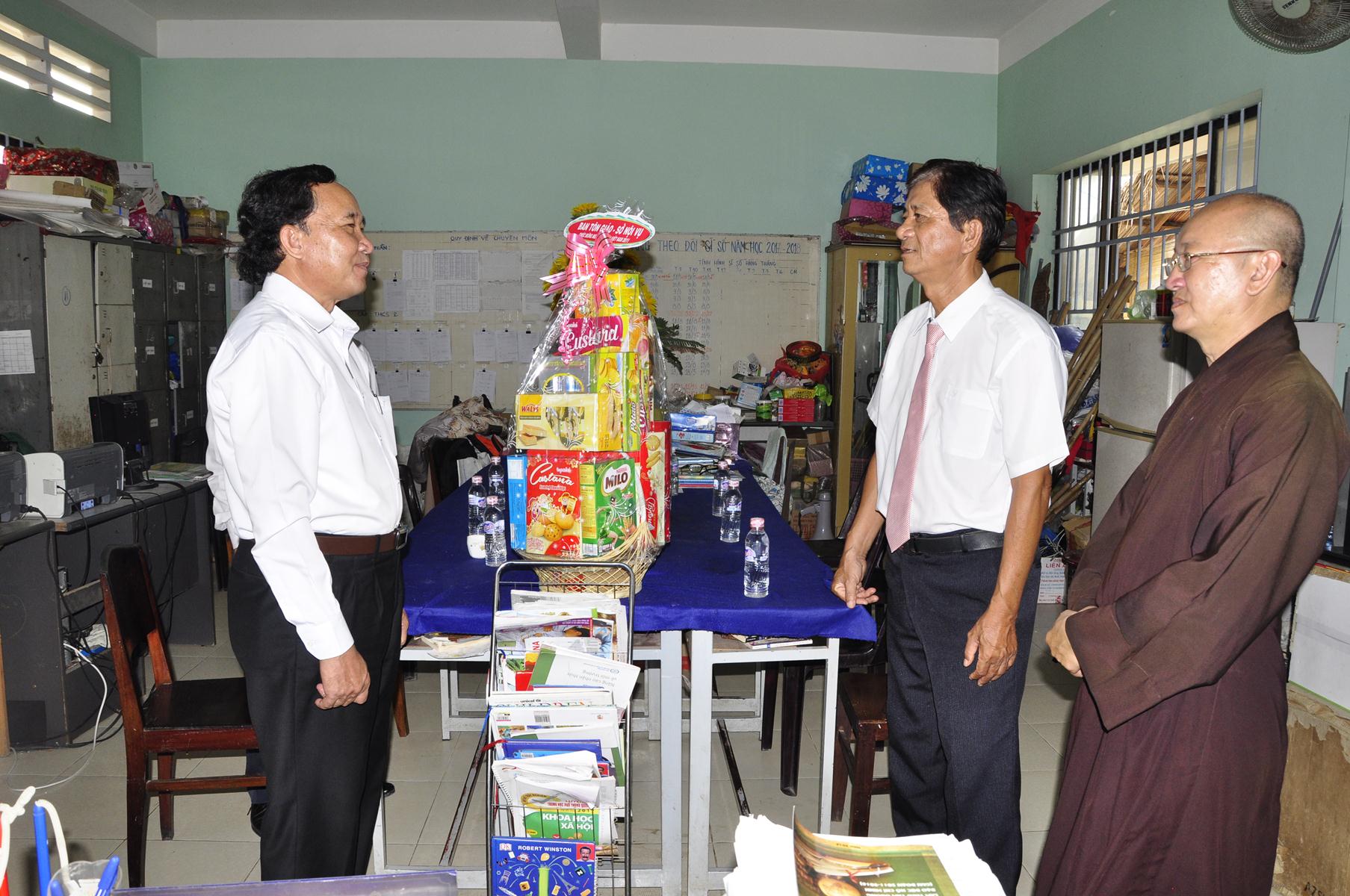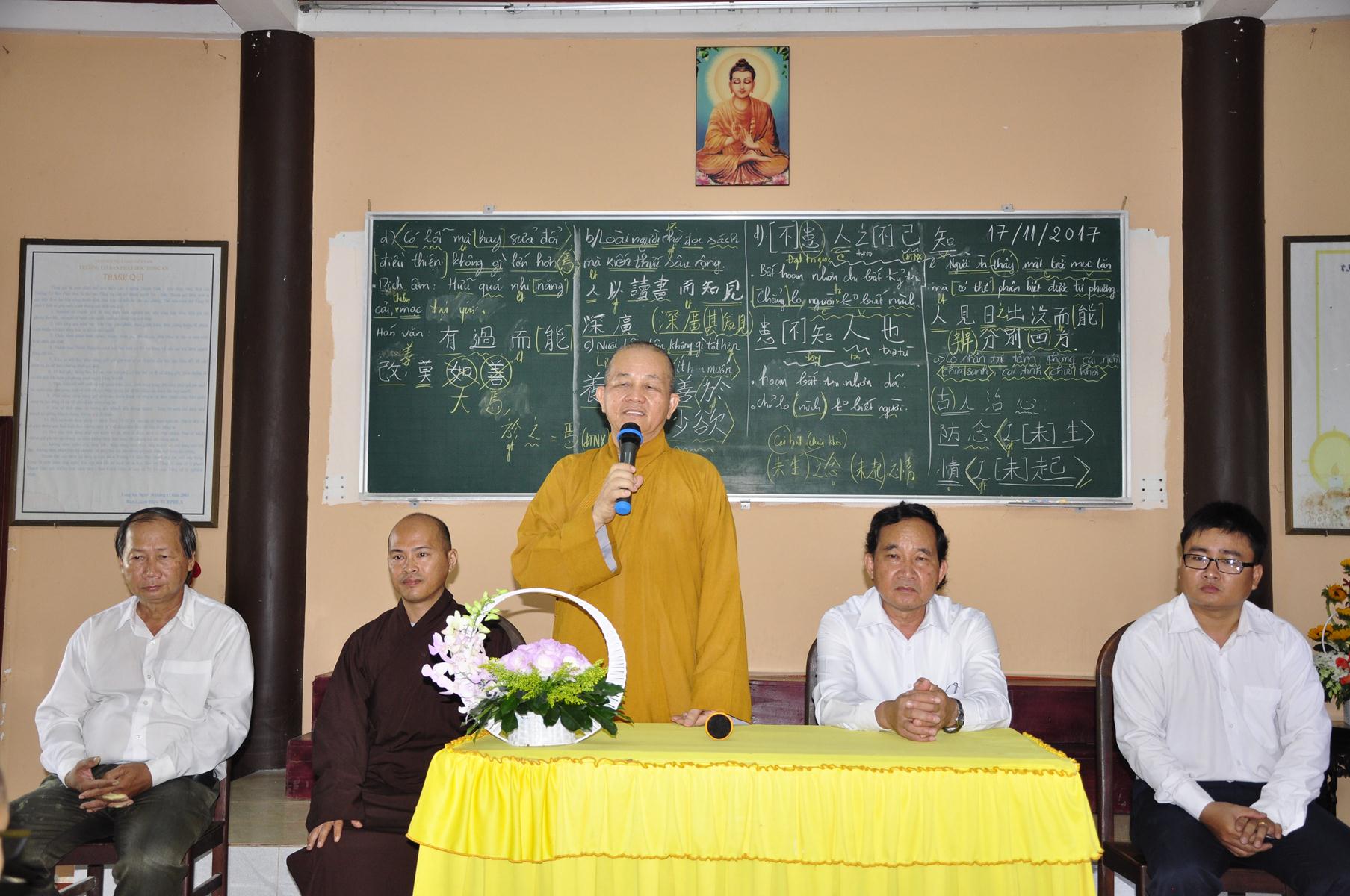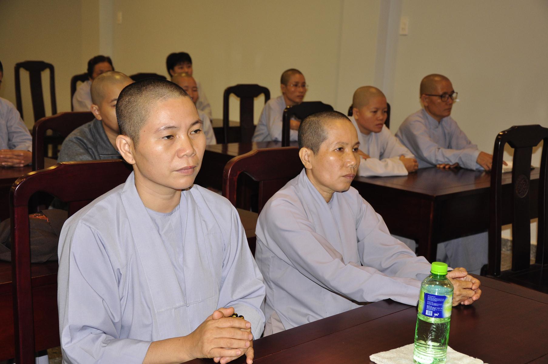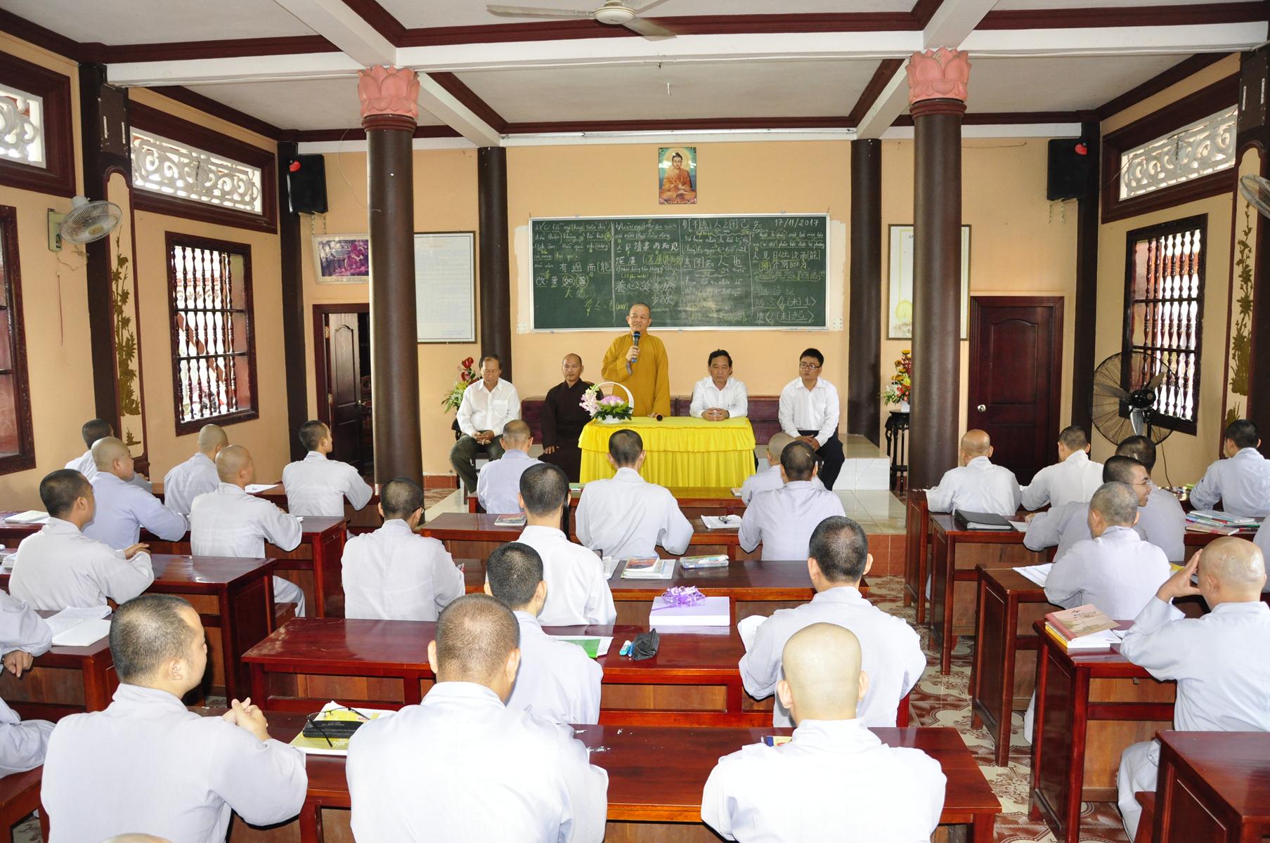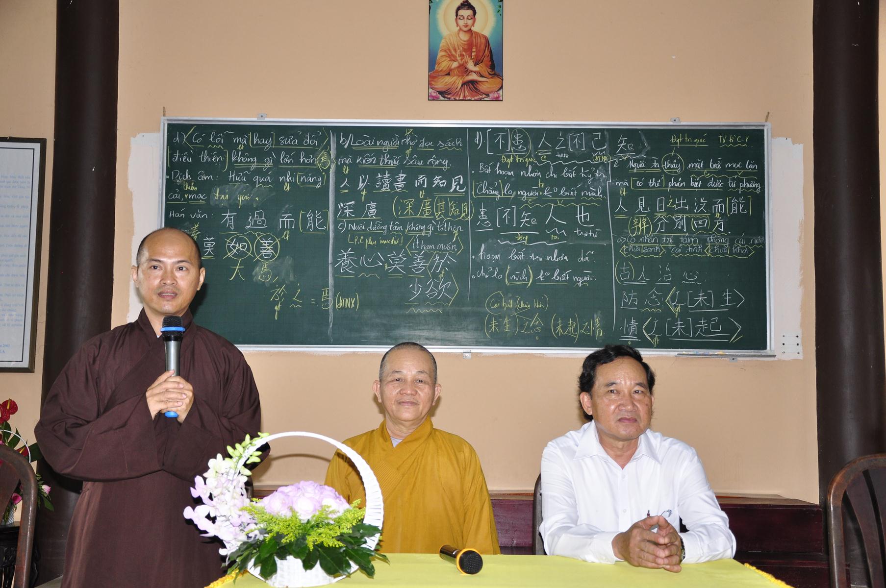 Tiếp đoàn Ban Tôn giáo tỉnh có sự hiện của HT Thích Minh Thiện: Ủy viên Hội đồng Trị sự, Phó Trưởng ban Hoằng pháp TƯ, Trưởng ban Trị sự GHPGVN tỉnh Long An, Hiệu Trưởng Trường Trung cấp Phật học Long An; TT Thích Quảng Tâm: Phó Trưởng ban Thường trực kiêm Trưởng ban TTXH GHPGVN tỉnh Long An, Chủ tịch Hội đồng Quản trị Trường Bồ đề Phương Duy; ĐĐ Thích Lệ Trí: Phó Trưởng ban kiêm Trưởng ban GDTN tỉnh, Hiệu phó Trường Trung cấp Phật học Long An; ĐĐ Thích Lệ Duyên: Chánh Thư ký BTS GHPGVN tỉnh Long An, Chủ nhiệm Lớp Sơ cấp Phật học Long An; ĐĐ Thích Trí Huệ: Thư ký Lớp Sơ cấp Phật học Long An; NS TN Diệu Phước: UV BTS GHGPVN tỉnh, Chánh văn phòng cơ sở II Trung cấp Phật học Long An; SC TN Bảo Giác: Trưởng ban Văn hóa GHPGVN tỉnh Long An; SC TN Huệ Như: Chánh văn phòng Lớp Sơ cấp Phật học Long An.