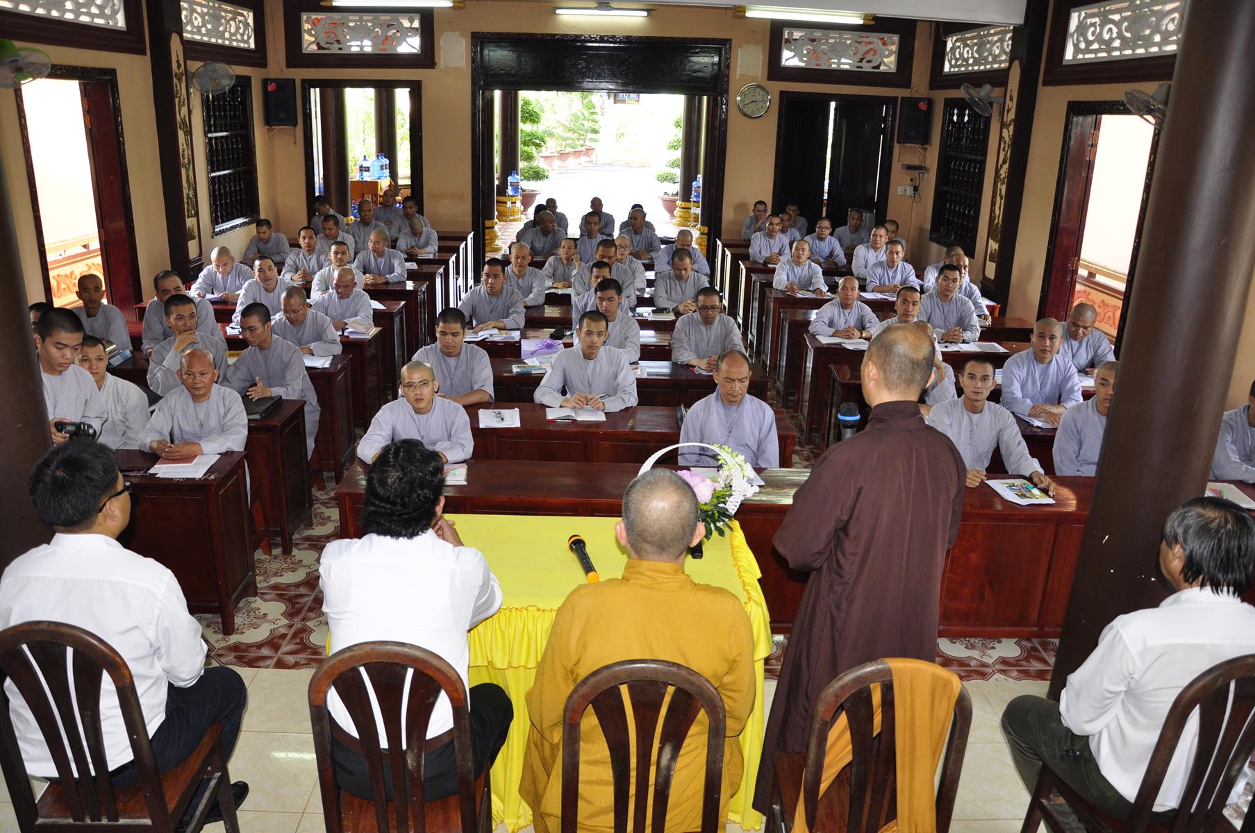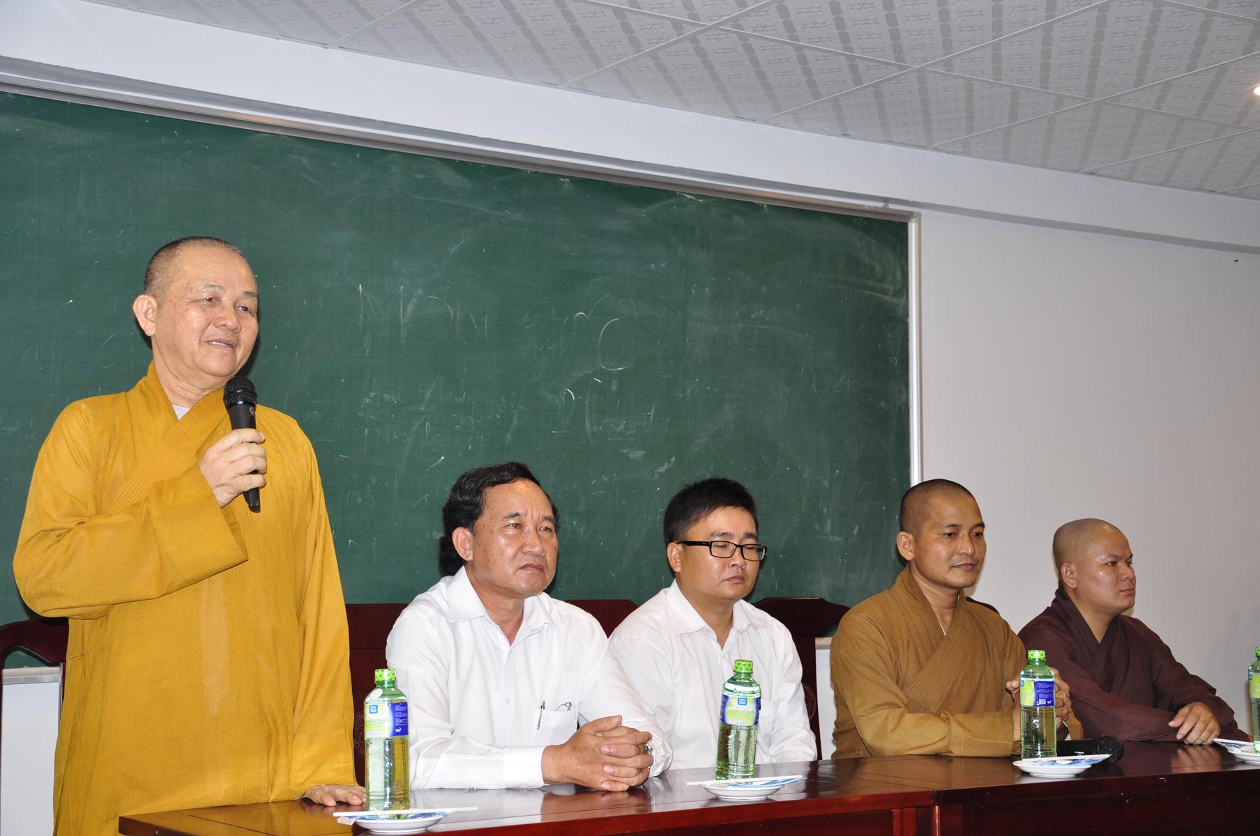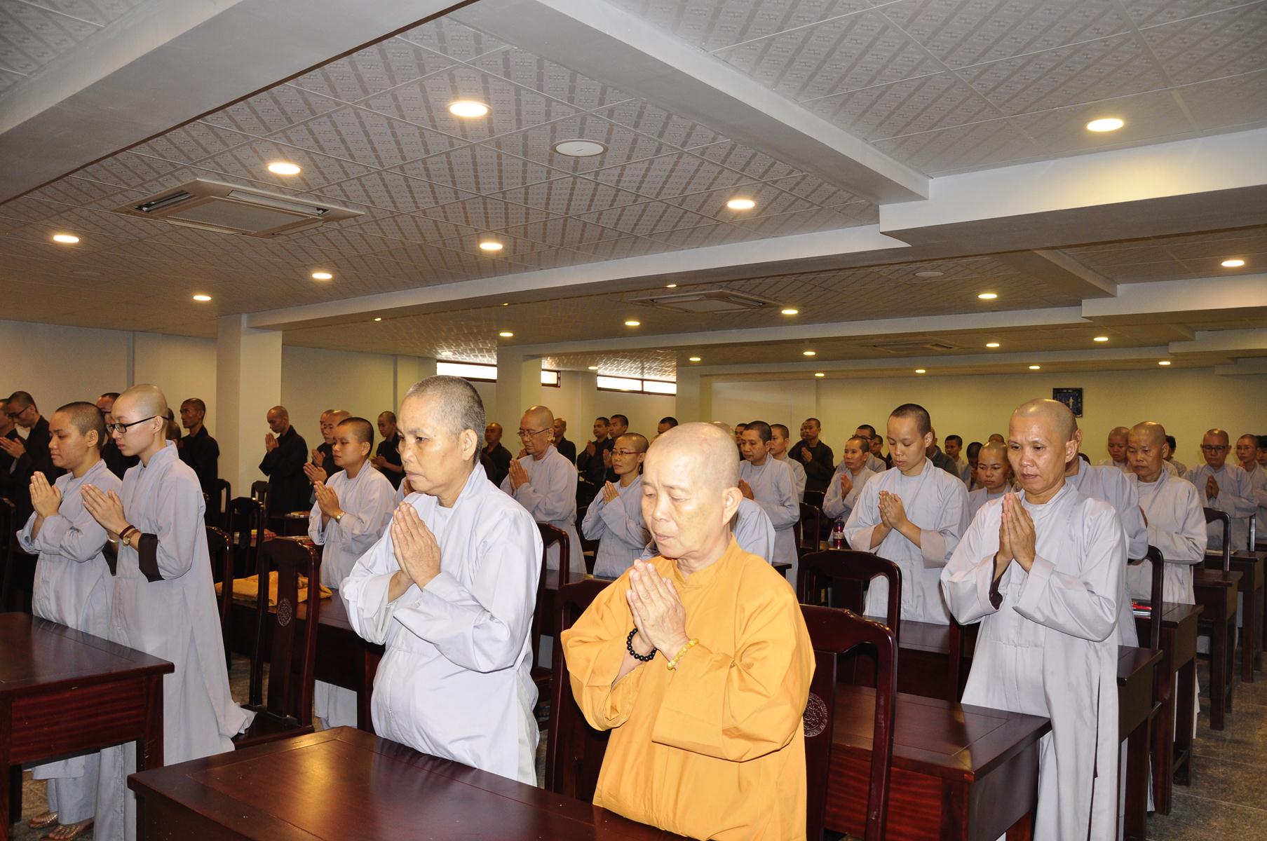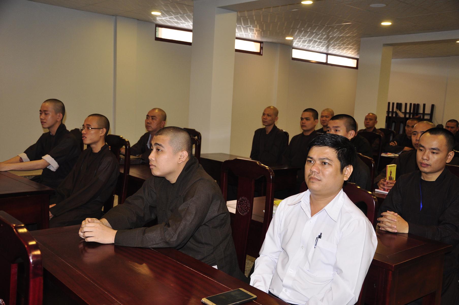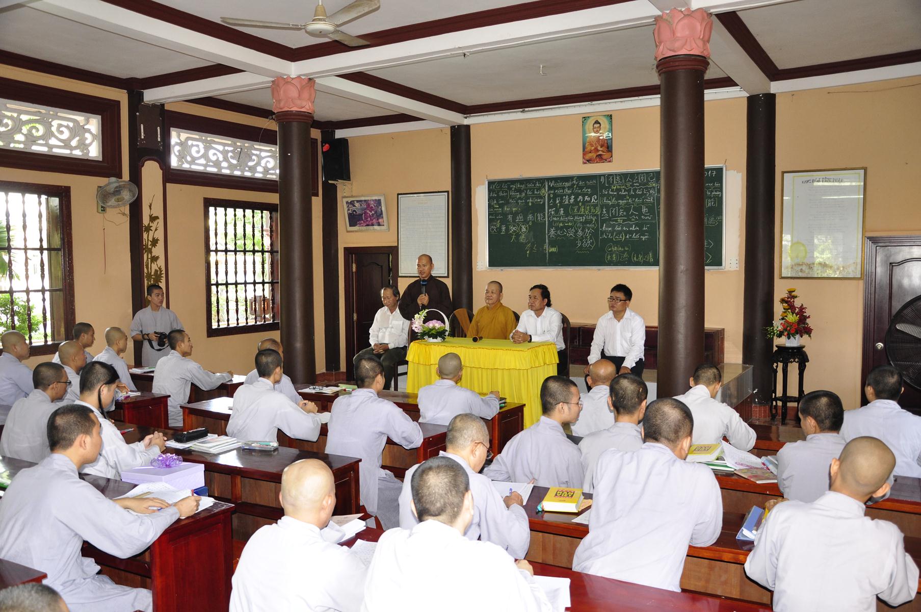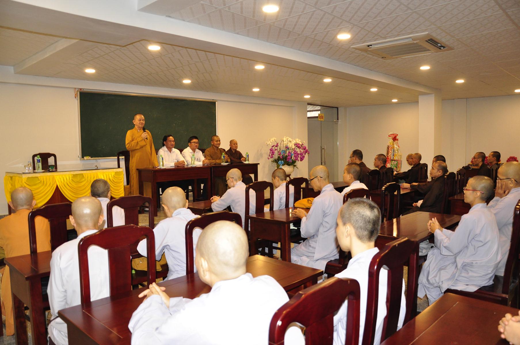 Tiếp đoàn Ban Tôn giáo tỉnh có sự hiện của HT Thích Minh Thiện: Ủy viên Hội đồng Trị sự, Phó Trưởng ban Hoằng pháp TƯ, Trưởng ban Trị sự GHPGVN tỉnh Long An, Hiệu Trưởng Trường Trung cấp Phật học Long An; TT Thích Quảng Tâm: Phó Trưởng ban Thường trực kiêm Trưởng ban TTXH GHPGVN tỉnh Long An, Chủ tịch Hội đồng Quản trị Trường Bồ đề Phương Duy; ĐĐ Thích Lệ Trí: Phó Trưởng ban kiêm Trưởng ban GDTN tỉnh, Hiệu phó Trường Trung cấp Phật học Long An; ĐĐ Thích Lệ Duyên: Chánh Thư ký BTS GHPGVN tỉnh Long An, Chủ nhiệm Lớp Sơ cấp Phật học Long An; ĐĐ Thích Trí Huệ: Thư ký Lớp Sơ cấp Phật học Long An; NS TN Diệu Phước: UV BTS GHGPVN tỉnh, Chánh văn phòng cơ sở II Trung cấp Phật học Long An; SC TN Bảo Giác: Trưởng ban Văn hóa GHPGVN tỉnh Long An; SC TN Huệ Như: Chánh văn phòng Lớp Sơ cấp Phật học Long An.