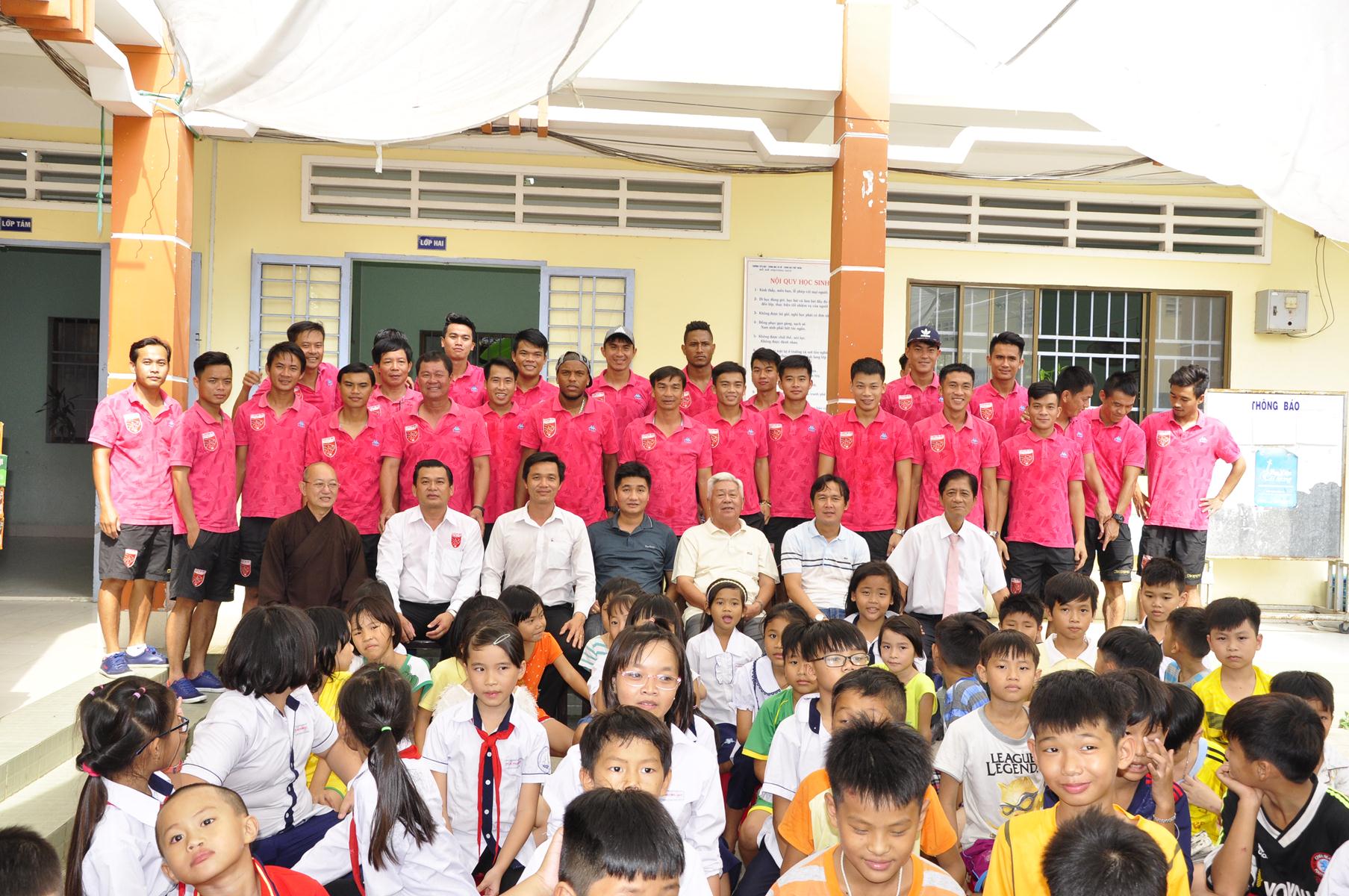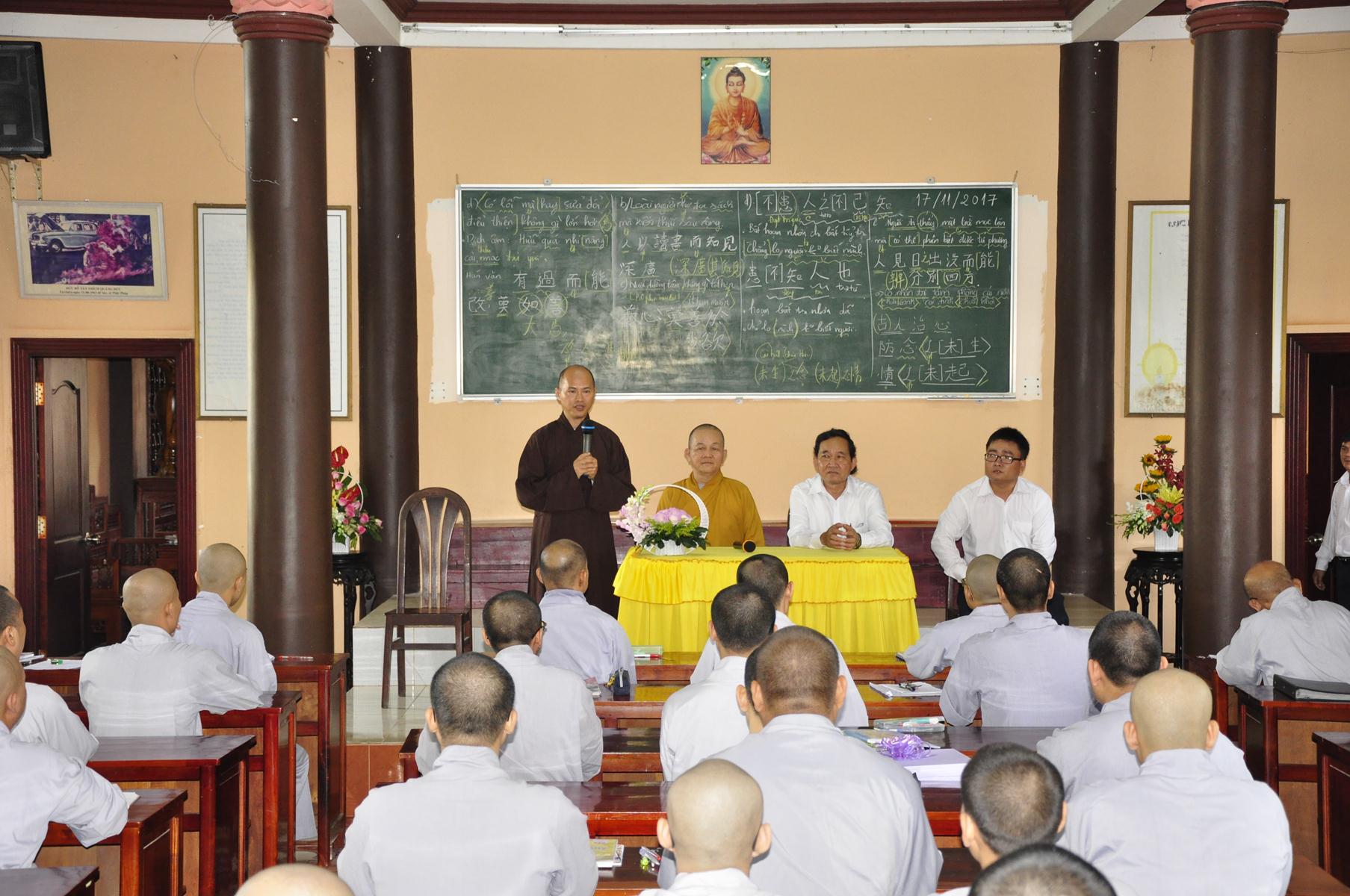 Sau đó, phái đoàn viếng thăm lớp Sơ cấp Phật học Long An tại chùa Pháp Minh (huyện Đức Hòa). Lớp Sơ cấp Phật học Long An, khóa VI, được khai giảng vào ngày 01/10/2017, hiện có 81 Tăng Ni theo học học kỳ I, năm thứ I. Tại đây, sau lời phát biểu chúc mừng nhân ngày nhà giáo Việt Nam 20.11 của ông Trưởng ban Tôn giáo tỉnh, HT Thích Minh Thiện, thay mặt Ban Giám hiệu cảm tạ tri ân phái đoàn. Tiếp theo, thay mặt Ban Chủ nhiệm và Tăng Ni Sơ cấp Phật học Long An, khóa VI, Đại đức Thích Lệ Duyên dâng lời tri ân và tặng quà nhân ngày Nhà giáo 20.11 đến Hòa thượng Hiệu trưởng và quý lãnh đạo Ban Tôn giáo tỉnh Long An.