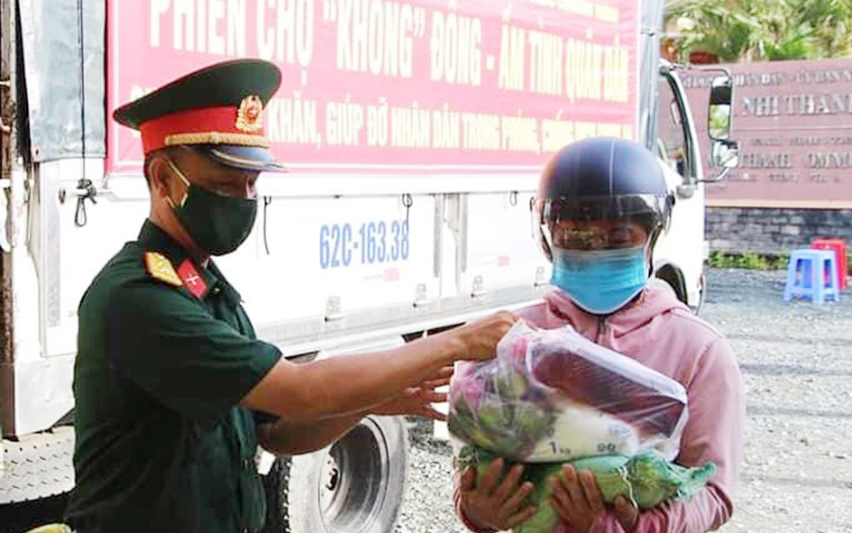 Được biết, tổ chức Phiên chợ “Không” đồng – Ấm tình Quân Dân lưu động đến địa bàn các xã gặp khó khăn để trực tiếp hỗ trợ 400 phần quà gồm: nhu yếu phẩm, gạo, trứng nước tương, nước mắm, đường, bột ngọt, rau, củ, quả… cho Nhân dân trong các ấp, khu phố, khu dân cư, nhà trọ, các khu vực phong tỏa, công nhân… gặp khó khăn do dịch Covid-19.  Địa điểm tổ chức Phiên chợ “Không” đồng và số lượng quà tại  Trụ sở UBND xã Nhị Thành, 200 phần quà; Khu vực phong tỏa (ấp 1, 2) xã Mỹ Thạnh, 100 phần quà; Trụ sở UBND xã Mỹ Lạc 100 phần quà.
