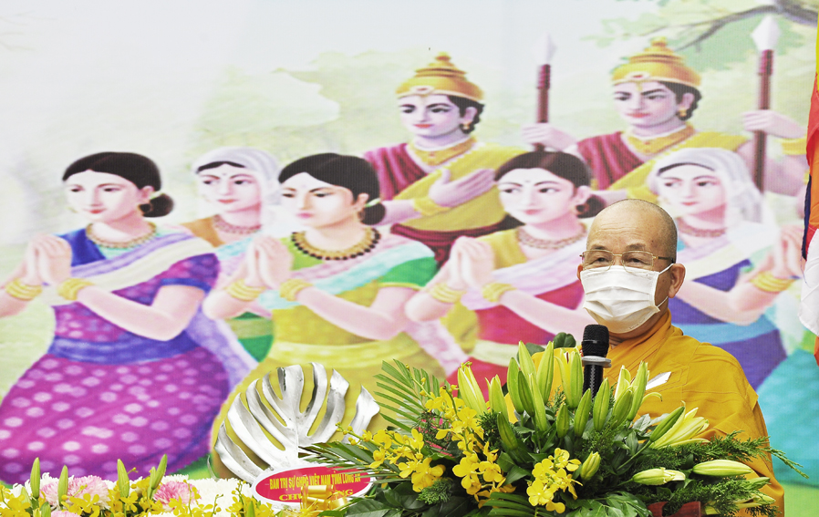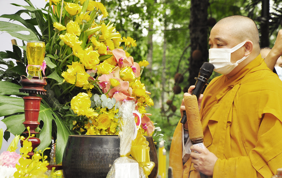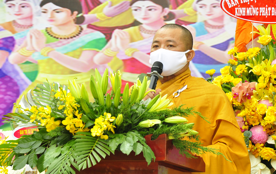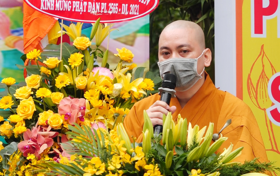Đại đức Thích Tắc Nguyên – Trưởng BTS. GHPGVN huyện Cần Giuộc đọc diễn văn chúc mừng Phật đản năm 2021 của Đức Hòa thượng Thích Thiện Nhơn- Chủ tịch Hội đồng Trị sự Trung ương GHPGVN.