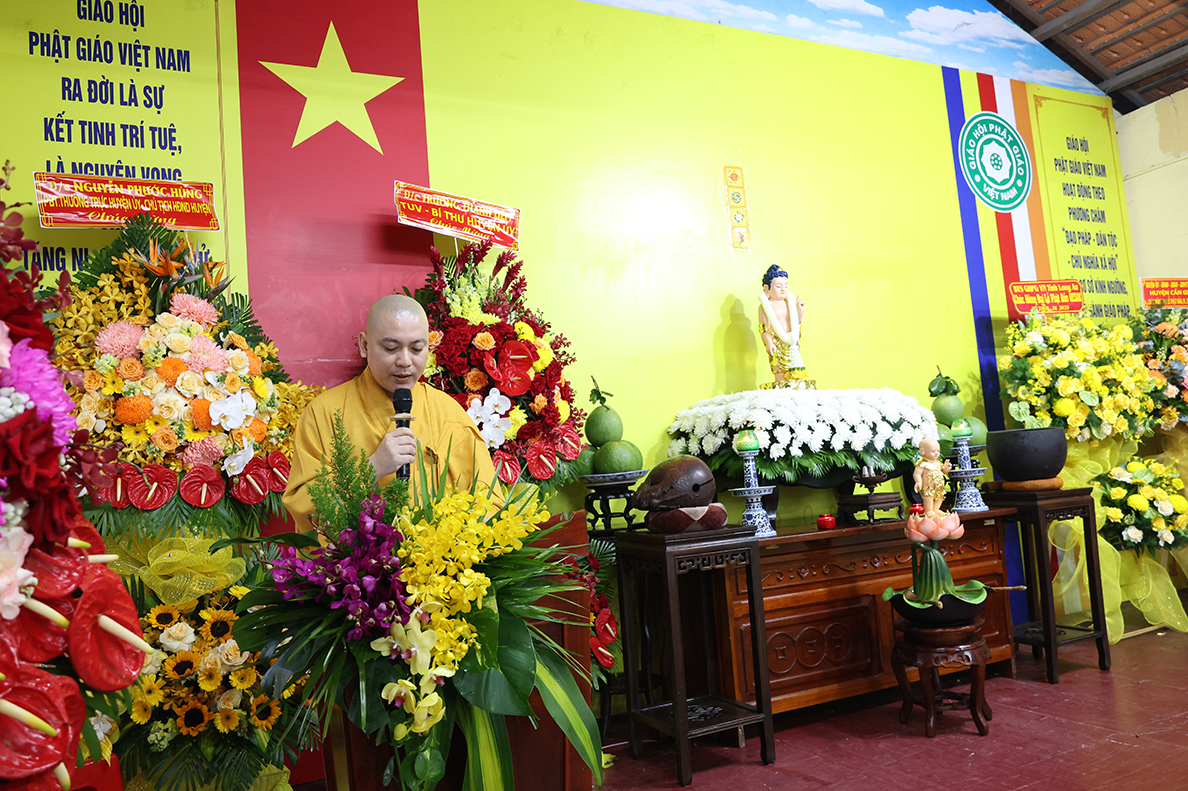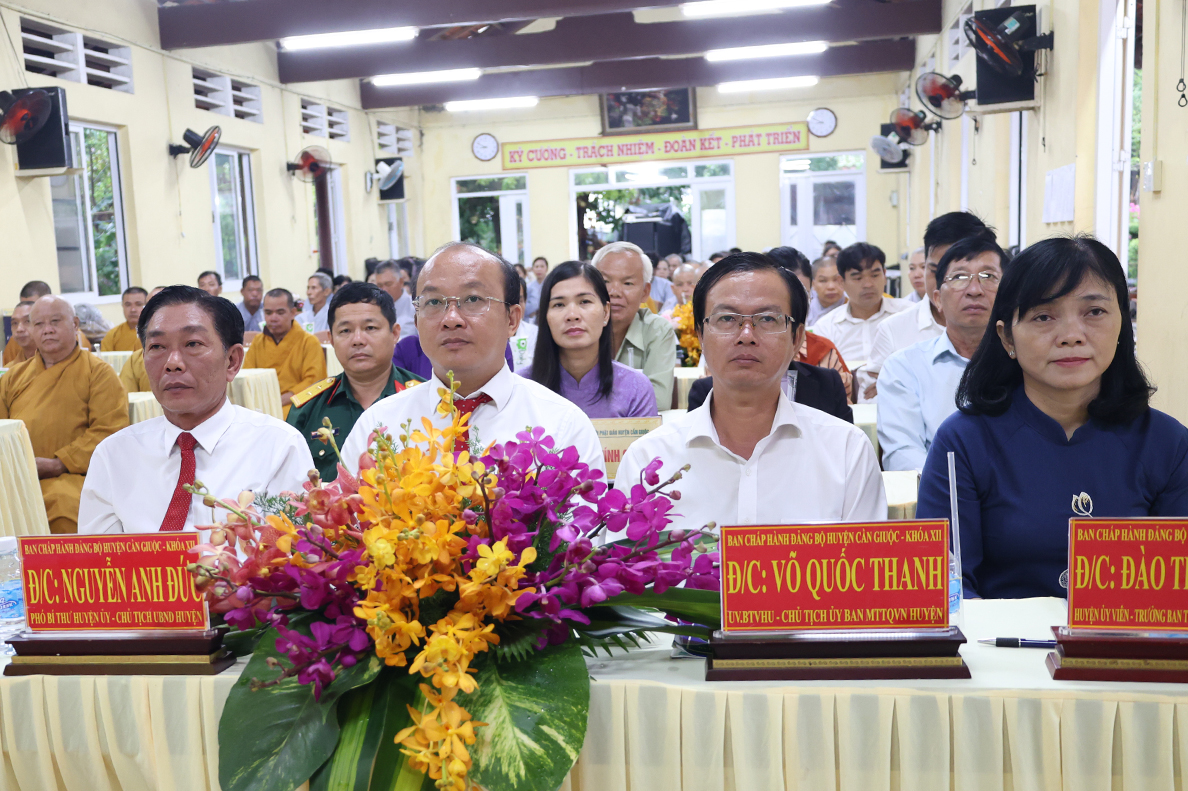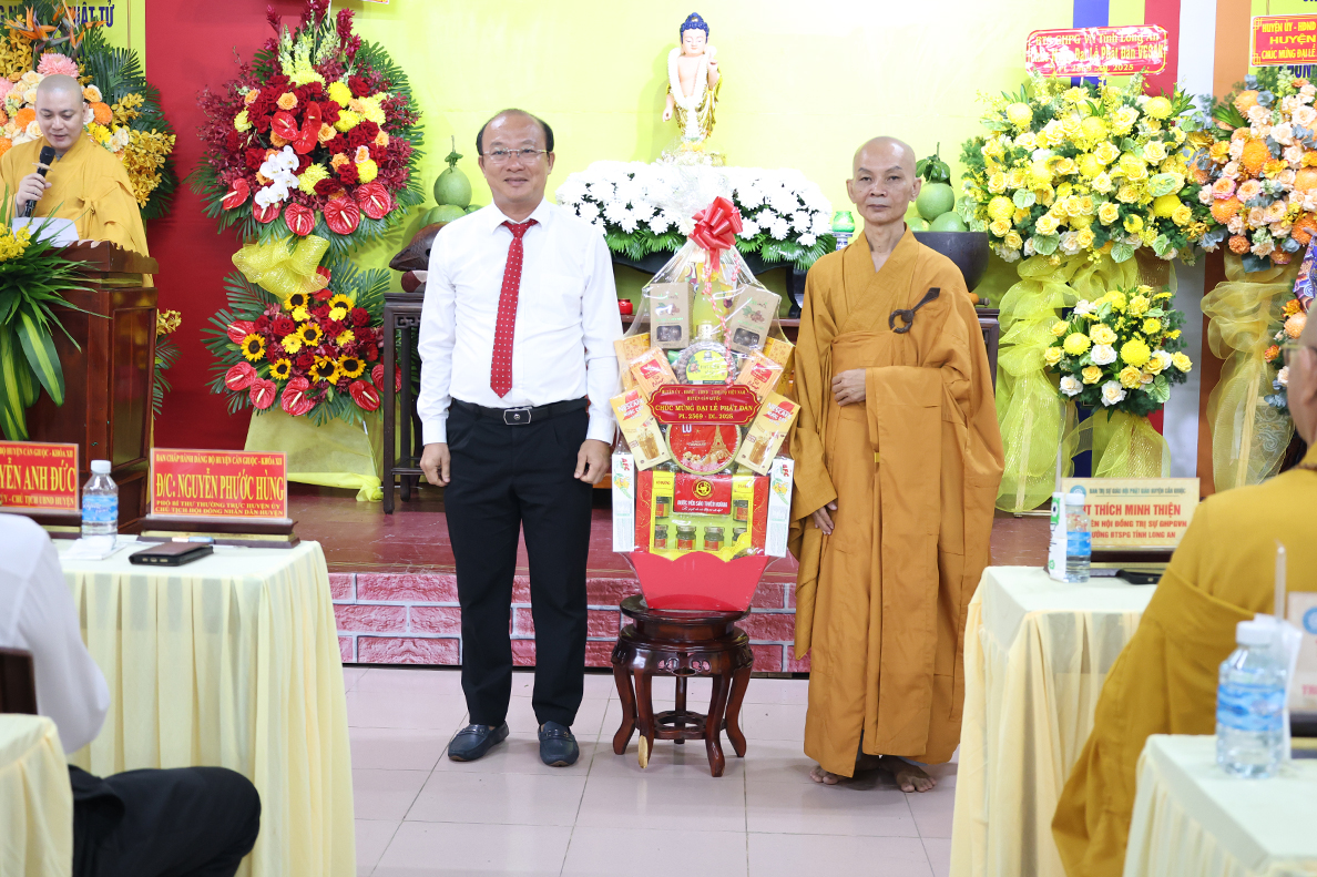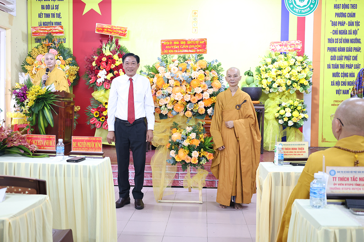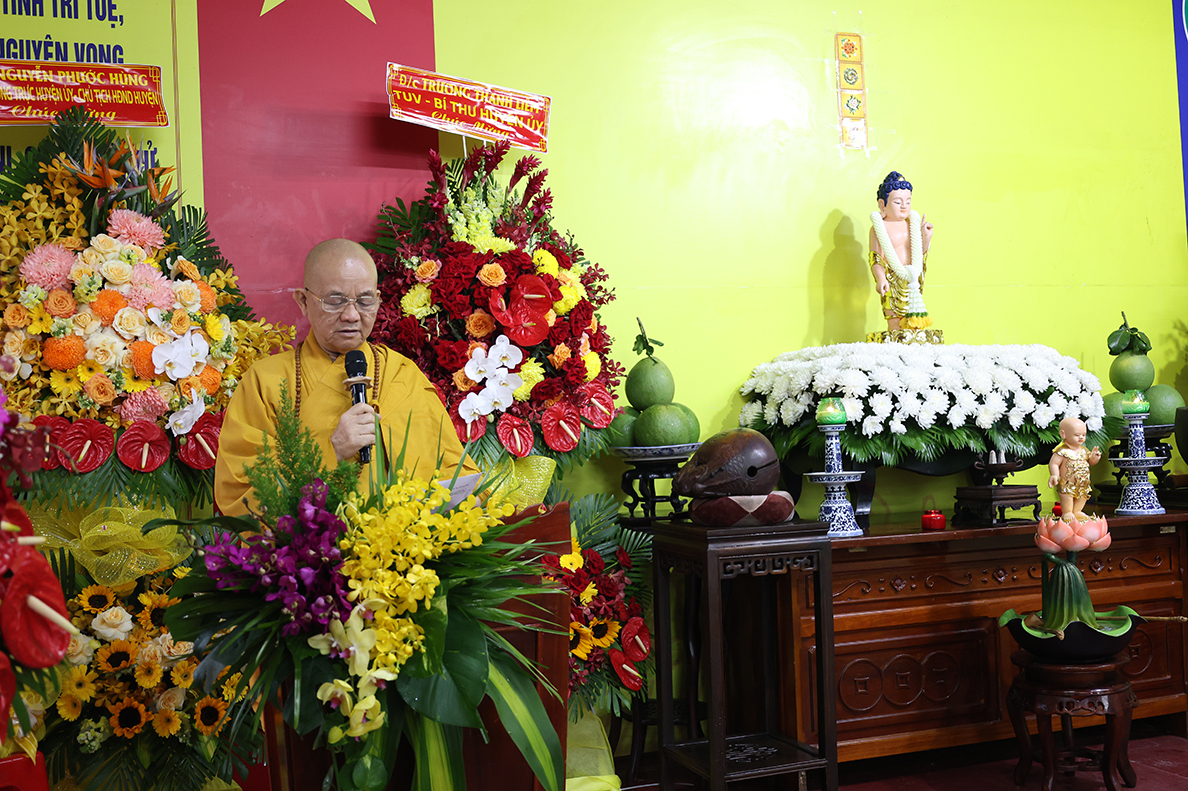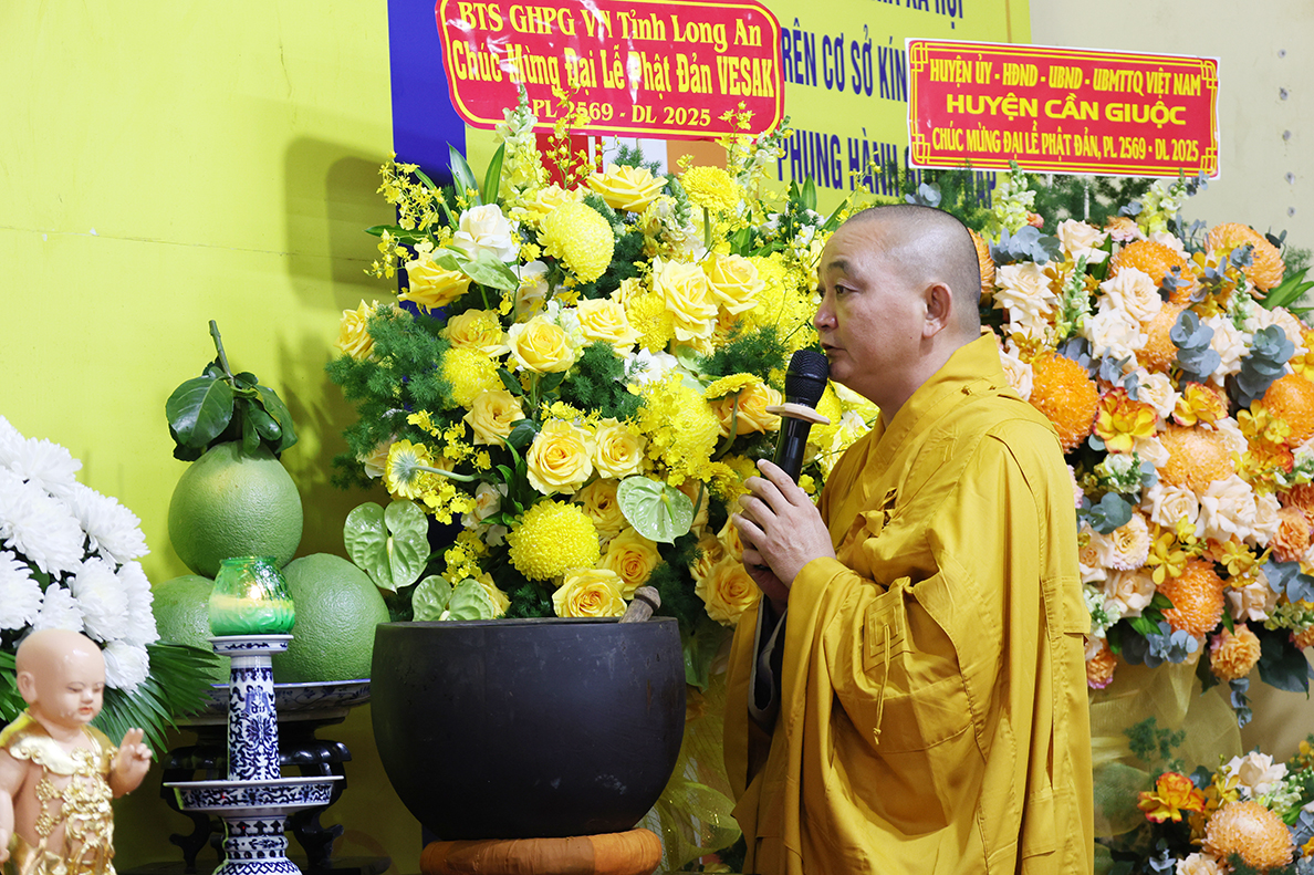 Đại diện chính quyền, ông Nguyễn Phước Hùng, Phó Bí thư Thường trực Huyện ủy, đã phát biểu chúc mừng GHPGVN huyện Cần Giuộc nhân dịp Đại lễ Vesak. Ông bày tỏ sự trân trọng đối với những đóng góp tích cực của Giáo hội trong các hoạt động từ thiện, giáo dục và xây dựng đời sống văn hóa tại địa phương. Ông cũng mong muốn GHPGVN tiếp tục đồng hành cùng chính quyền trong các phong trào thi đua yêu nước, góp phần xây dựng huyện Cần Giuộc ngày càng văn minh, giàu đẹp.