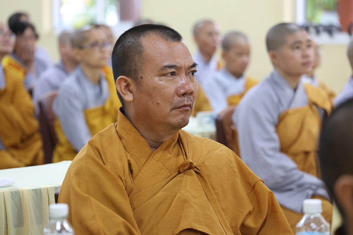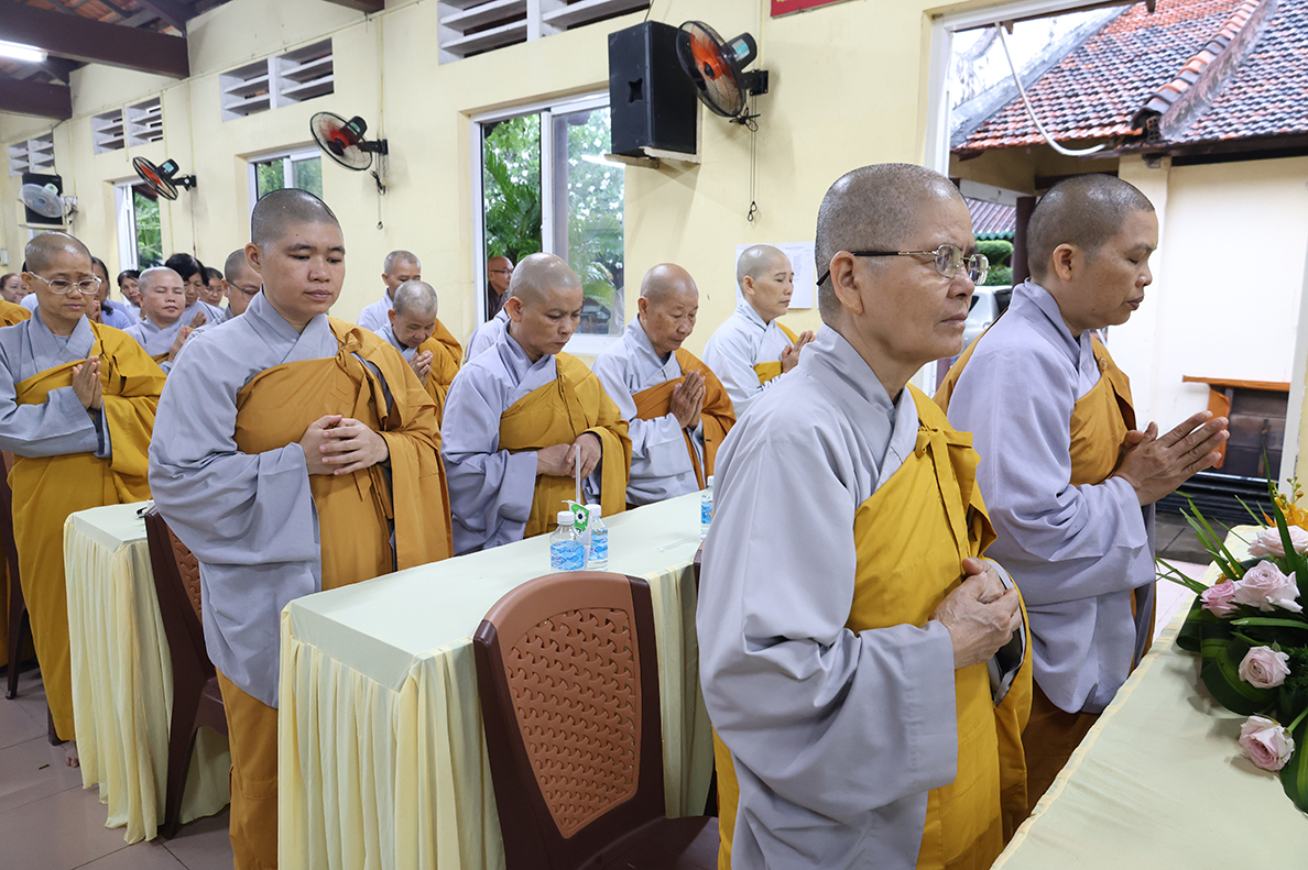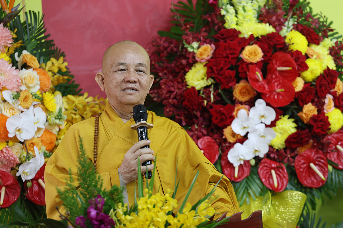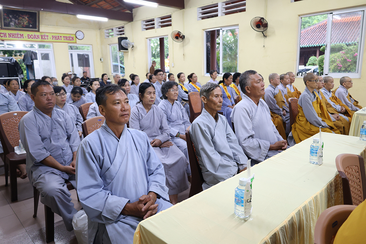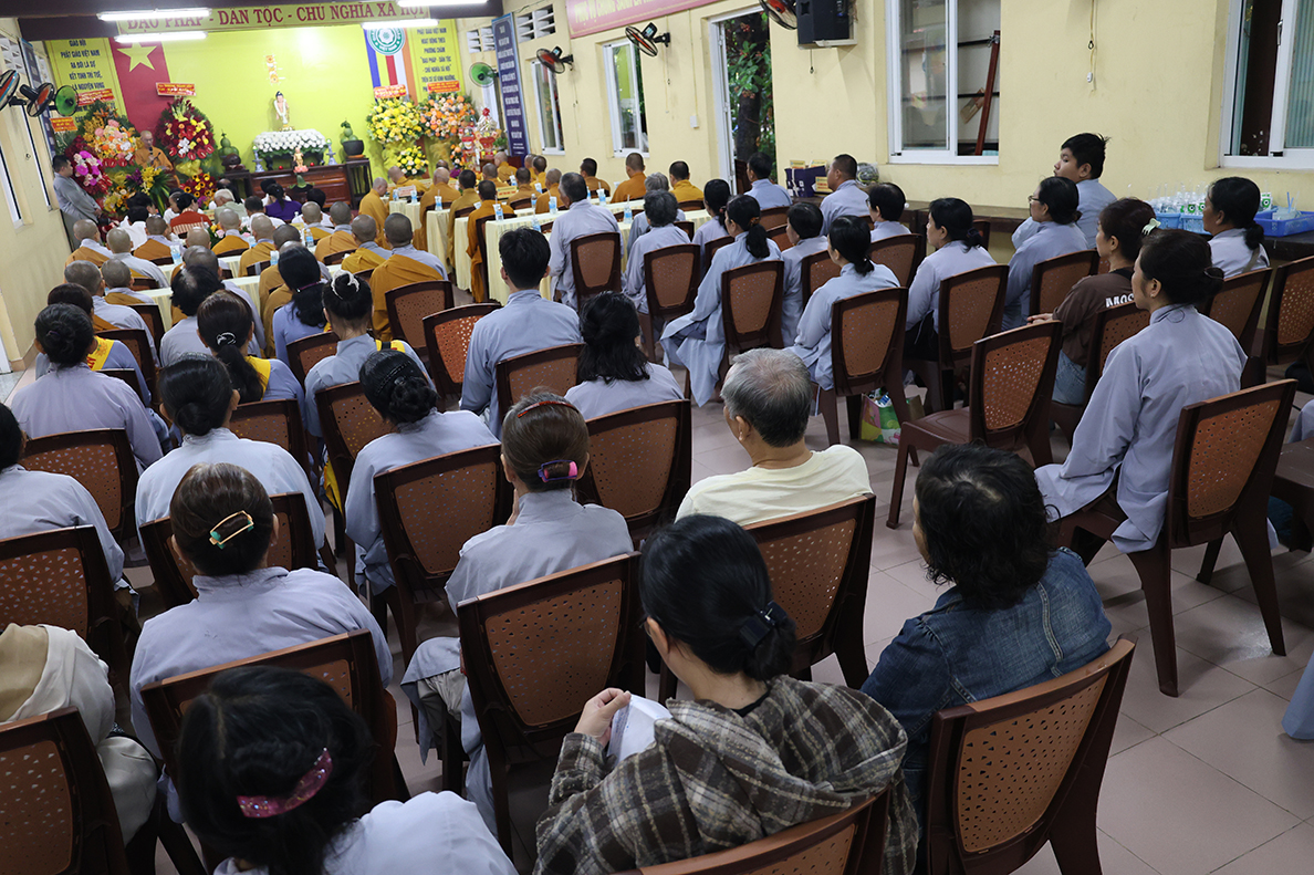 Quý vị tham gia buổi lễ được vinh dự lắng nghe lời đạo từ đầy ý nghĩa của HT. Thích Minh Thiện. Ngài đã khái quát lại sự thành công rực rỡ của Đại lễ Vesak Liên Hiệp Quốc được tổ chức tại Học viện Phật giáo Việt Nam TP.HCM vừa qua, với sự tham dự của đại diện 80 quốc gia và 5 vùng lãnh thổ, khẳng định vị thế của Phật giáo Việt Nam trên trường quốc tế. Hòa thượng đặc biệt tán thán công đức của việc đảnh lễ Xá lợi đức Phật tại chùa Thanh Tâm, một sự kiện linh thiêng, mang lại phước lành cho Phật tử và cộng đồng. Ngài cũng bày tỏ lòng tri ân đối với trái tim bất diệt của Bồ tát Thích Quảng Đức, biểu tượng của tinh thần từ bi và dấn thân vì đạo pháp và dân tộc, khơi dậy niềm tự hào và cảm hứng cho hội chúng. Hòa thượng kêu gọi Tăng Ni và Phật tử tiếp tục thực hành giáo pháp, lan tỏa lòng từ bi và trí tuệ, góp phần xây dựng một thế giới hòa bình, an lạc.