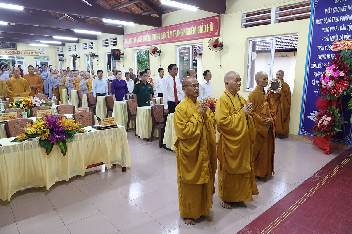 Mở đầu chương trình, sau phần nghi lễ chào Quốc ca, Đạo ca và phút mặc niệm tưởng nhớ các anh hùng liệt sĩ cùng chư Thánh tử đạo, HT. Thích Minh Thiện đã trang trọng tuyên đọc Thông điệp Đại lễ Vesak Liên Hiệp Quốc 2025 của Đức Pháp chủ GHPGVN. Thông điệp nhấn mạnh ý nghĩa của ngày Vesak – kỷ niệm ngày Đức Phật đản sinh, thành đạo và nhập niết bàn – như một cơ hội để ôn lại giáo pháp từ bi, trí tuệ và hòa bình của Ngài. Đức Pháp chủ kêu gọi Tăng Ni, Phật tử và nhân dân trên toàn thế giới cùng chung tay xây dựng một xã hội an lạc, đoàn kết, góp phần giải quyết các thách thức toàn cầu như xung đột, biến đổi khí hậu và bất bình đẳng.