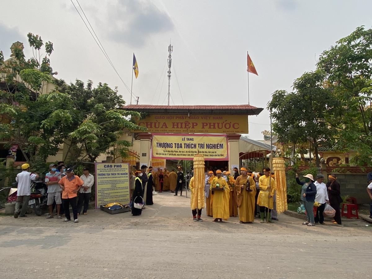 Theo cáo phó, THƯỢNG TOẠ THÍCH TRÍ NGHIÊM – HÚY NHỰT THÀNH, Trụ trì Chùa Hiệp Phước, khu vực 2, thị trấn Hiệp Hoà, huyện Đức Hòa, tỉnh Long An.