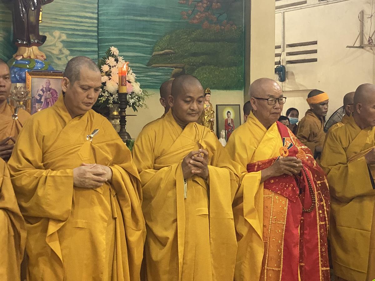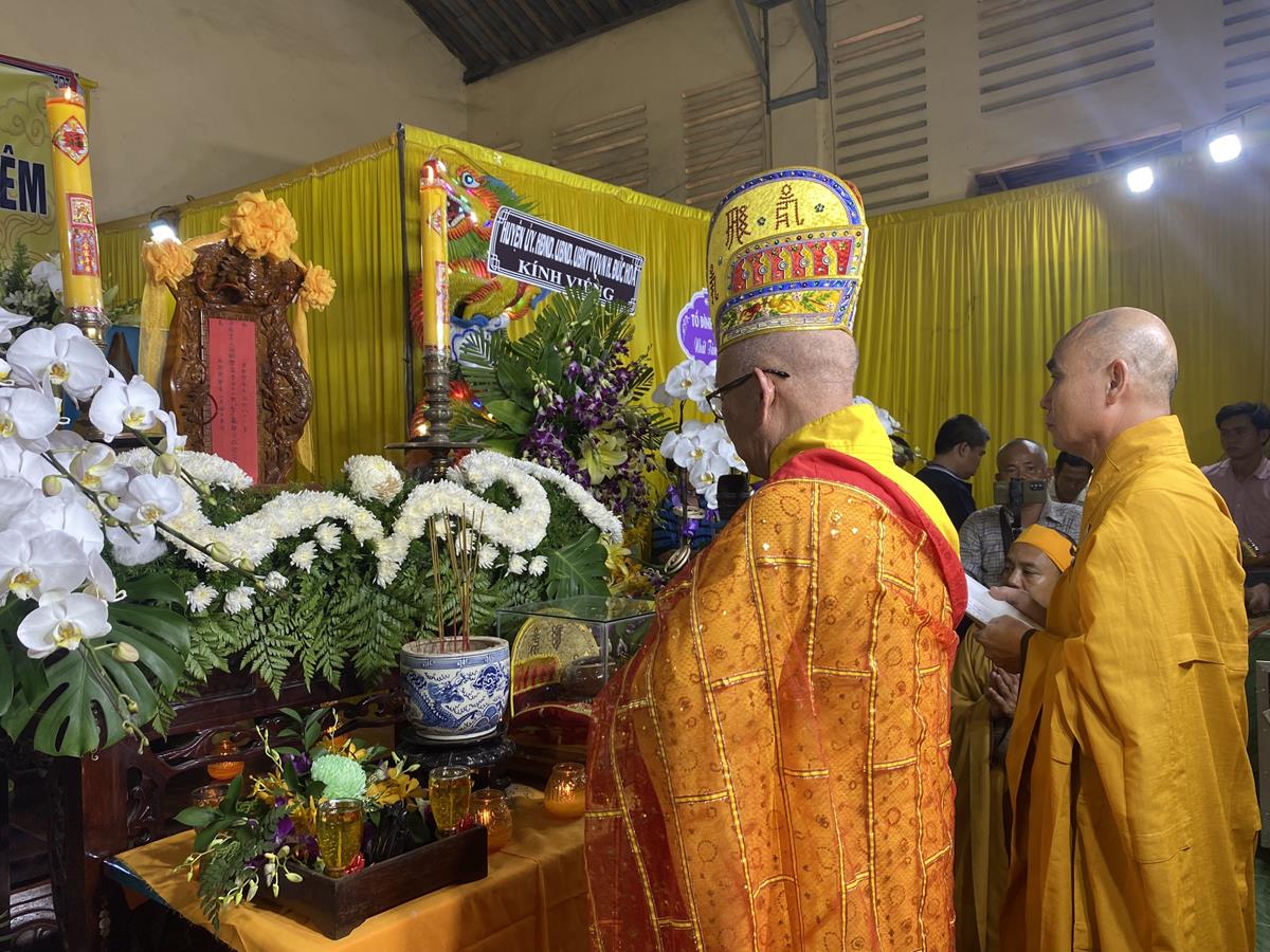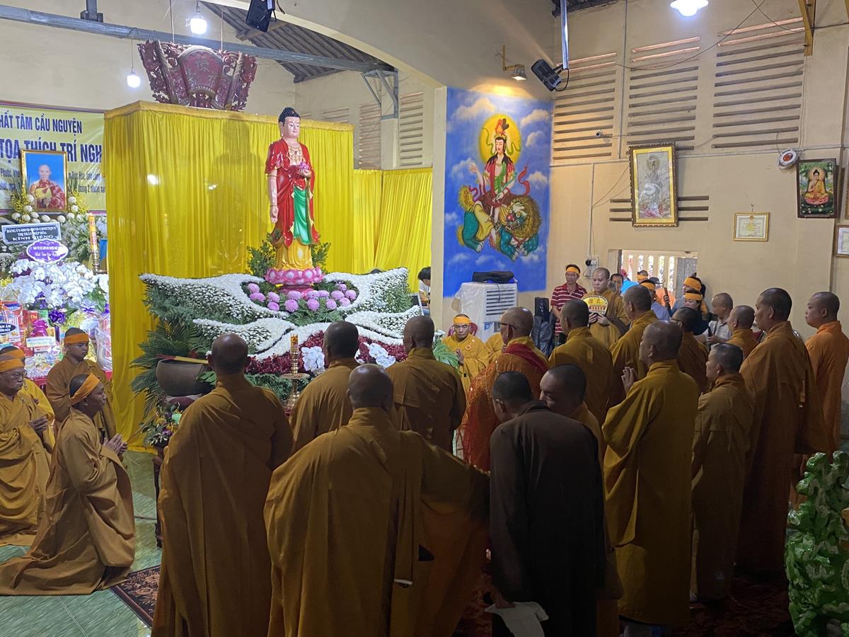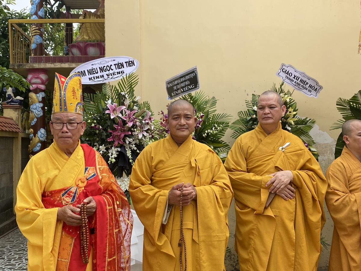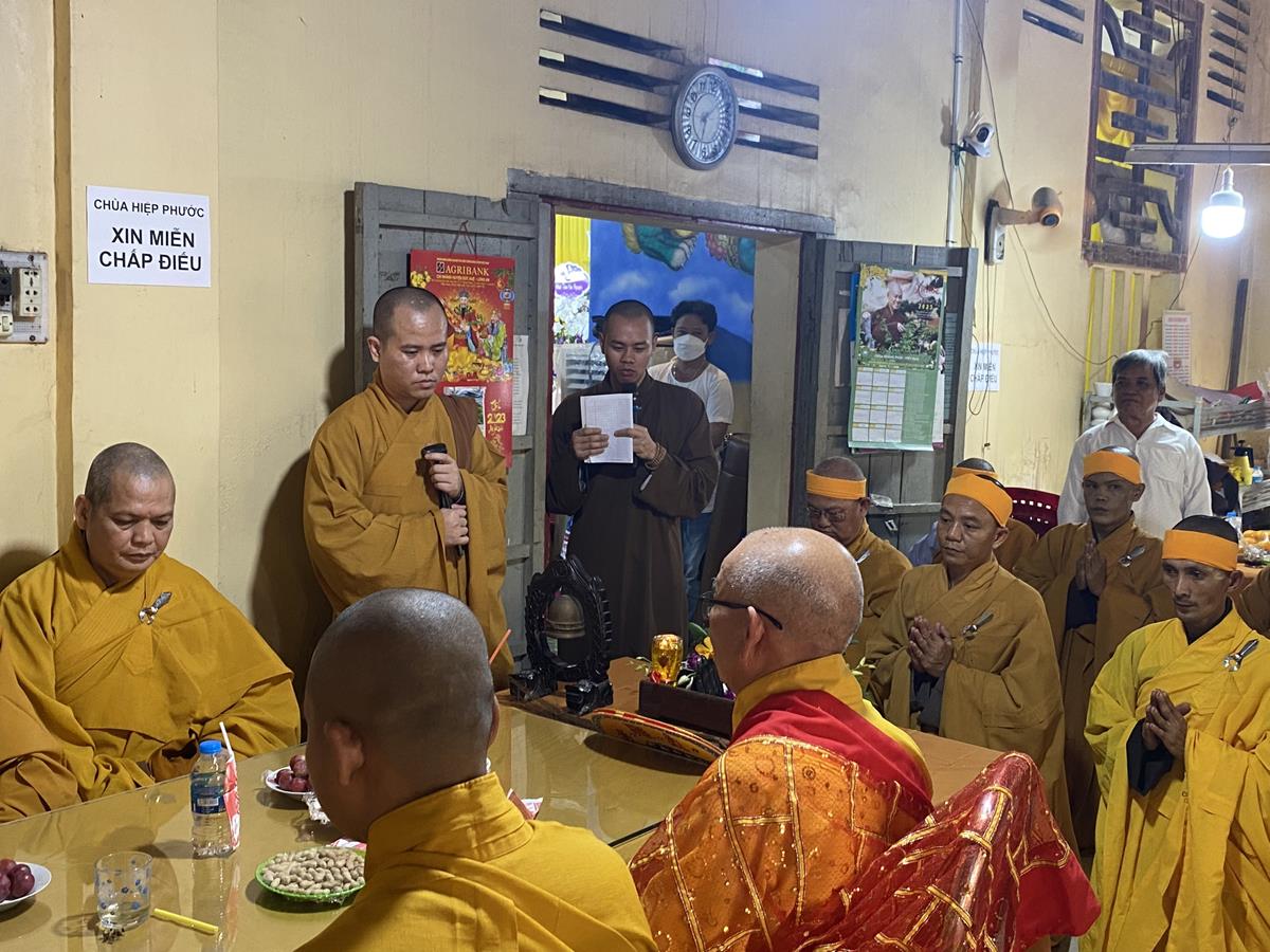 Trong buổi lễ, Chư tôn đức Tăng Ni quang lâm nơi Giác linh đài thắp hương tưởng niệm, nơi Giác linh đường trang nghiêm, Đại đức Thích Lệ Duyên – Phó ban kiêm Chánh Thư ký BTS GHPGVN tỉnh Long An, Trưởng BTS GHPGVN huyện Đức Hòa trưởng đoàn có lời ai điếu trước Giác linh đài và môn đồ pháp quyến. Đại đức bày tỏ sự kính tiếc khi Phật giáo huyện Đức Hoà từ đây mất đi một bậc Tăng già đức hạnh, trong suốt những năm hành đạo mặc dù không trực tiếp tham gia Giáo hội nhưng đời sống phạm hạnh của Thượng toạ là một tấm gương cho đàn hậu tấn noi theo tu học. Đồng thời chia sẽ sự mất mát to lớn của môn đồ pháp quyến khi không còn người thầy khả kính và mong muốn Chư tôn đức trong môn đồ pháp quyến tiếp tục thực hiện những hạnh nguyện của Thượng tọa đã để lại, phát triển ngôi Già lam Hiệp Phước ngày một hưng thạnh.