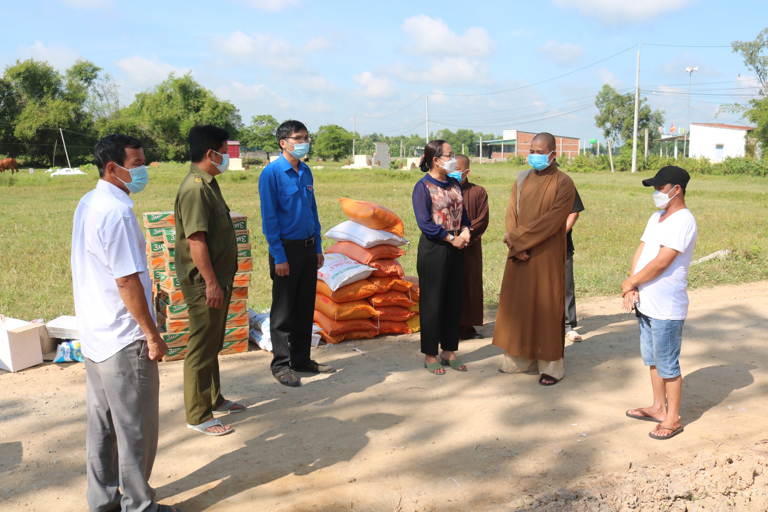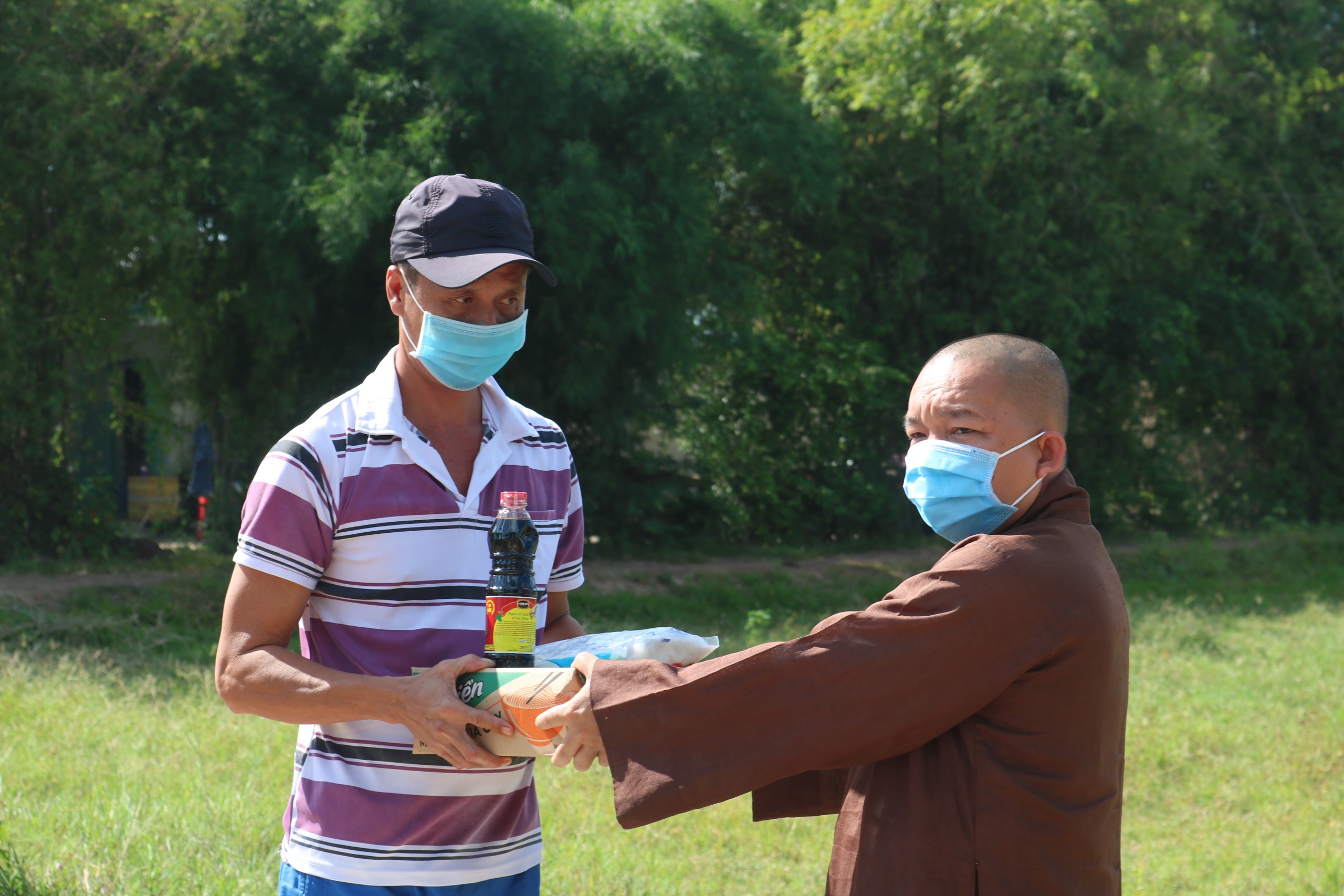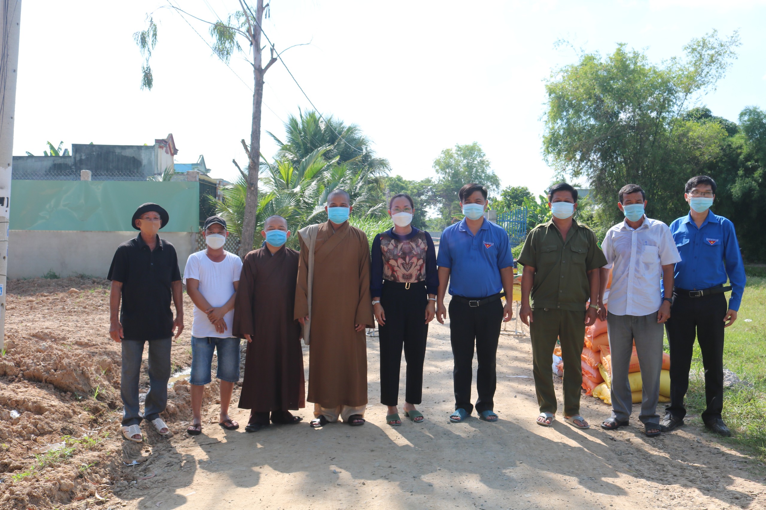 Thay mặt phái đoàn, Đại đức Thích Lệ Duyên gửi lời thăm hỏi, động viên tinh thần, chia sẻ những khó khăn đến những hộ dân và các cán bộ trực tại ngõ vào vùng phong tỏa.