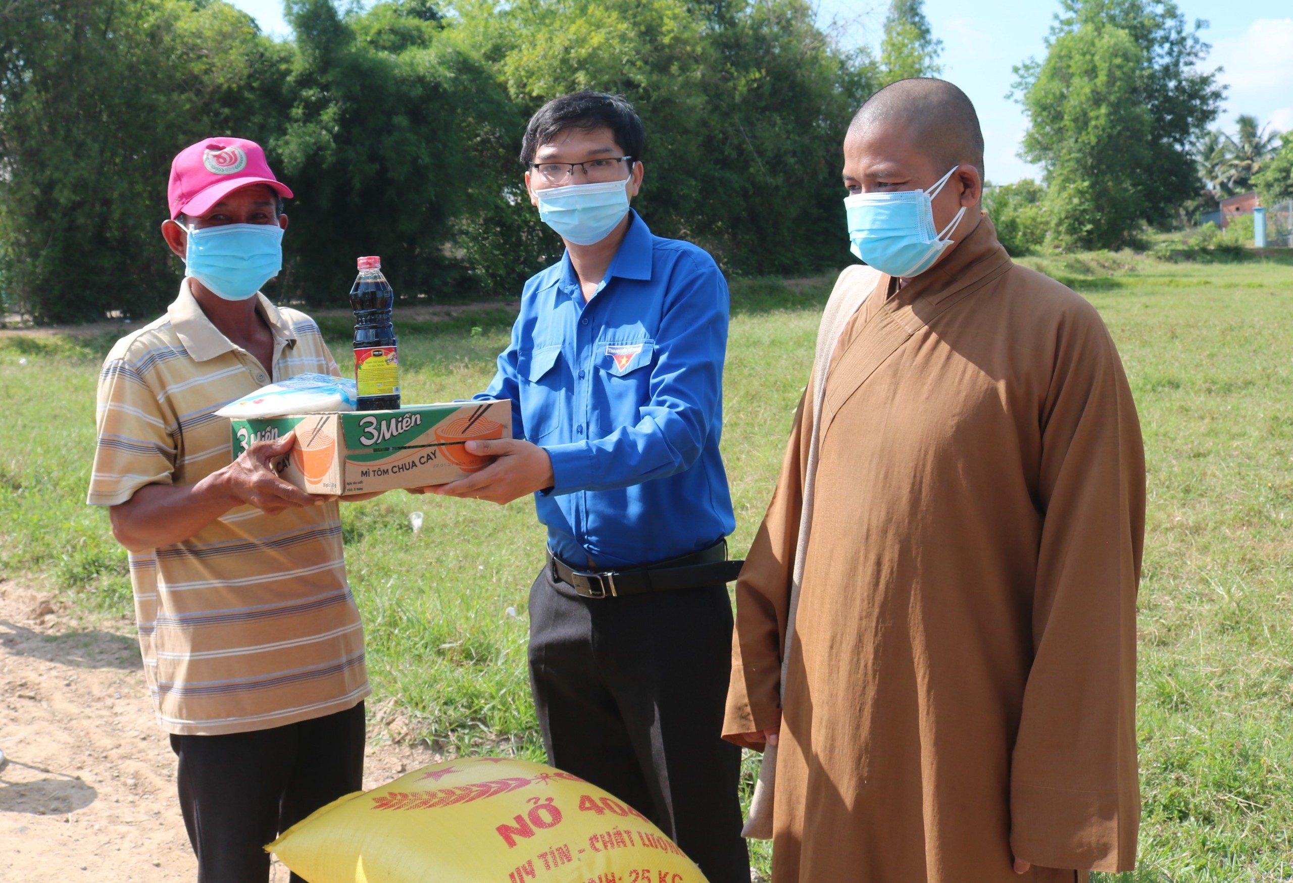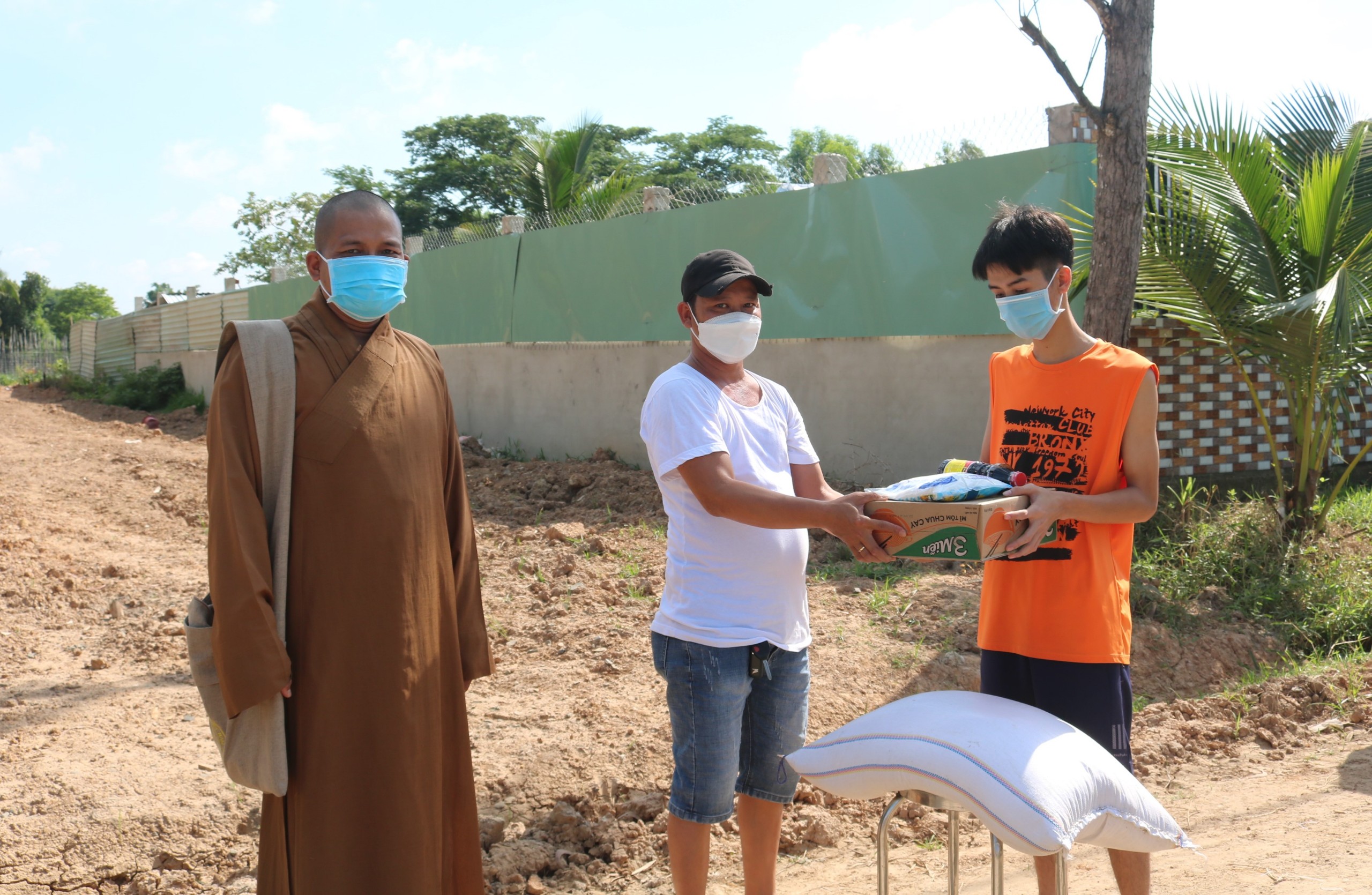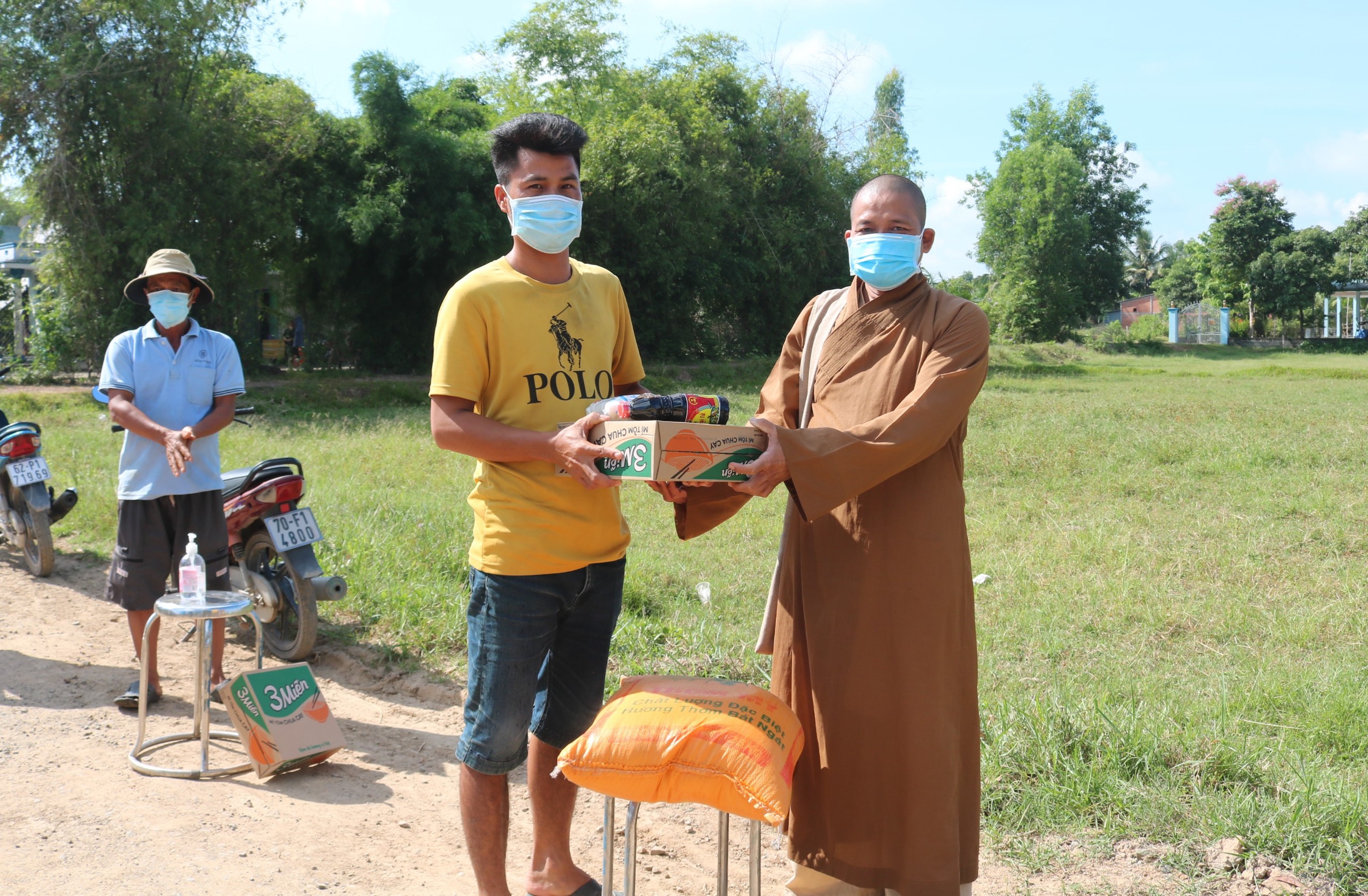 Thay mặt phái đoàn, Đại đức Thích Lệ Duyên gửi lời thăm hỏi, động viên tinh thần, chia sẻ những khó khăn đến những hộ dân và các cán bộ trực tại ngõ vào vùng phong tỏa.