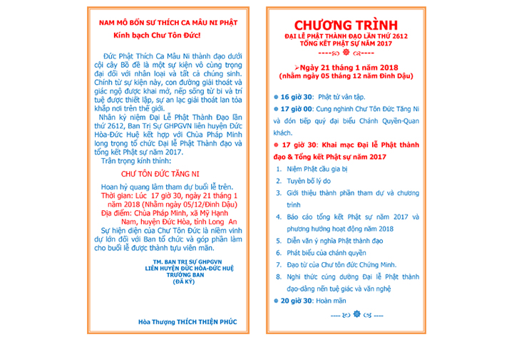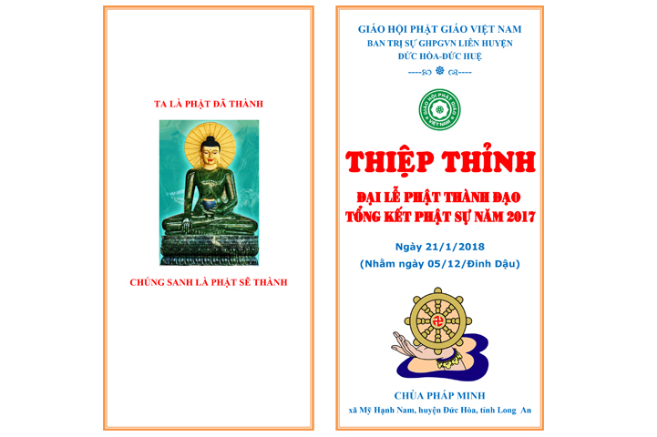 Nhân kỷ niệm Đại Lễ Phật Thành Đạo lần thứ 2612, Ban Trị Sự GHPGVN liên huyện Đức Hòa-Đức Huệ kết hợp với Chùa Pháp Minh long trọng tổ chức Đại lễ Phật Thành đạo và tổng kết Phật sự năm 2017.