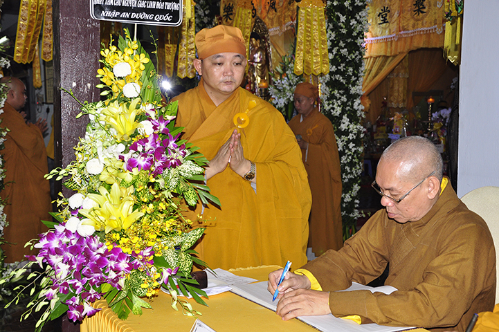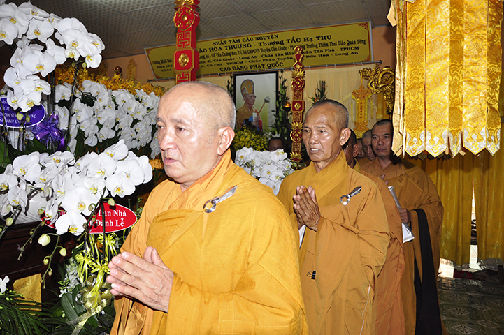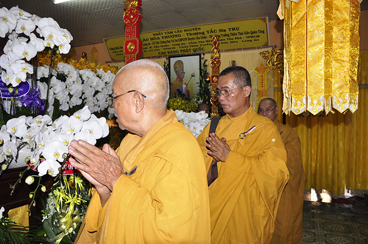 Thích Minh Thiện đại diện Ban Trị sự GHPGVN tỉnh Long An và Ban Giám Hiệu Trường Trung cấp Phật học Long An có lời ai điếu bày tỏ lòng thành kính tri ân đến Giác linh Hoà thượng. Nhiều thế hệ Tăng Ni trong tỉnh đã được duyên lành thụ huấn lời dạy của Ngài. Hòa thượng Minh Thiện tỏ lòng tiếc thương đối với Cố Hòa thượng và tri ân cố Hòa thượng có nhiều cống hiến, đóng góp cho sự nghiệp phát triển Phật giáo tỉnh nhà. Xin nguyện noi gương lành của Ngài phụng sự Đạo pháp và dân tộc. Nguyện luôn học theo hạnh Ngài và một lòng đoàn kết phát triển đạo pháp để ngôi nhà Giáo hội thêm vững mạnh, cho đạo pháp mãi lưu truyền. Nguyện cầu Giác linh cố Trưởng lão Hòa thượng cao đăng Phật quốc.