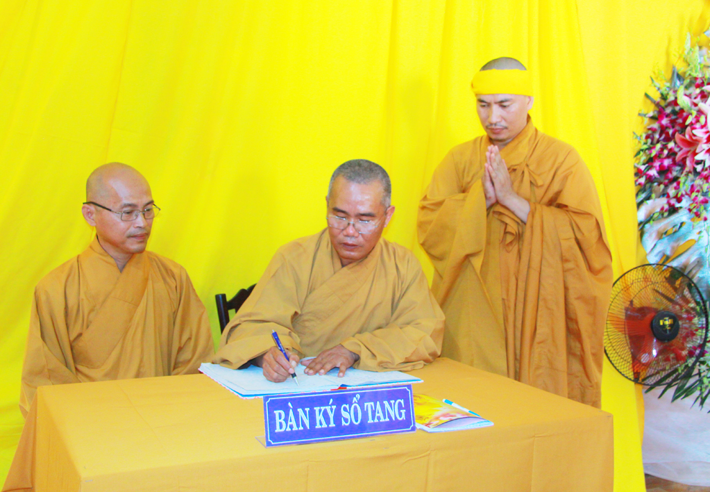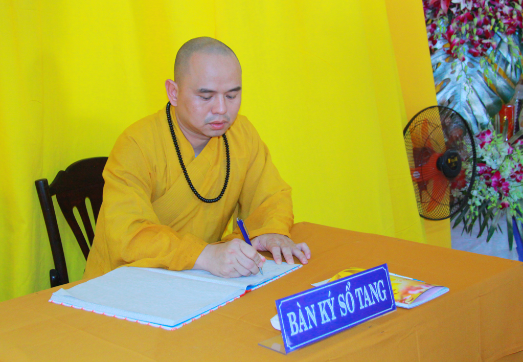 Sau khi thắp hương tưởng niệm cố Ni Trưởng, Hòa Thượng Thích Minh Thiện hướng dẫn phái đoàn hữu nhiễu kim quan và ký vào sổ tang lưu niệm.
