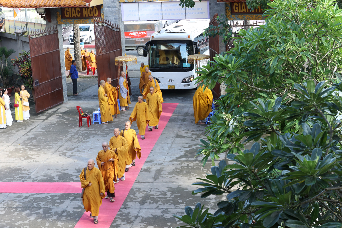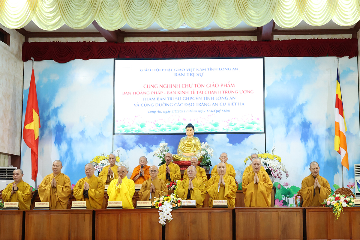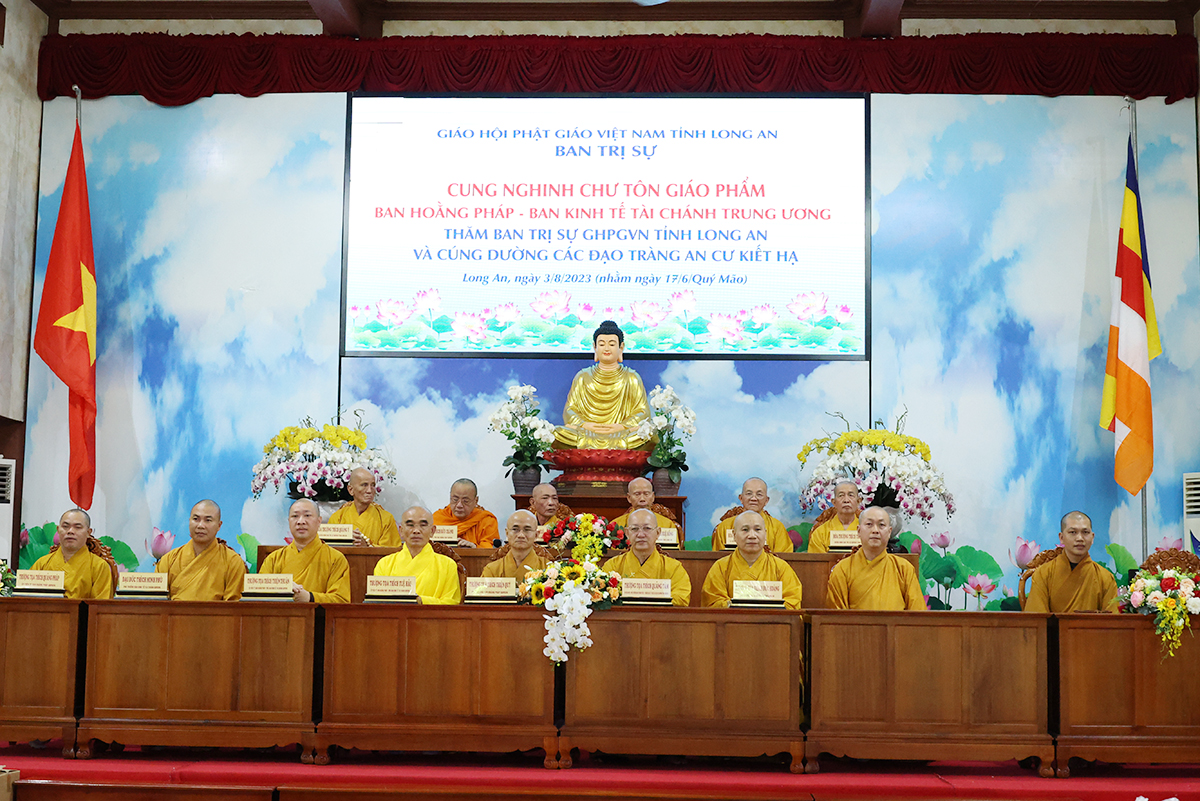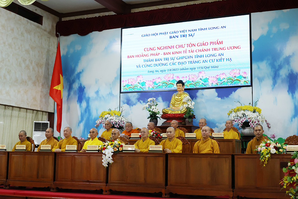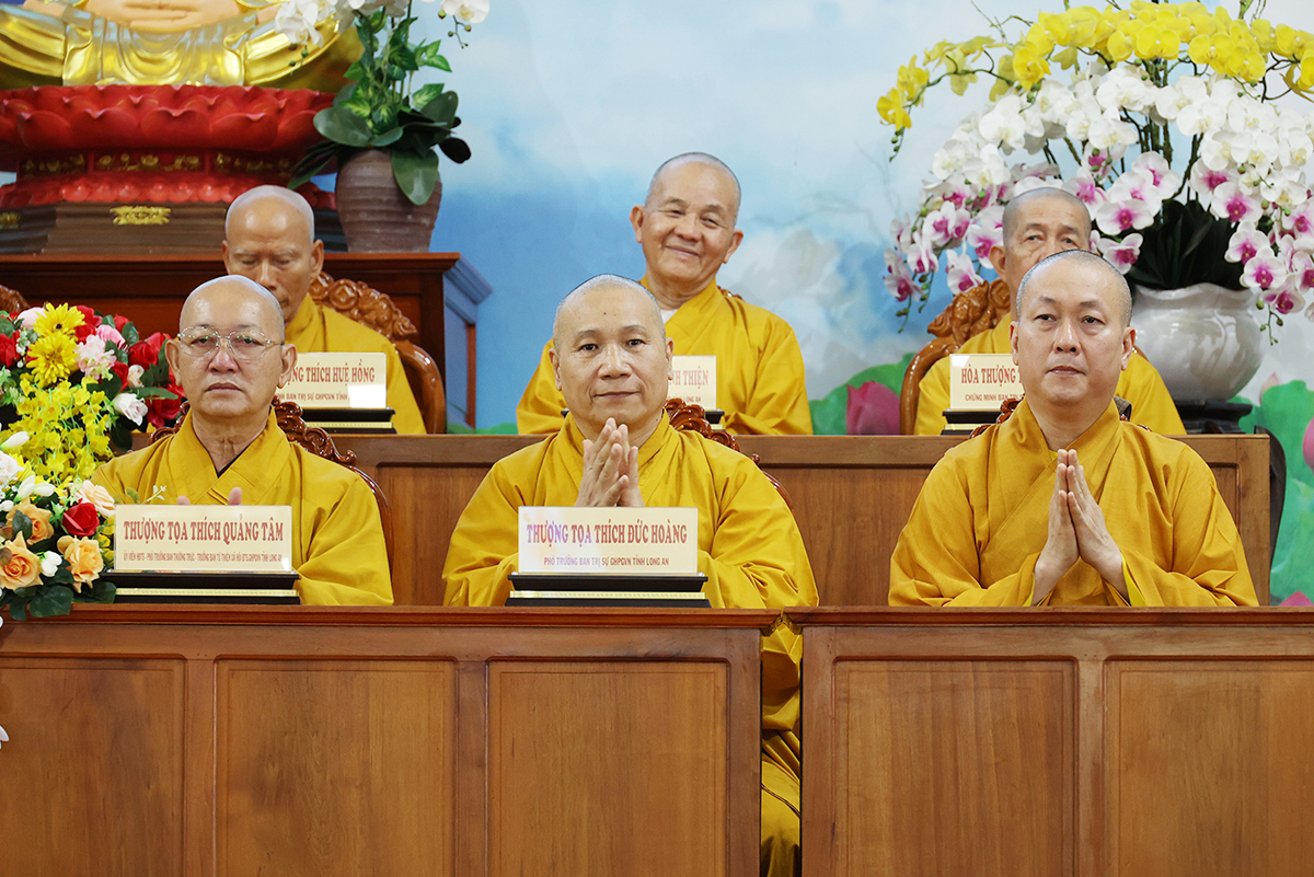 Về phía BTS GHPGVN tỉnh Long An đón tiếp phái đoàn có: HT. Thích Thiện Huệ – Thành viên HĐCM TW, Chứng minh BTS GHPGVN tỉnh Long An; HT. Thích Huệ Hồng, HT. Thích Thiện Tài, HT. Thích Quảng Ý – đồng Chứng minh BTS GHPGVN tỉnh Long An; HT. Thích Minh Thiện – UV HĐTS, Phó ban Hoằng pháp TW, Trưởng BTS GHPGVN tỉnh Long An; TT. Thích Quảng Tâm – UV HĐTS, Phó ban Từ thiện Xã hội TW, Phó Trưởng ban Thường trực BTS GHPGVN tỉnh Long An; Chư tôn đức Phó Trưởng BTS GHPGVN tỉnh Long An: TT. Thích Đức Hoàng, ĐĐ. Thích Lệ Duyên, ĐĐ. Thích Lệ Ngôn, NT. TN. Gương Liên; Chư tôn đức Ban Thường trực BTS GHPGVN tỉnh Long An, các ban chuyên ngành trực thuộc Phật giáo tỉnh và Chư hành giả của 12 trú xứ An cư kiết hạ trong tỉnh.