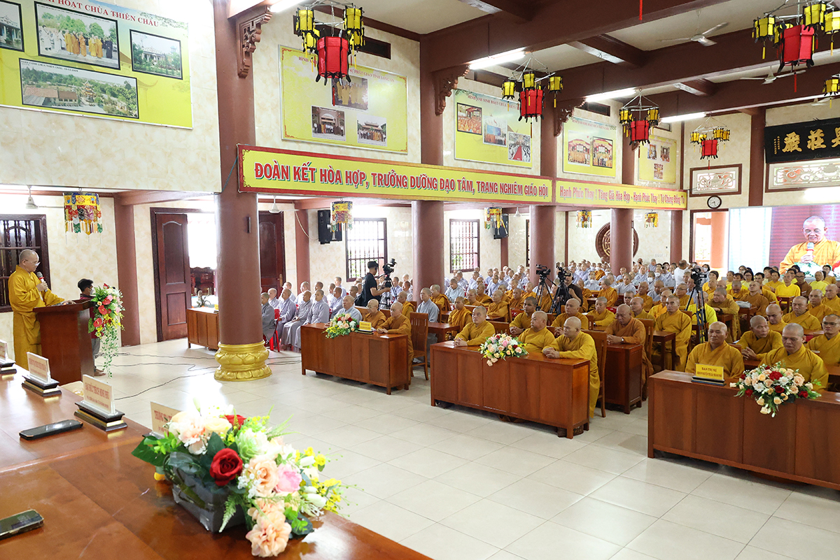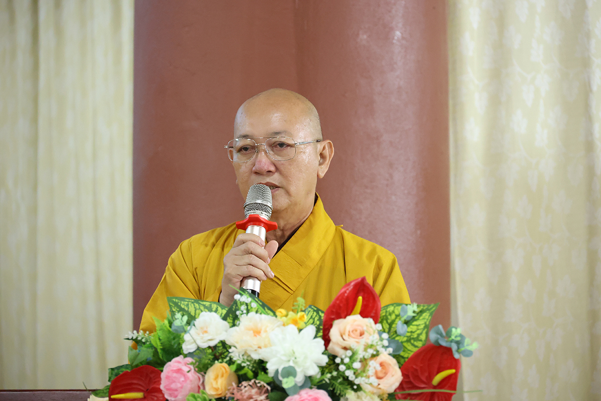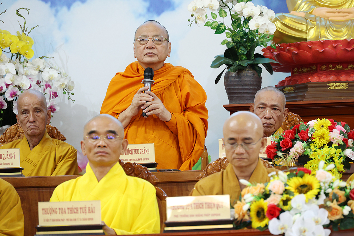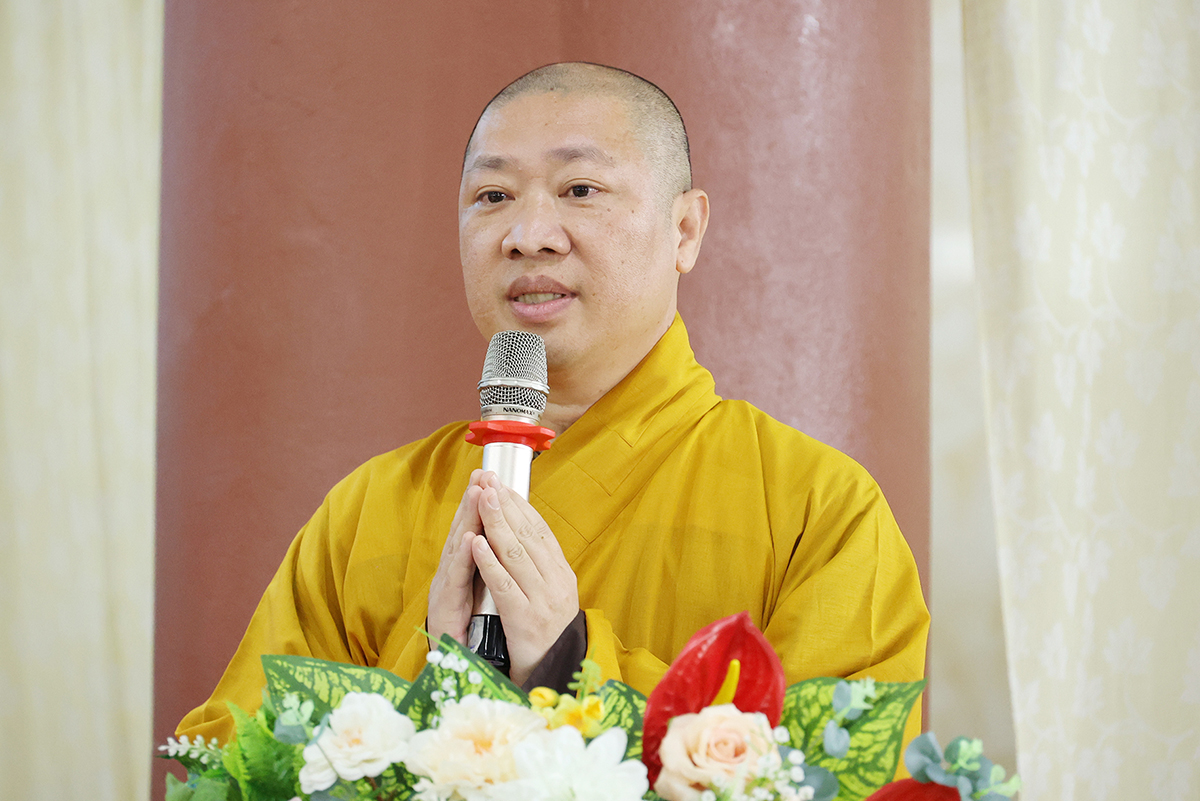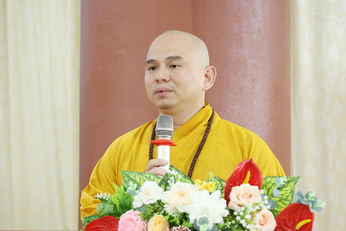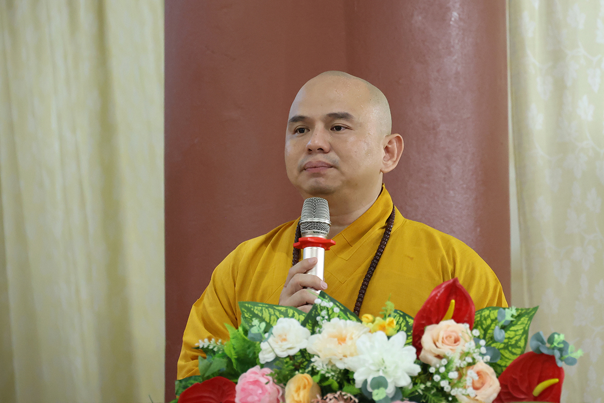 Thay mặt, Ban Thư ký phái đoàn, ĐĐ. Thích Lệ Ngôn trình bày báo cáo thành tựu của phái đoàn trong chuyến thăm các trú xứ an cư kiết hạ ở các tỉnh miền Tây.