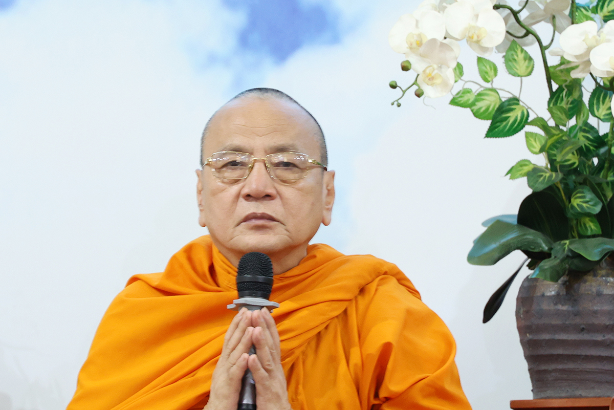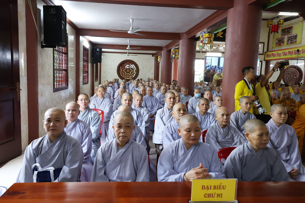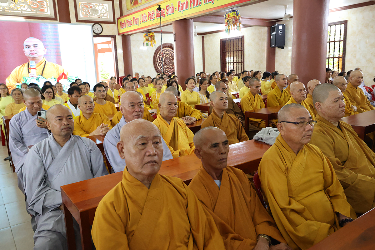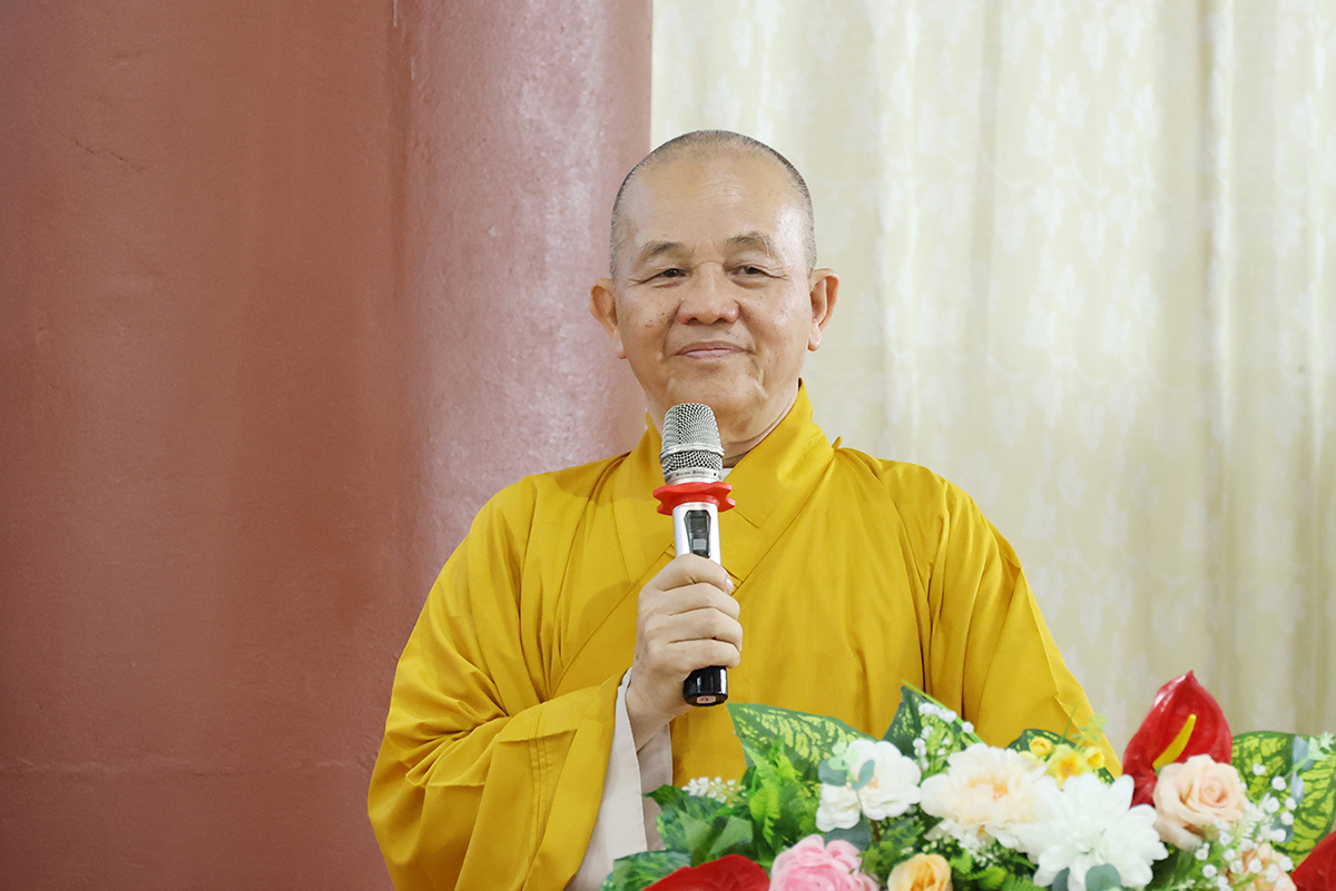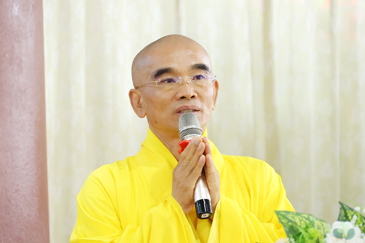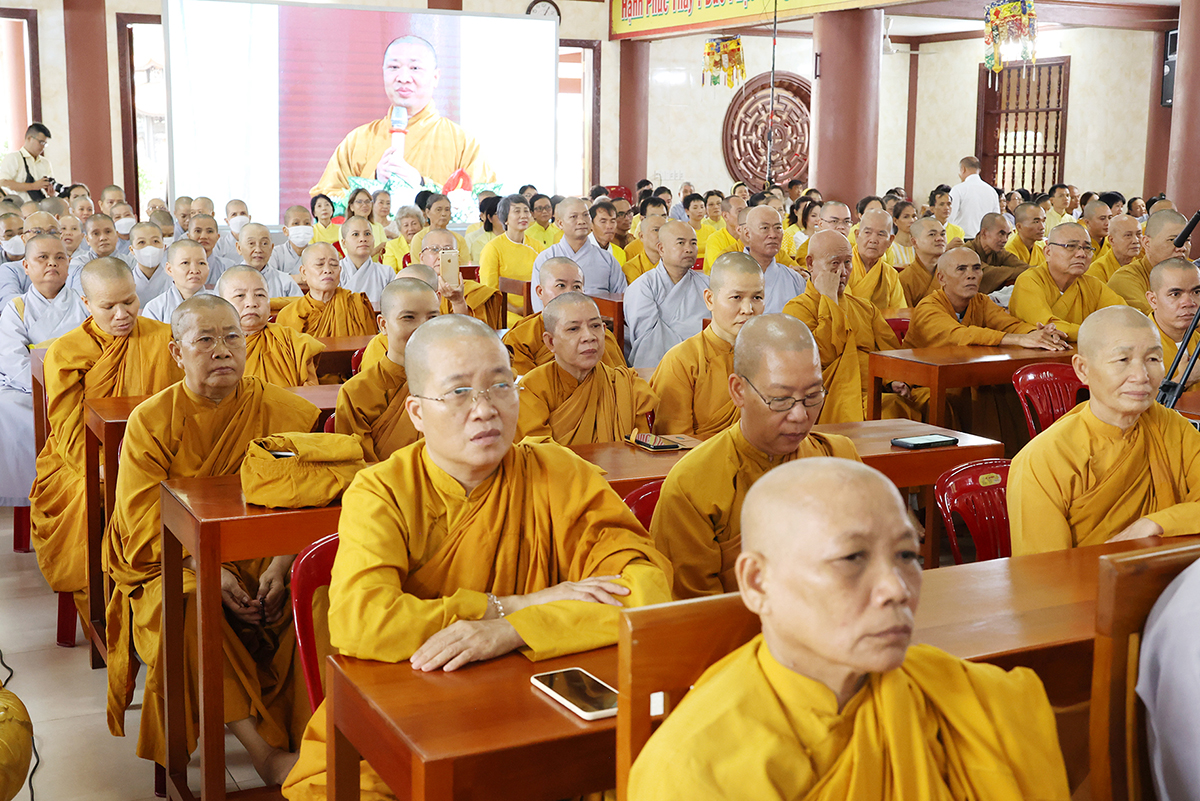 Thay mặt, Ban Thư ký phái đoàn, ĐĐ. Thích Lệ Ngôn trình bày báo cáo thành tựu của phái đoàn trong chuyến thăm các trú xứ an cư kiết hạ ở các tỉnh miền Tây.
