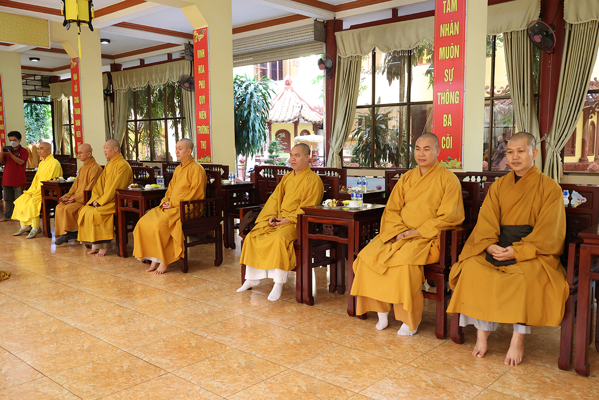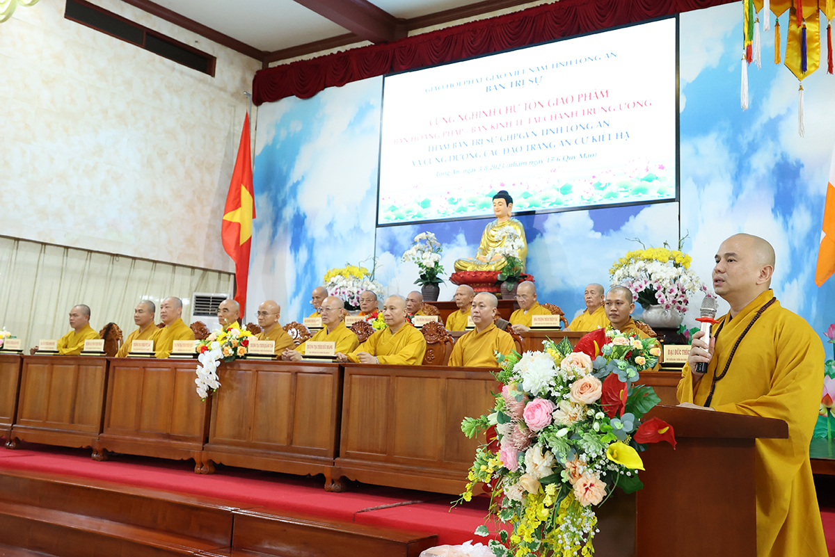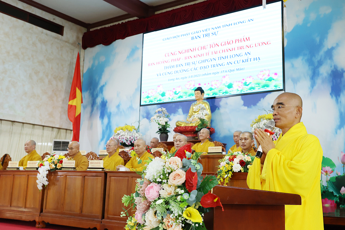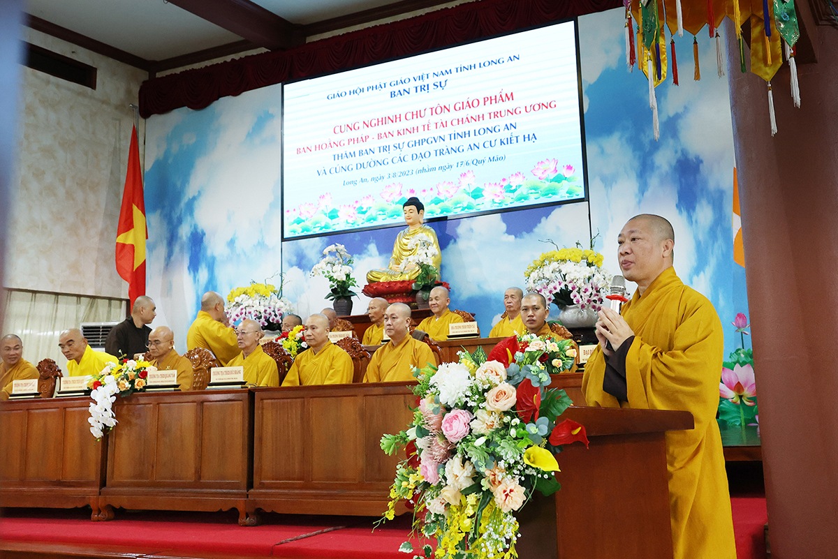 HT. Thích Minh Thiện có lời phát biểu chào mừng phái đoàn. Hòa thượng bày tỏ niềm hoan hỉ khi được cung đón chư tôn đức trong phái đoàn quang lâm về thăm viếng, chia sẻ pháp thoại và cúng dường các trú xứ an cư kiết hạ tỉnh Long An. Hòa thượng gửi lời chào mừng trân trọng và lời chúc đại kiết tường. Ban Hoằng pháp TƯ đóng vai trò quan trọng trong công tác truyền bá chánh pháp, đây là ban ngành được thành lập ngay từ khi GHPGVN ra đời. Ban Hoằng pháp hiện nay đã kế thừa tiền nhân và ngày một phát triển. Trong những năm gần đây, Ban Hoằng pháp đã duy trì công tác thuyết giảng và phối hợp Ban Kinh tế Tài chính TƯ cúng dường các trú xứ an cư kiết hạ trên toàn quốc. Hòa thượng mong muốn hằng năm được cung đón phái đoàn quang lâm về thăm viếng, chỉ đạo, động viên chư hành giả an cư trên địa bàn tỉnh.