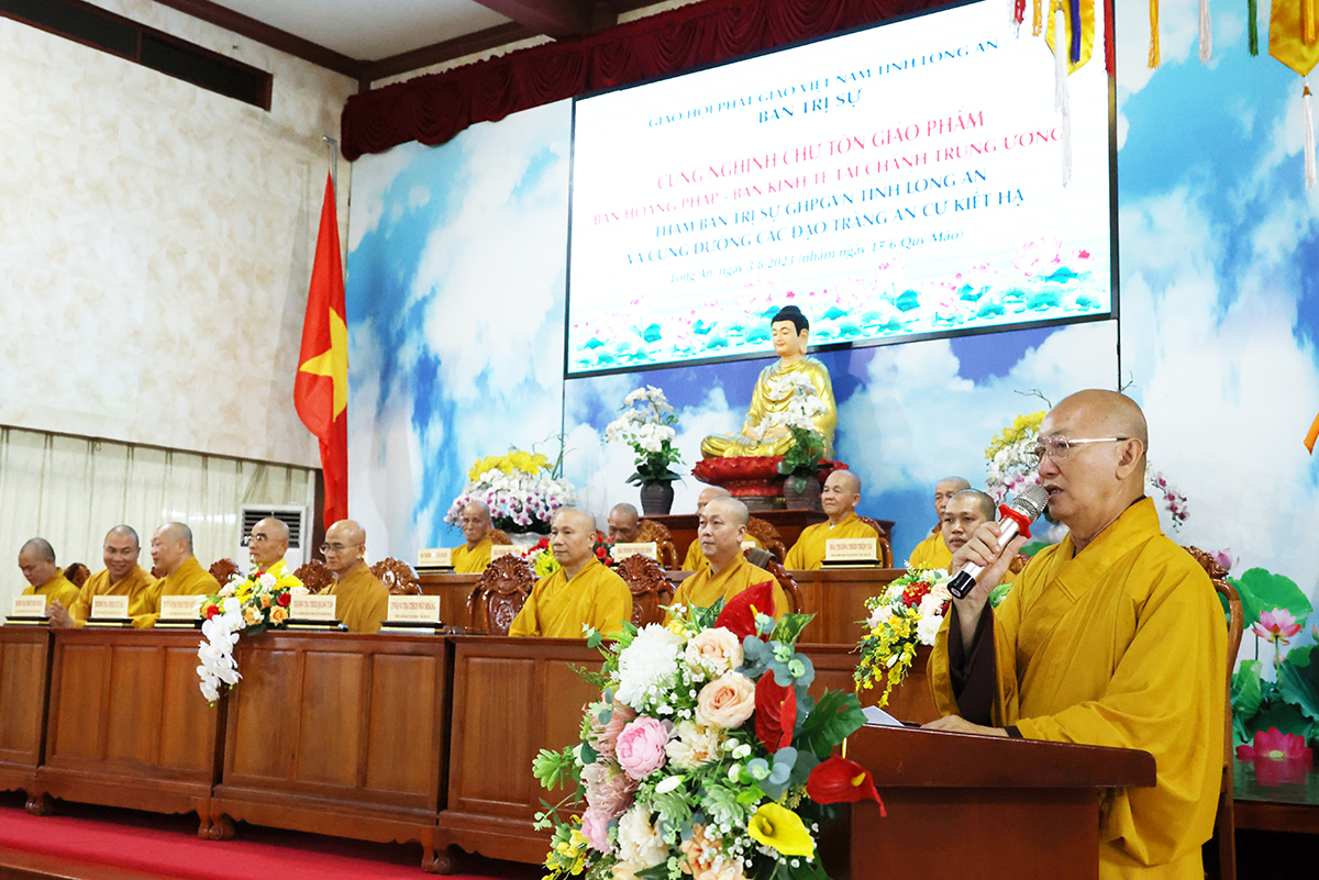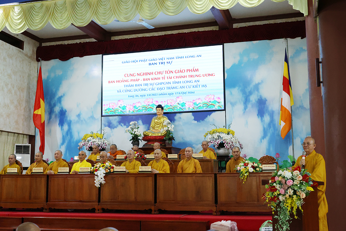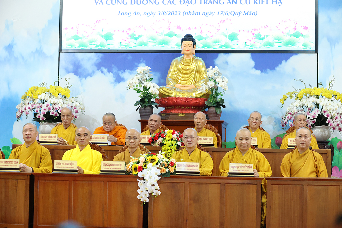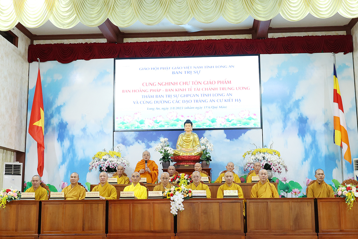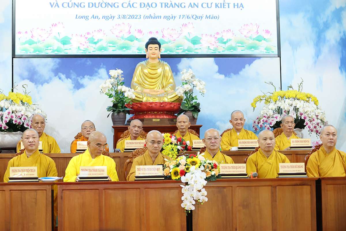 Thay mặt BTS GHPGVN tỉnh Long An, TT. Thích Quảng Tâm báo cáo công tác tổ chức Khoá An cư Kiết hạ Phật lịch 2567. Theo báo cáo, Tất cả các điểm An cư Kết hạ tổ chức thời gian tu học đủ ba tháng, từ ngày 03/7/2023 đến ngày 30/9/2023 (nhằm ngày 16/4/Quý Mão) đến ngày 16/7/Quý Mão). Tổng Khai giảng vào Ngày 03/7/2023 (nhằm ngày 16/4/Quý Mão), Bế giảng ngày 23/8/2023 (nhằm ngày 08/7/Quý Mão) tại Chùa Kim Cang, ấp Bình Cang 1, xã Bình Thạnh, huyện Thủ Thừa, tỉnh Long An. Các trường hạ sẽ học các chuyên đề về Kinh – Luật – Luận, thực hiện Bố tát đầy đủ mỗi tháng 2 lần, Hành chánh Giáo hội, Bồi dưỡng Kiến thức Trụ trì, Luật Tín ngưỡng Tôn giáo,… Được biết, mùa An cư kiết hạ năm nay, Phật giáo Long An tổ chức 12 điểm An cư Kết hạ cho gần 1000 vị Tăng Ni trong tỉnh tu học. Điểm nổi bật trong công tác tổ chức năm nay là BTS GHPGVN Tỉnh đã tổ chức thành công khóa bồi dưỡng trụ trì, triển khai hiến chương tu chỉnh lần thứ 7. Nhân đây, Thượng tọa đã báo cáo sơ bộ về những thành tựu nổi bật của Phật giáo tỉnh nhà trong những năm qua.
