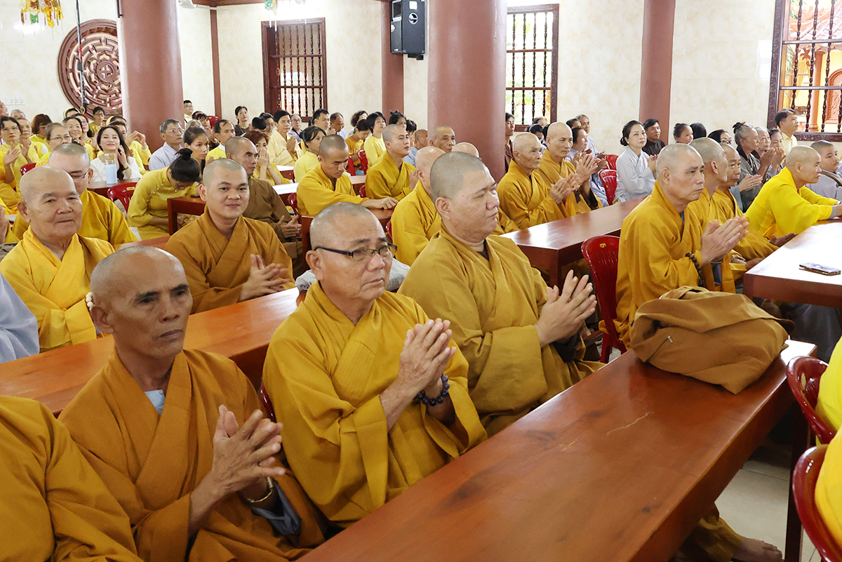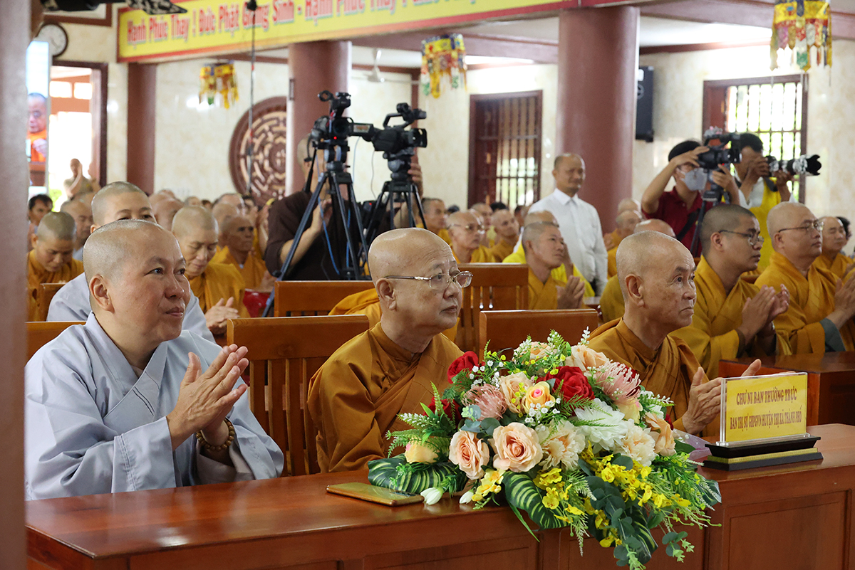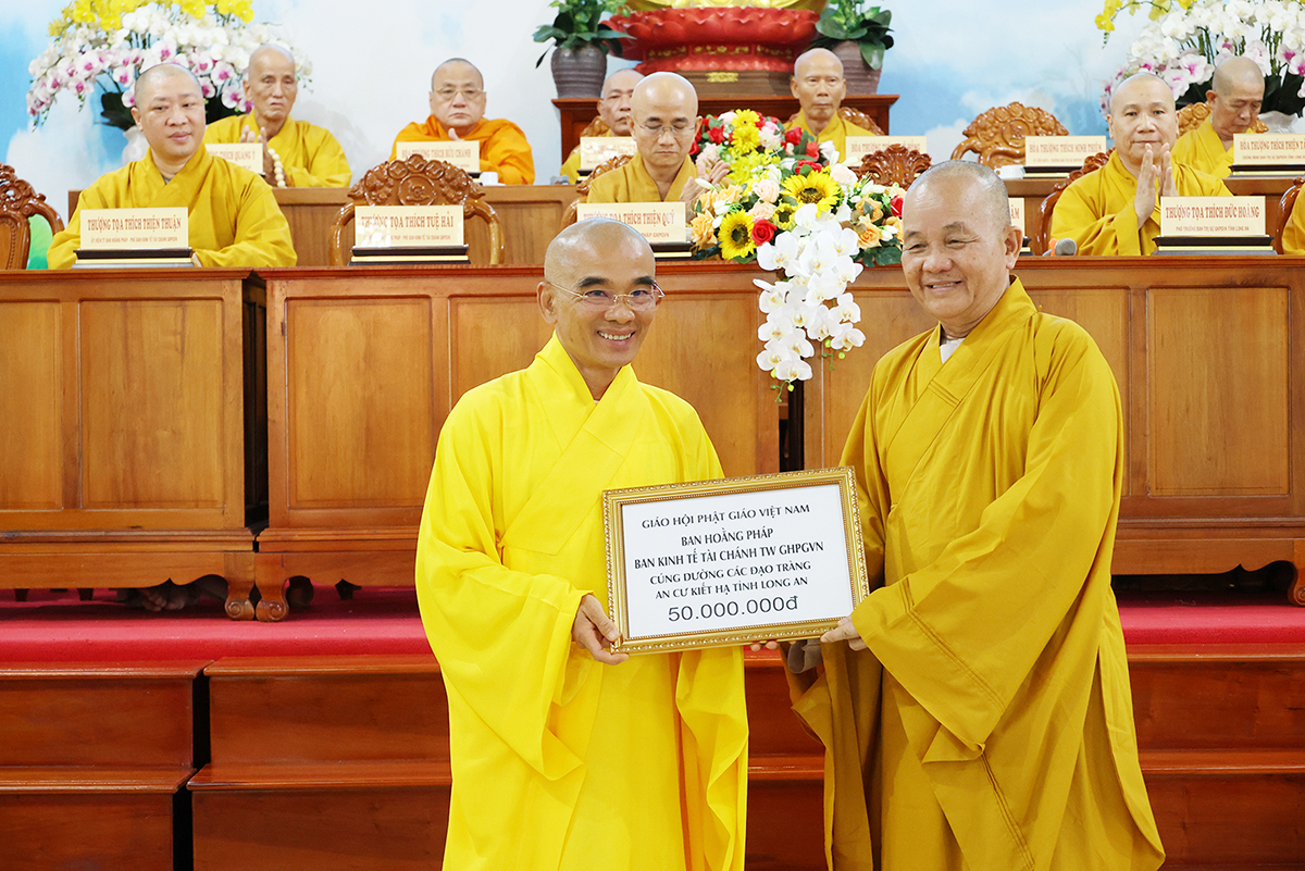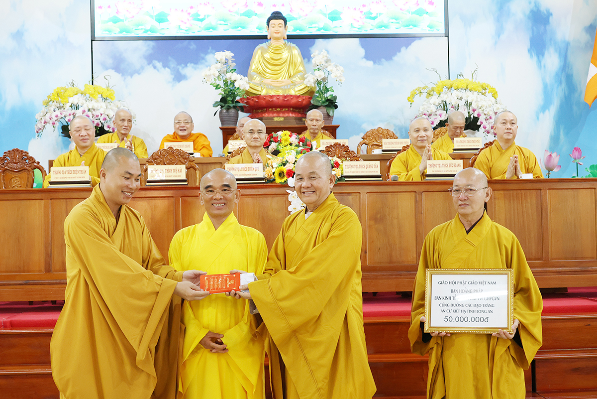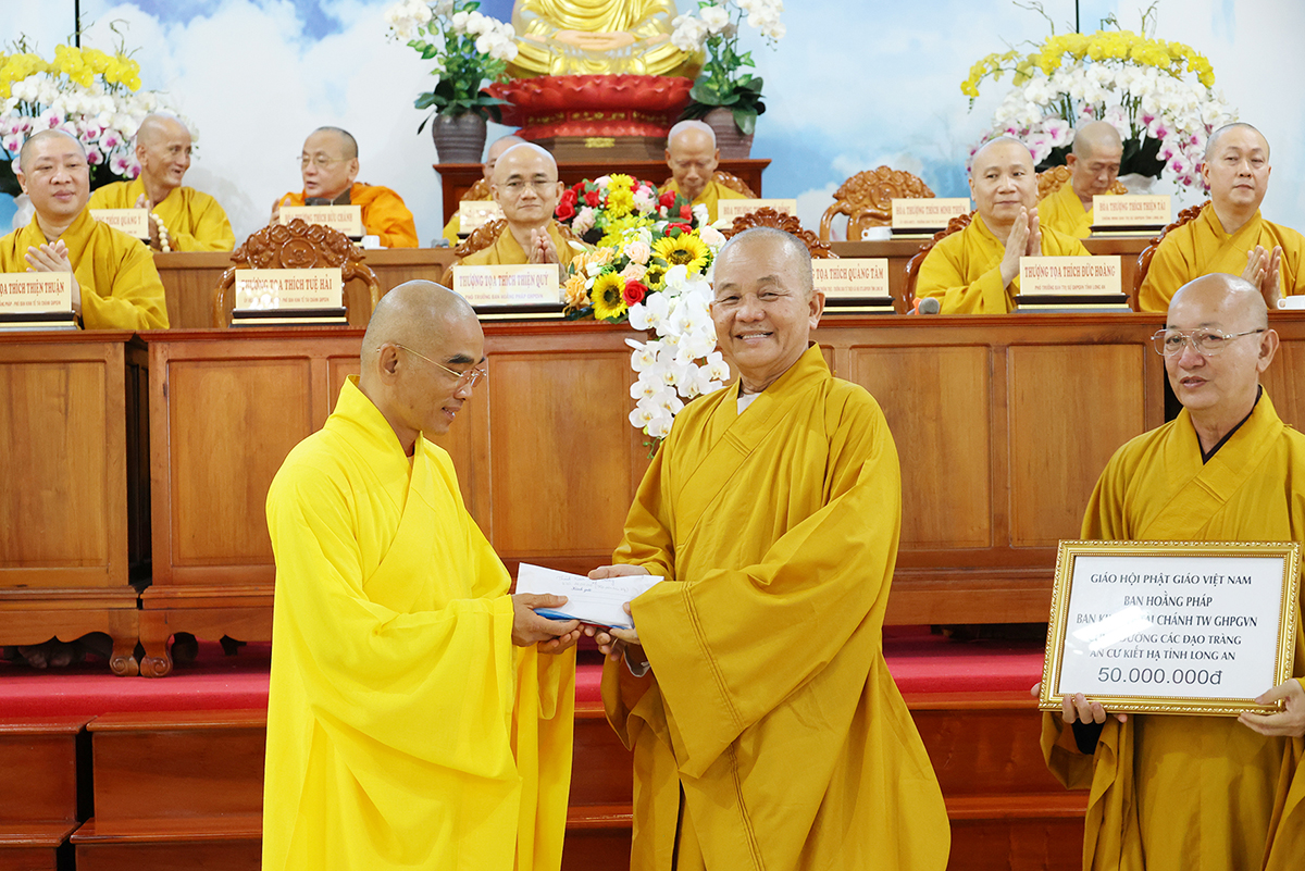TT. Thích Tuệ Hải có lời phát biểu tại buổi lễ. Thượng tọa tán thán công đức của Hòa thượng Thích Minh Thiện mặc dù bận nhiều Phật sự tại tỉnh nhà những vẫn đồng hành cùng phái đoàn trong suốt những ngày qua. Sau đó, Thượng tọa đã trao tịnh tài Ban Hoằng pháp, Ban Kinh tế Tài chính TƯ, Chùa Long Hương cúng dường đến 12 trú xứ an cư kết hạ tỉnh Long An.