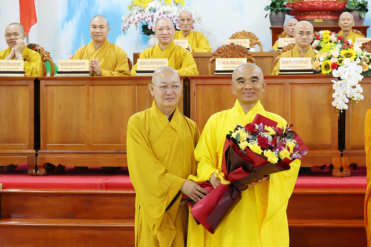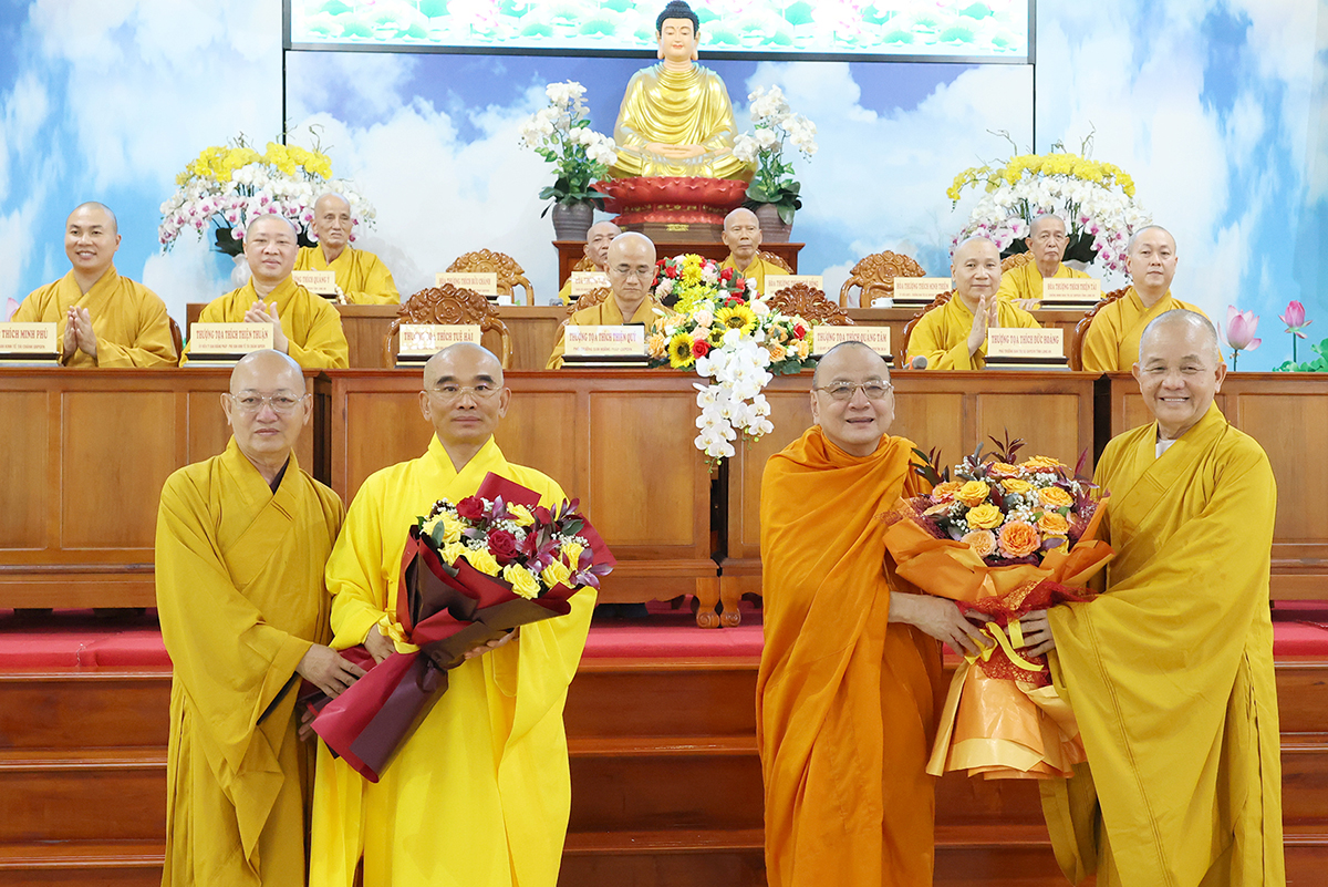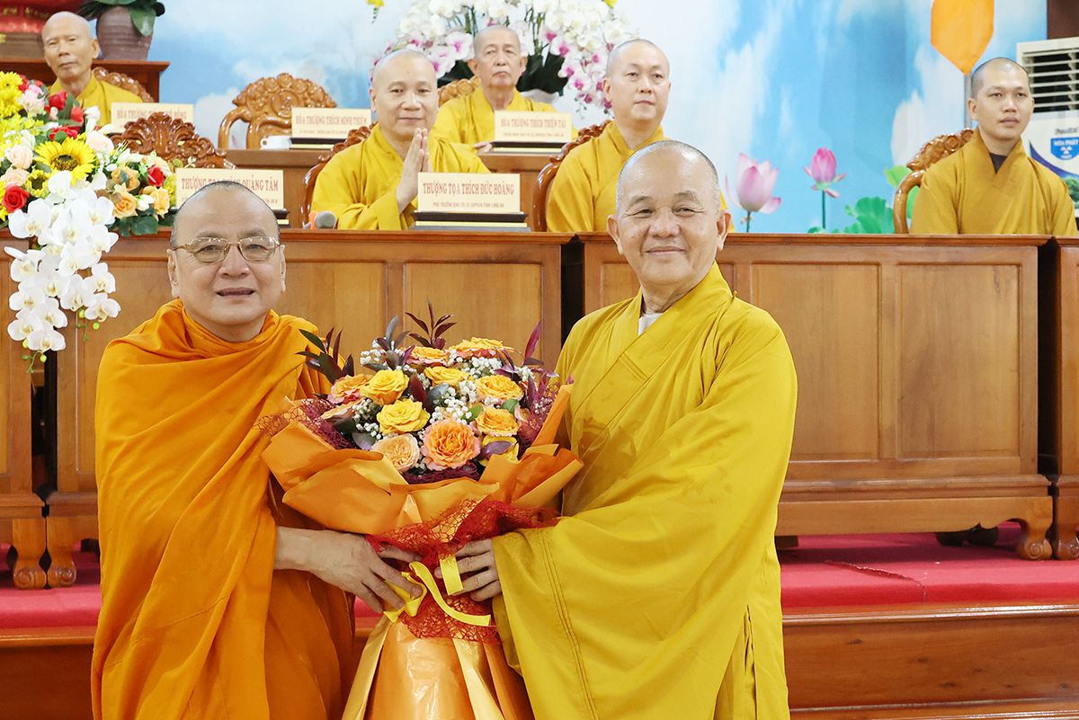 Hòa thượng Trưởng BTS GHPGVN tỉnh, Thượng tọa Phó Trưởng ban Thường trực BTS GHPGVN tỉnh tặng hoa tri ân đến Ban Hoằng pháp TƯ, Ban Kinh tế Tài chính TƯ.