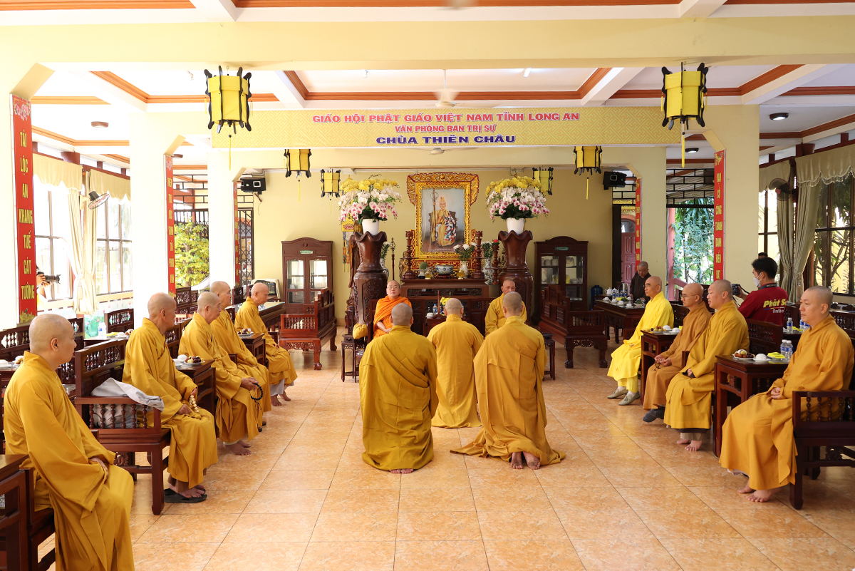 Sáng ngày 03/8/2023 (nhằm 17/6/Quý Mão), tại Hội trường Văn phòng Ban Trị sự GHPGVN tỉnh Long An – Chùa Thiên Châu, số 101, đường Huỳnh Văn Nhứt, phường 3, Thành phố Tân An, Chư tôn đức Ban Thường trực BTS tỉnh đã đón tiếp phái đoàn chư Tôn đức lãnh đạo Ban Hoằng pháp TW, Ban Kinh tế tài chính TW đến thăm hỏi, làm việc với Ban Trị sự GHPGVN tỉnh Long An và cúng dường trường hạ trong tỉnh.
