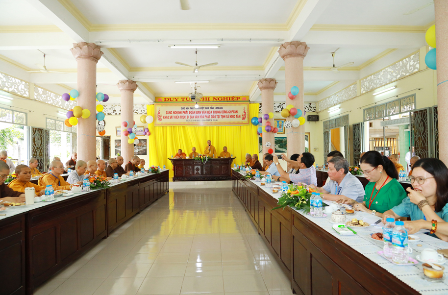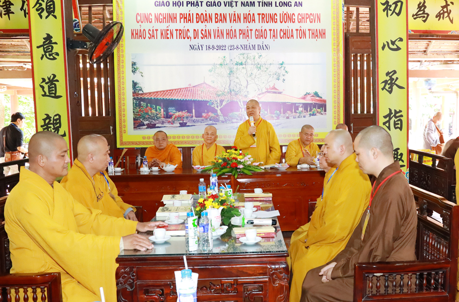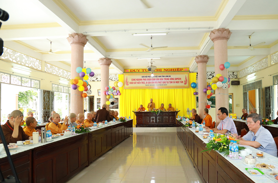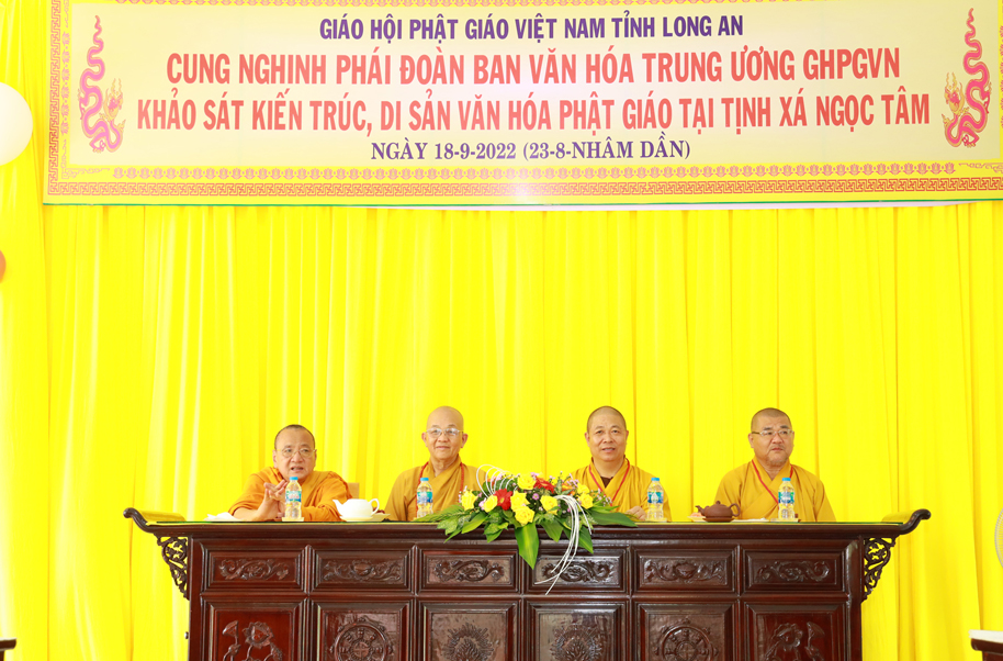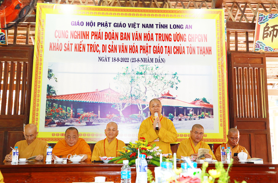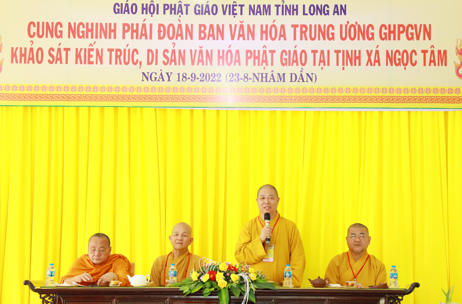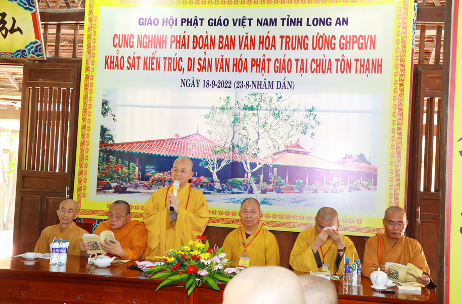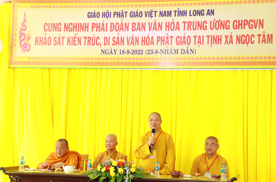 Thay mặt phái đoàn, Thượng toạ Thích Thọ Lạc – Trưởng ban Văn hoá TW có lời phát biểu: Thượng tọa nói về mục đích của chuyến công tác này, Ban Văn hoá TƯ phối hợp cùng Phật giáo địa phương, các nhà nghiên cứu dành thời gian tìm hiểu để có phương án gìn giữ, bảo quản, bảo tồn các ngôi chùa, tự viện thuộc kiến trúc và di sản của người xưa để lại. Việc làm này thuộc Đề án Kiến trúc – là một trong 4 đề án lớn (Pháp phục, Ngôn ngữ, Kiến trúc và Di sản) mà những năm qua Ban Văn hoá TƯ GHPGVN đề xướng và thực hiện. Thượng tọa lời tri ân Hòa thượng Trưởng BTS GHPGVN tỉnh Long An, Thường trực BTS GHPGVN tỉnh Long An đã tháp tùng cùng phái đoàn trong chuyến công tác tại Long An, Thượng tọa còn ghi nhận sự phối hợp cùng Ban Văn hóa TW trong các công tác Phật sự trong hiện tại và tương lai.