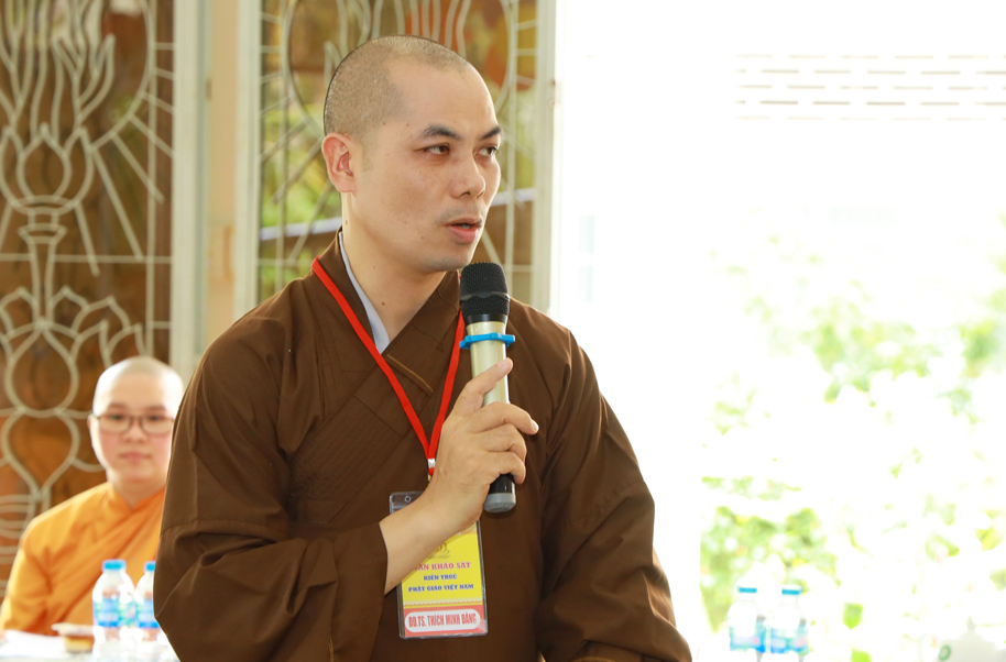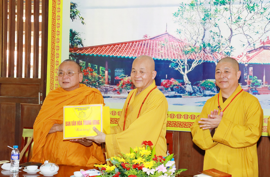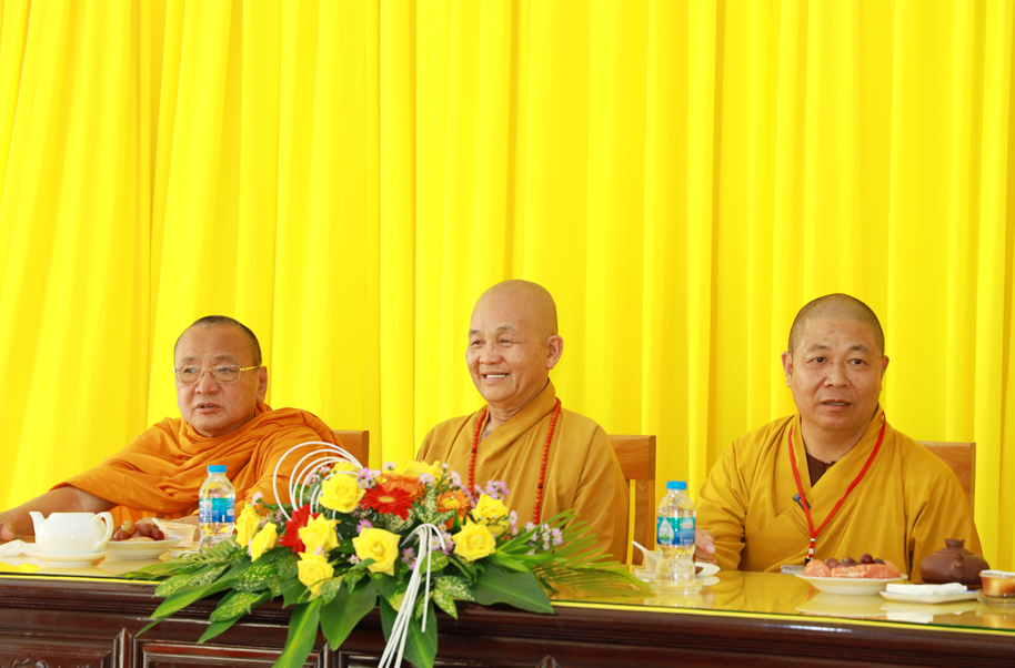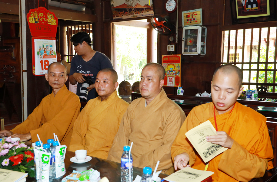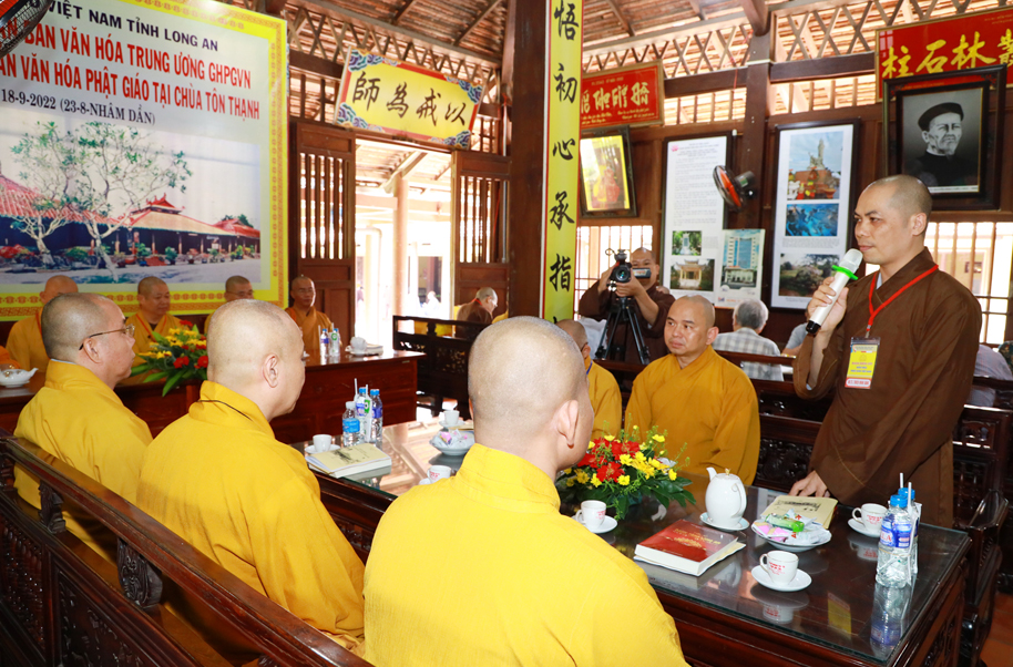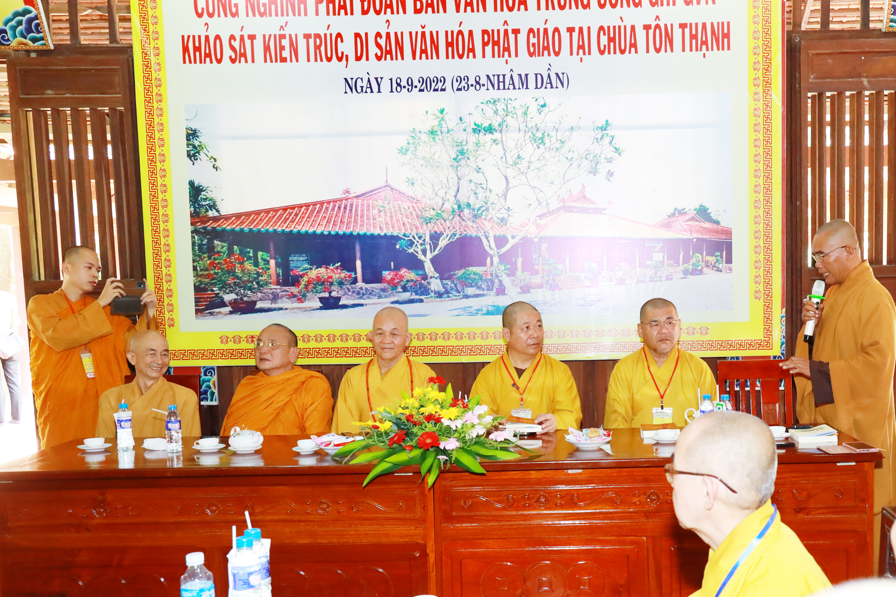 Thay mặt phái đoàn, Thượng toạ Thích Thọ Lạc – Trưởng ban Văn hoá TW có lời phát biểu: Thượng tọa nói về mục đích của chuyến công tác này, Ban Văn hoá TƯ phối hợp cùng Phật giáo địa phương, các nhà nghiên cứu dành thời gian tìm hiểu để có phương án gìn giữ, bảo quản, bảo tồn các ngôi chùa, tự viện thuộc kiến trúc và di sản của người xưa để lại. Việc làm này thuộc Đề án Kiến trúc – là một trong 4 đề án lớn (Pháp phục, Ngôn ngữ, Kiến trúc và Di sản) mà những năm qua Ban Văn hoá TƯ GHPGVN đề xướng và thực hiện. Thượng tọa lời tri ân Hòa thượng Trưởng BTS GHPGVN tỉnh Long An, Thường trực BTS GHPGVN tỉnh Long An đã tháp tùng cùng phái đoàn trong chuyến công tác tại Long An, Thượng tọa còn ghi nhận sự phối hợp cùng Ban Văn hóa TW trong các công tác Phật sự trong hiện tại và tương lai.