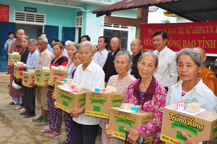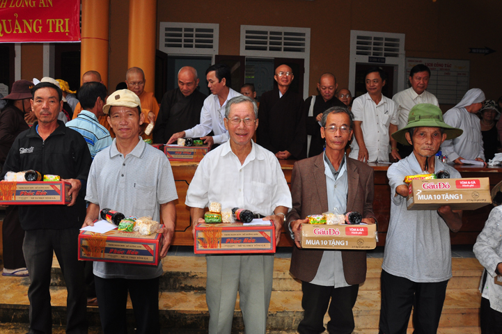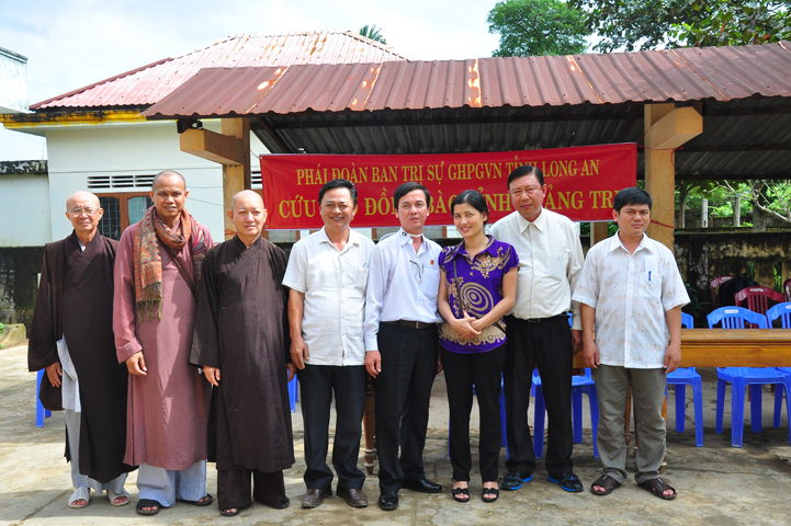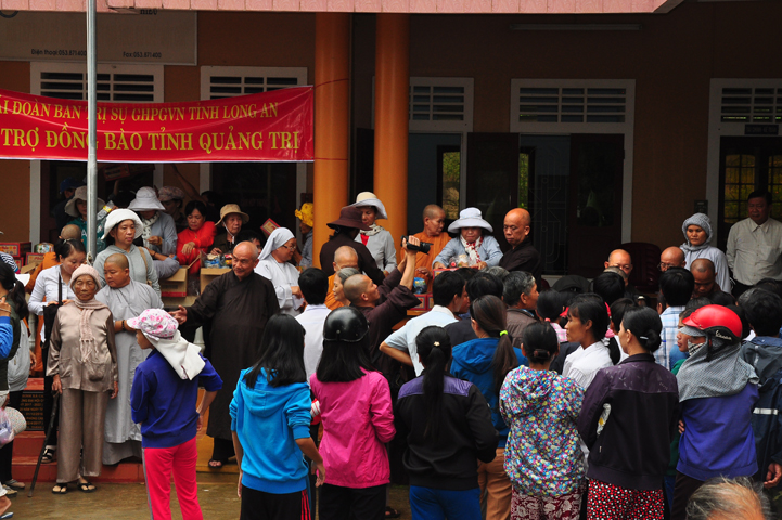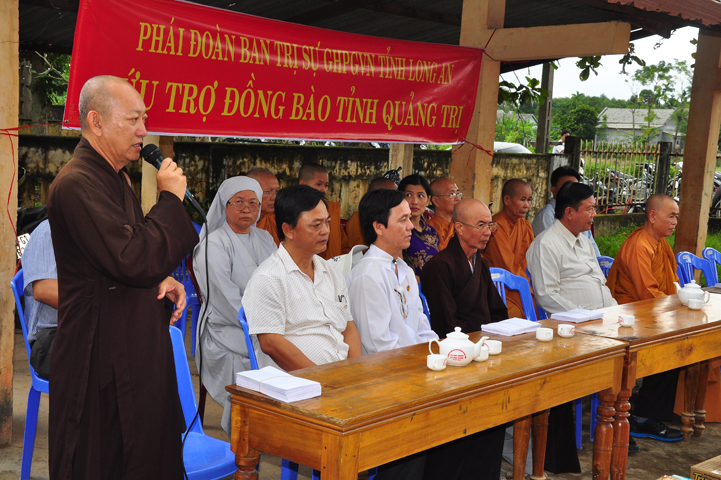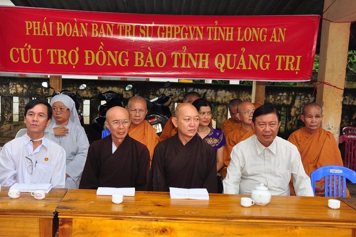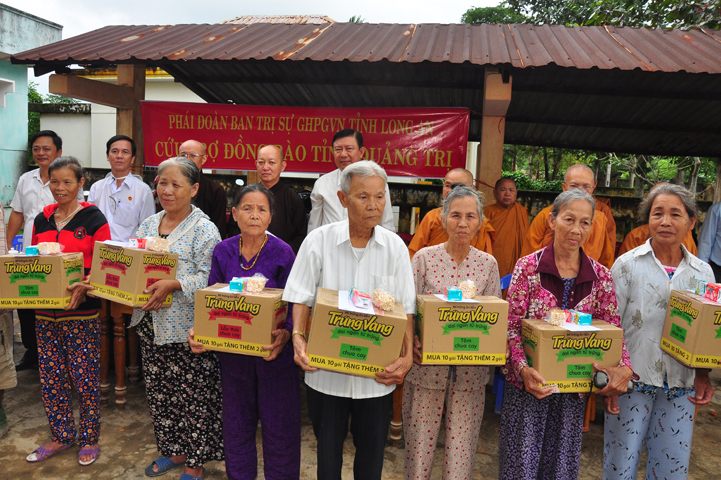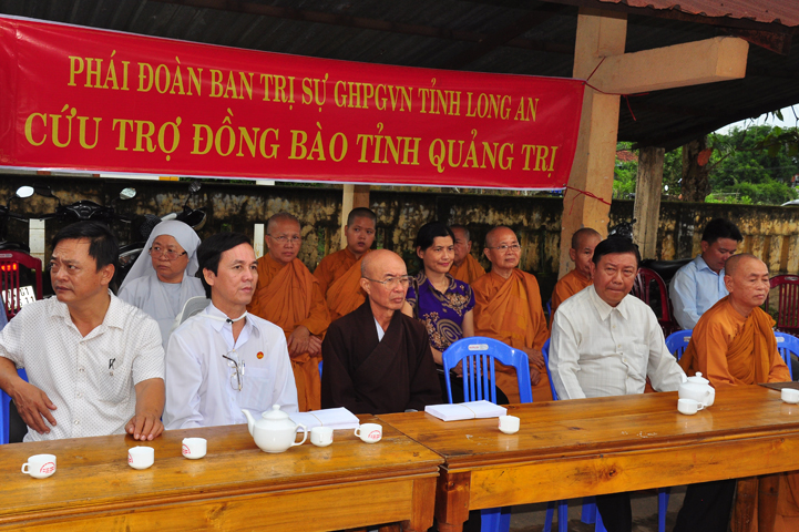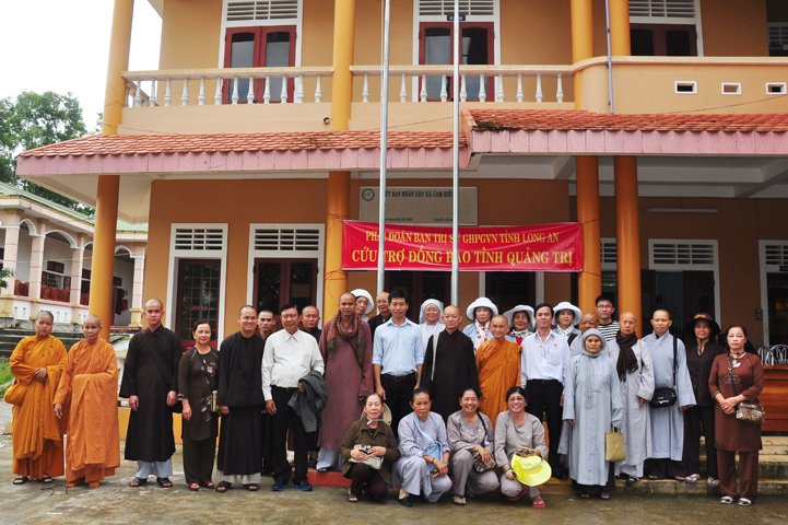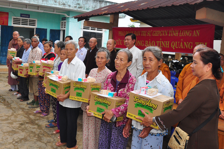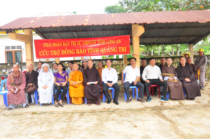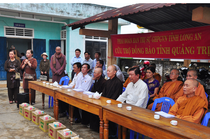 Theo lịch trình chuyến cứu trợ Miền Trung của Ban trị sự GHPGVN tỉnh Long An. Sáng nay, ngày 19/11/2016 (nhằm ngày 20/10/ Bính Thân) phái đoàn do Thượng tọa Thích Quảng Tâm- Phó Ban Trị sự kiêm Trưởng Ban Từ thiện Xã hội GHPGVN tỉnh Long An làm trưởng đoàn cùng Ni trưởng TN Gương Liên- Phó Ban Trị sự kiêm Trưởng Ban Kinh tế Tài chính; Đại đức Thích Thiện Danh- Phó Thư ký kiêm Chánh văn phòng Ban Trị sự GHPGVN tỉnh Long An; Ông Nguyễn Văn Nhạn : Phó Trưởng phòng Dân tộc Tôn giáo UBMTTQVN tỉnh Long An; Ông Lê Trường Cửu, Đại diện Ban Tôn giáo (SNV) tỉnh Long An làm phó đoàn ; Đạo hữu Lệ Kiệt- Phó Thư ký kiêm Phó Chánh văn phòng Ban Trị sự GHPGVN tỉnh Long An làm Thư ký đoàn cùng các thành viên trong đoàn đã đến phát quà 500 phần quà cho bà con. Mỗi phần quà gồm, mì nước tương, và 400 ngàn tiền mặt, tổng trị giá 250 triệu đồng tại xã Cam Hiếu và xã Cam Tuyền, huyện Cam Lộ, tỉnh Quãng Trị.