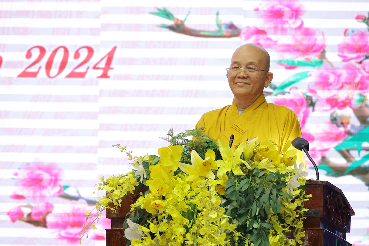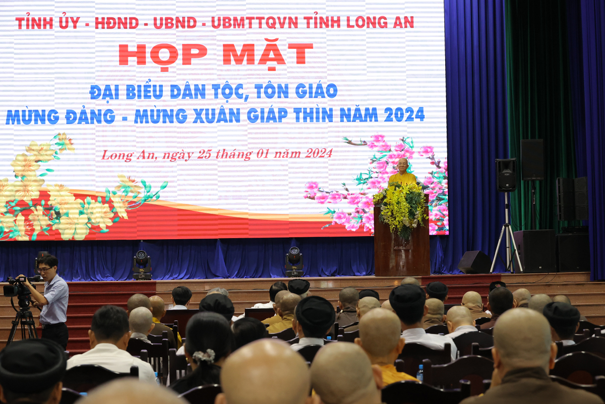 Thay mặt Ban Thường trực BTS GHPGVN tỉnh Long An và giới Phật giáo tỉnh nhà, HT. Thích Minh Thiện có lời phát biểu tại buổi họp mặt. Hòa thượng bày tỏ niềm hoan hỷ và chúc mừng trước những thành tựu của tỉnh nhà trong năm qua. Hòa thượng nhắc lại truyền thống tốt đẹp của các Tôn giáo trên địa bàn tỉnh Long An luôn thể hiện tinh thần đại đoàn kết. Năm vừa qua, Phật giáo tỉnh nhà luôn đồng hành cùng chính quyền các cấp trong công tác bảo vệ an ninh Tổ quốc và an sinh xã hội đạt trên 107 tỉ đồng VN. Dịp cuối năm, Phật giáo đã kết hợp Bộ Chỉ huy Quân sự tỉnh, Bộ đội Biên phòng tỉnh Long An thực hiện nhiều chương trình: “Thăm Mẹ Việt Nam Anh Hùng”, “Tết Quân – Dân”, “Xuân Biên Phòng – Ấm Lòng Dân Bản”, tặng hơn 580 phấn quà xuân đầy ý nghĩa. Hòa thượng ước tính năm nay giới Phật giáo sẽ hỗ trợ toàn tỉnh khoản 3.000 phần quà giúp bà con vui Xuân đón tết. Hòa thượng tri ân Đảng, nhà nước và các cấp lãnh đạo chính quyền đã tạo điều kiện cho các Dân tộc – Tôn giáo được chung tay góp sức chăm lo đời sống nhân dân, góp phần xây dựng Chân Thiện Mĩ, tốt đời đẹp đạo.