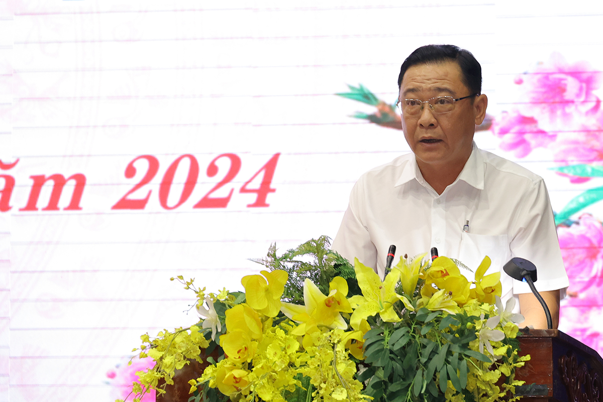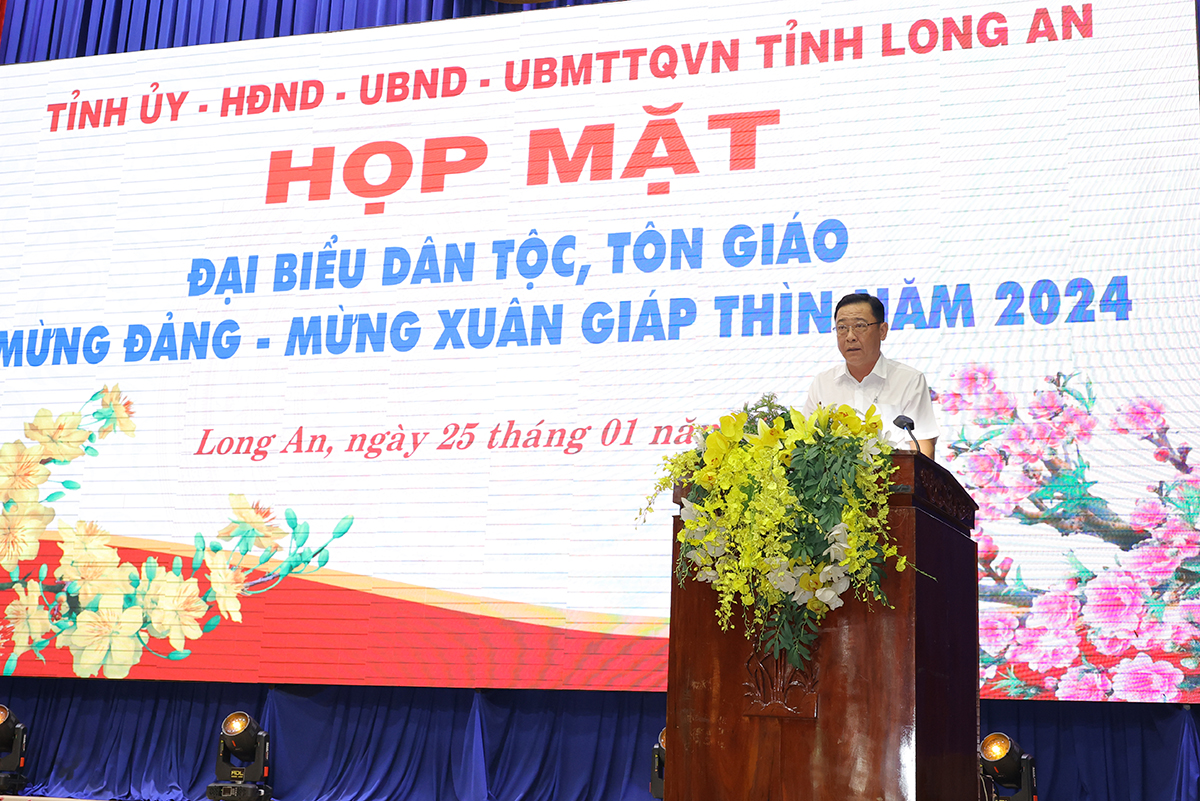 Năm 2024, Tỉnh ủy Long An xác định là năm “về đích sớm” trong thực hiện Nghị quyết Đại hội XIII của Đảng, Nghị quyết Đại hội XI Đảng bộ tỉnh. Tỉnh ủy đã đề ra các mục tiêu, nhiệm vụ và giải pháp toàn diện trên các lĩnh vực phát triển kinh tế – xã hội, bảo đảm quốc phòng – an ninh; đối ngoại; xây dựng, chỉnh đốn Đảng và phòng, chống tham nhũng, tiêu cực trong năm 2024. Với quyết tâm năm 2024 phải đạt kết quả cao hơn và tốt hơn năm 2023. Ông Phó Bí thư Thường trực Tỉnh ủy tin tưởng đồng bào các dân tộc, các chức sắc, tín đồ tôn giáo tiếp tục cùng nhau đoàn kết chặt chẽ, phát huy truyền thống yêu nước trên tinh thần đoàn kết, tương thân – tương ái sống tốt đời đẹp đạo, tham gia các phong trào thi đua yêu nước. Tham gia cuộc vận động, để góp phần cùng các cấp, các ngành, các tầng lớp nhân dân trong tỉnh cùng chung sức, chung lòng phấn đấu vượt mọi khó khăn, thách thức, tích cực thực hiện các mục tiêu kinh tế – xã hội và an ninh quốc phòng của tỉnh năm 2024 đạt kết quả cao nhất.