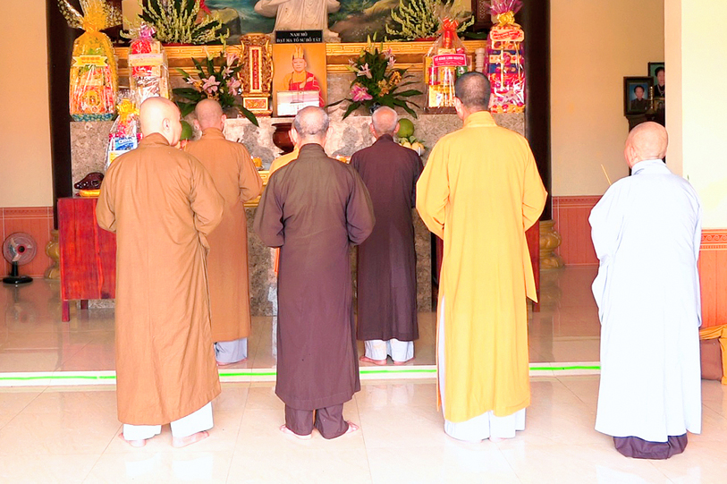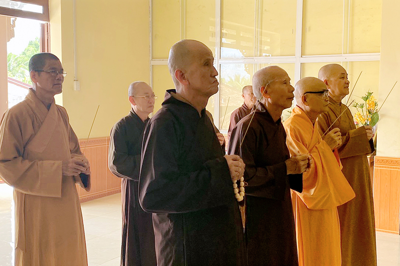 Trong buổi lễ, chư Tôn đức Thường trực BTS Phật giáo tỉnh đã đến trước tổ đường chùa Vạn Linh thắp hương tưởng niệm cố Hòa thượng Thích Thiện Thanh, nguyện cầu Giác linh cố Hòa thượng cao đăng Phật quốc, hội nhập ta bà, phổ độ quần sanh.