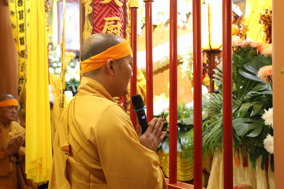 Thay lời BTC lễ tang và môn đồ pháp quyến, Đại đức Thích Trí Minh – Uỷ viên Thường trực BTS GHPGVN tỉnh Long An, Trưởng BTS GHPGVN huyện Cần Đước, Trưởng BTS Tang lễ đã dâng lời tri ân cảm niệm và cung thỉnh phái đoàn hữu nhiều Kim Quan để tiễn biệt Cố Hòa thượng.