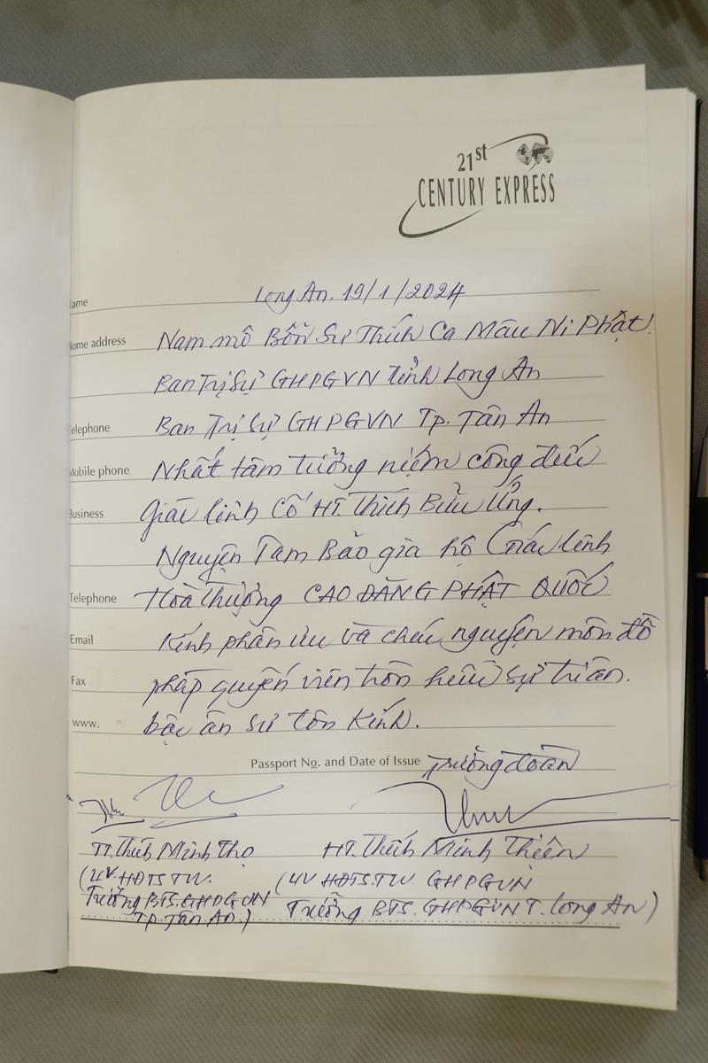 Tại lễ tang Chư tôn Hòa thượng, Chư tôn đức Tăng Ni, đã lưu lại đôi dòng cảm niệm nơi Sổ tang và phân ưu cùng Tông môn pháp phái, môn đồ pháp quyến và Ban Trị sự Phật giáo huyện Cần Đước vừa mất đi một bậc tôn đức uy đức, một vị thầy khả kính, vị giáo phẩm lãnh đạo Phật giáo huyện nhà.