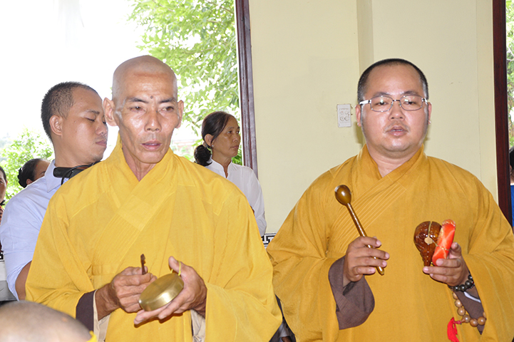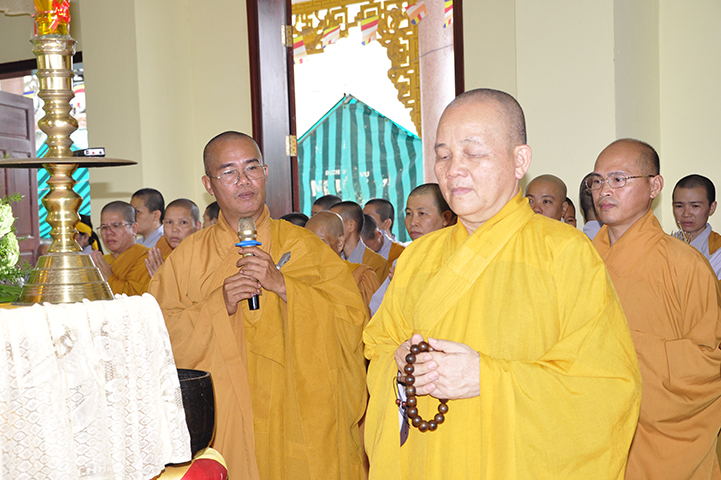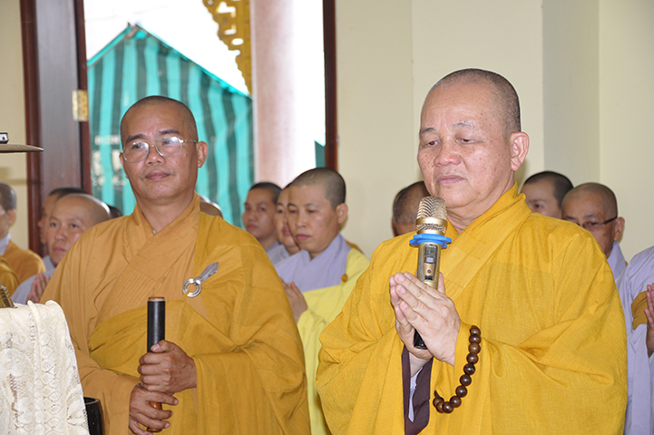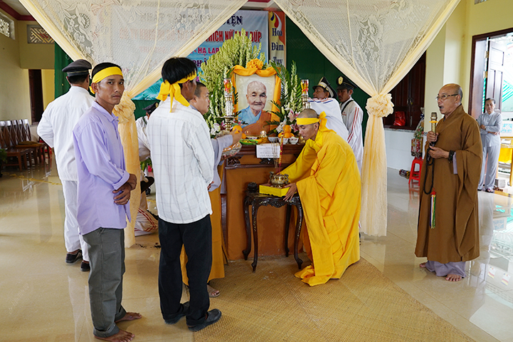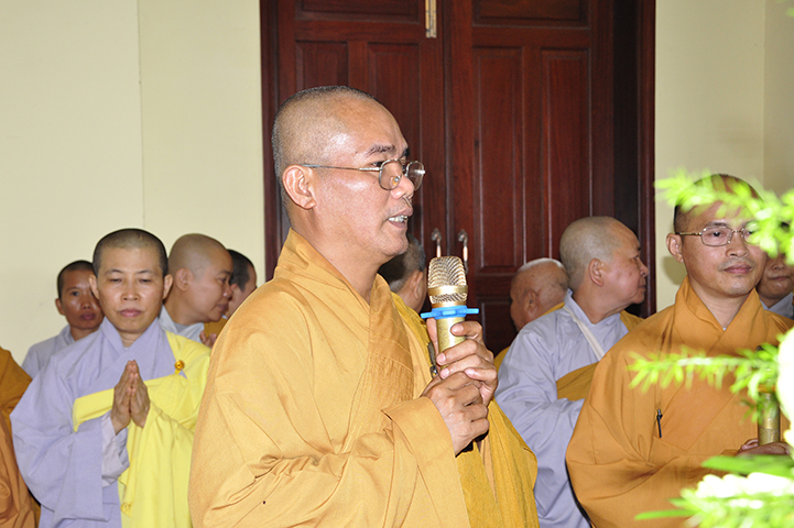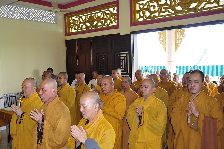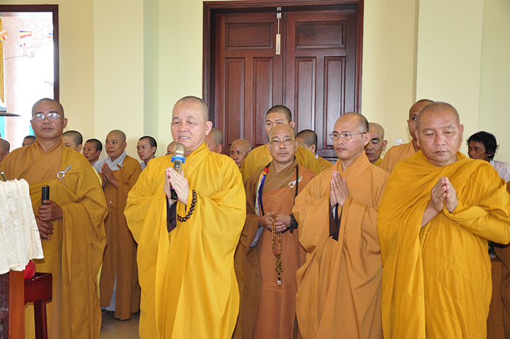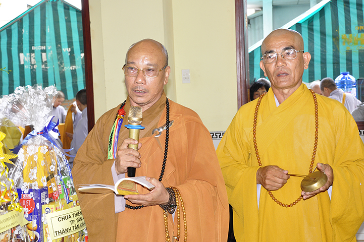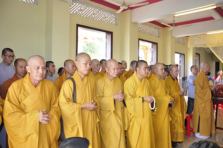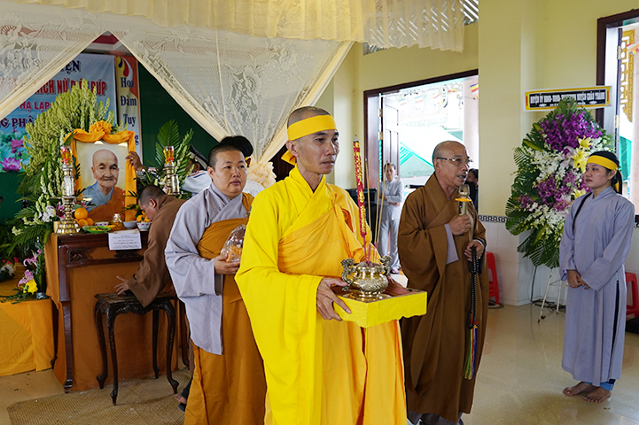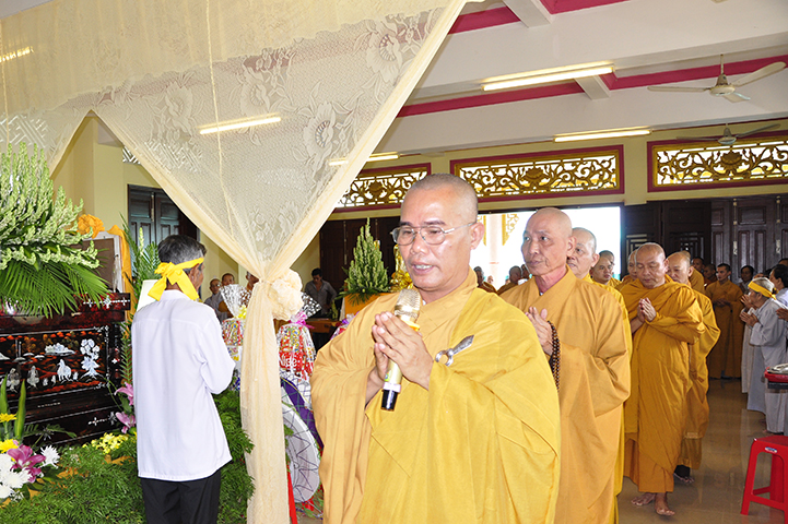 Sau phần niệm hương bạch Phật trước lễ đài, đến phần tưởng niệm giác linh Ni sư Diệu Búp, HT. Thích Minh Thiện – Trưởng Ban trị sự GHPGVN tỉnh Long An, trưởng phái đoàn, đãi lao Hoà thượng Thích Thiện Huệ, chư tôn đức trong phái đoàn, với thâm tình linh sơn pháp lữ, Hoà thượng đã chia sẽ và nhắc lại chặng đường tu học của cố Ni sư: Ni sư được phước lành làm đệ tử với cố Trưởng lão Hoà thượng thượng Hoằng hạ Đức; từ đó Ni sư tu học theo hạnh, từ ái, khiêm cung, tinh tấn công phu, công quả của hoà thượng ân sư và duy trì cho đến ngày trở về với Phật. Đặc biệt, dù sức khoẻ yếu nhưng gần 25 năm giữ gìn ngôi già lam Bình An, Ni sư đã thành lập được các khoá tu học cho Phật tử địa phương, cung thỉnh được nhiều chư tôn đức về giảng dạy cho đạo tràng. Và nhân duyên từng xuất thân từ gia đình cách mạng nên cuộc đời Ni sư đã đóng góp rất nhiều cho công tác xã hội, từ giáo dục đến từ thiện, xây dựng mặt trận đoàn kết dân tộc v.v…. Qua đó, Hoà thượng cũng muốn nhắc hàng hậu học Ni giới cần học theo đạo hạnh của Ni sư để có nhiều cống hiến, đóng góp cho Đạo pháp – Dân tộc!