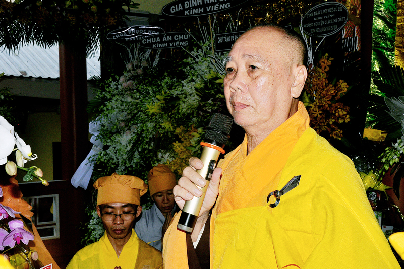 Thay mặt cho phái đoàn, Trưởng đoàn, HT. Thích Minh Thiện đã có lời tưởng niệm thể hiện sự thương kính đến công lao to lớn của Cố Hòa Thượng. Người đã sống một đời sống phạm hạnh, hết lòng phụng sự và cống hiến cho sự phát triển của Phật giáo tỉnh Long An và Phật giáo huyện Đức Hòa, và cho nền giáo dục Phật giáo mong ước mai sau đào tạo nhưng Tăng Ni thực tu thực học, tiếp Tăng độ chúng, hướng dẫn Phật tử về với chánh đạo, góp phần ổn định an sinh xã hội để Phật giáo càng ngày càng hoàn mỹ, xã hội ngày một văn minh. Hôm nay Hòa thượng “quảy gót về Tây, chốn nghỉ ngơi” nhưng Cổ đức có dạy “Sinh tiền giáo dưỡng, huấn đắc nhân, vô tử nhi hữu tử” ngài đã làm tròn sứ mệnh minh “công đã viên, quả đã mãn” nhưng vẫn nhận được sự quan tâm của Hội Đồng Trị Sự, nhất là Hòa thượng Chủ Tịch thượng Thiện Hạ Nhơn đã thương tưởng đã ký quyết định ban Thượng tọa lên giáo phẩm Hòa Thượng để ghi nhận công lao mà ngài đã đóng góp cho Giáo hội, là biểu tượng thiêng liêng sách tấn cho hàng đệ tử. Chúc ngài “Phật từ độ hửu, quả chứng vô sanh, hồi nhập ta bà, Phục tế chúng sinh”. Hòa thượng nhắc nhở hành Môn đô hiếu quyến noi theo gương hạnh quý báu của Thầy tổ của mình để Giới- Định- Tuệ huân tu, đền ơn Tổ thầy, chung tay góp sức phụng sự đạo pháp, để cho tổ đình Linh Phước ngày một phát triển trong sự thương yêu đoàn kết của huynh đệ.