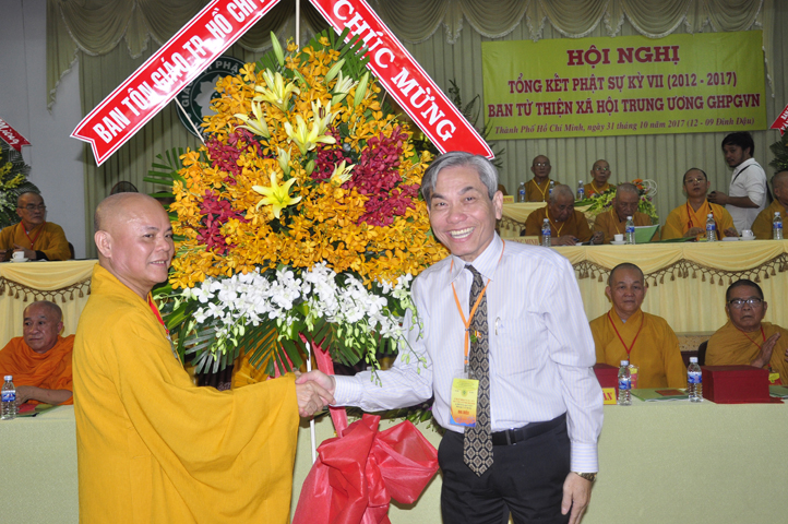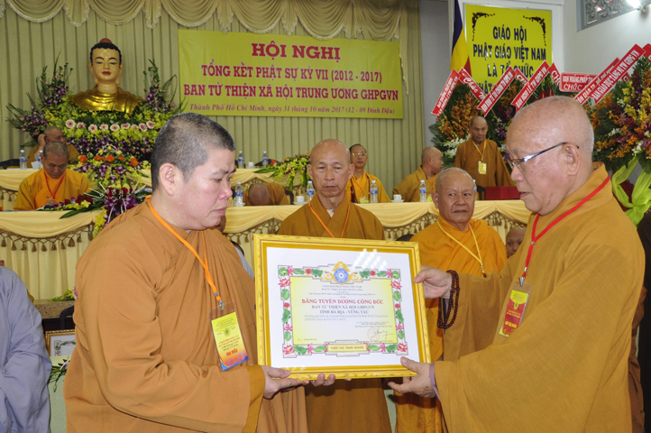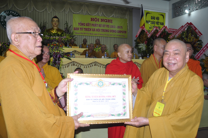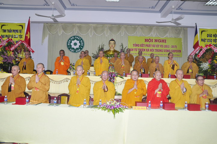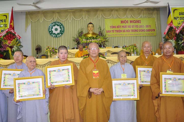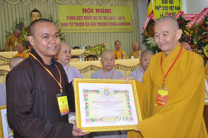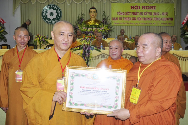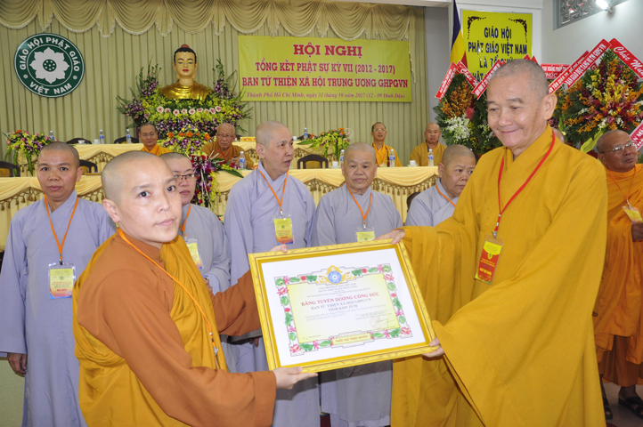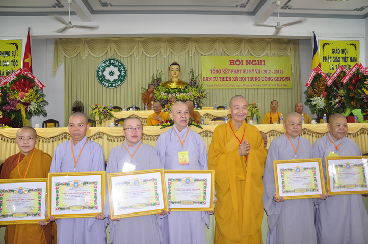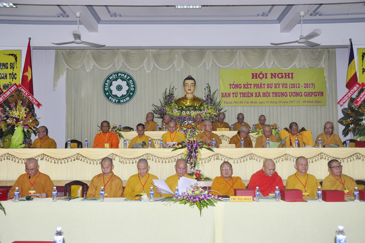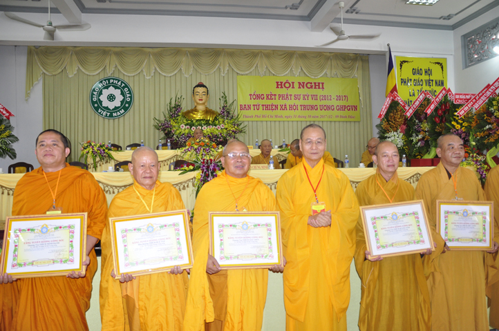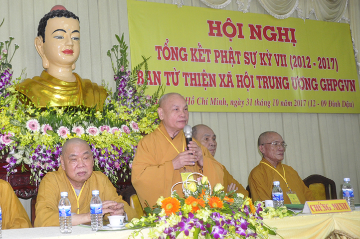 Báo cáo tại Hội nghị, HT.Thích Tấn Đạt, UVTT HĐTS, Phó ban kiêm Chánh Thư ký Ban TTXH T.Ư cho biết, trong nhiệm kỳ 2012-2017, trên cơ cở hỗ trợ của các cấp, các ngành; sự chung tay của mỗi thành viên chuyên trách; Ban đã phối hợp với Ủy ban Trung ương MTTQVN, BTS GHPGVN tỉnh Kiên Giang, Trường Đại học KHXH&NV Hà Nội tổ chức Hội thảo khoa học “Phát huy vai trò của Phật giáo tham gia xã hội hóa công tác xã hội, từ thiện”, duy trì hoạt động hệ thống 165 Tuệ Tĩnh đường, trên 10 phòng khám Đông, Tây y và hàng trăm phòng chẩn trị y học; mở trường nuôi dạy trẻ, nuôi dạy người già, lớp học tình thương, trường dạy nghề; thực hiện cứu trợ đồng bào bị thiên tai dịch họa các tỉnh, thành; tư vấn hỗ trợ người nhiễm, bị ảnh hưởng bởi HIV/AIDS, mổ mắt cho bệnh nhân nghèo; tổ chức các bếp ăn từ thiện, xây dựng nhà tình thương, xây cầu bê tông nông thôn, đóng giếng nước… với tổng kinh phí trên 6.837 tỷ đồng.