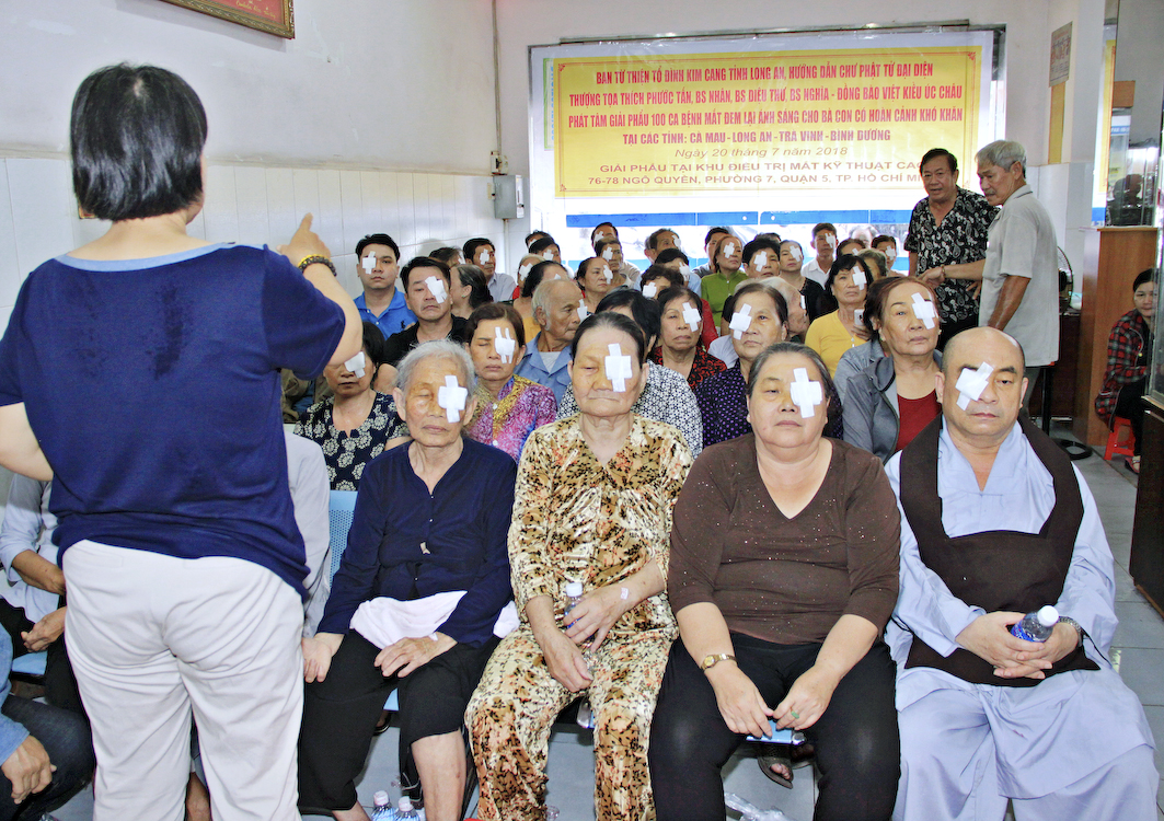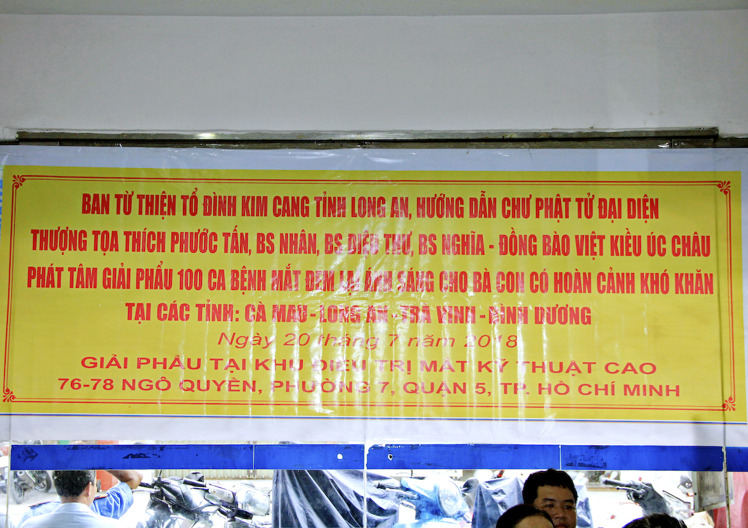 Sáng ngày 20/7/2018 (nhằm ngày mùng 8 tháng 6 năm Mậu Tuất), Ban Từ Thiện Tổ đình Kim Cang ấp Bình Cang 1, xã Bình Thạnh, huyện Thủ Thừa, tỉnh Long An do Đại đức Thích An Phúc và Đại đức Thích An Minh hướng dẫn Phật tử Phạm Lan Trinh đại diện cho TT. Thích Phước Tấn và đồng bào Úc châu đến Khu điều trị mắt Kỹ Thuật Cao 76 -78 Ngô Quyền, F7, Q5, Tp.HCM để tài trợ 135 ca phẫu thuật mắt cho bà con các tỉnh Bình Dương, Long An, Cà Mau, Trà Vinh….