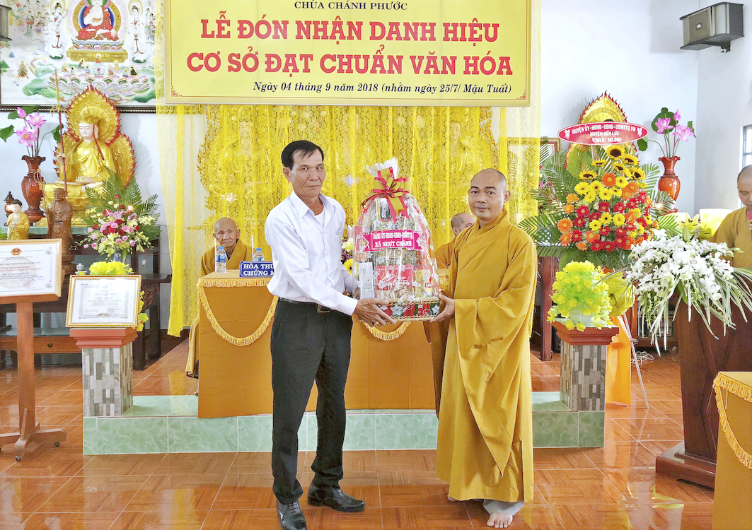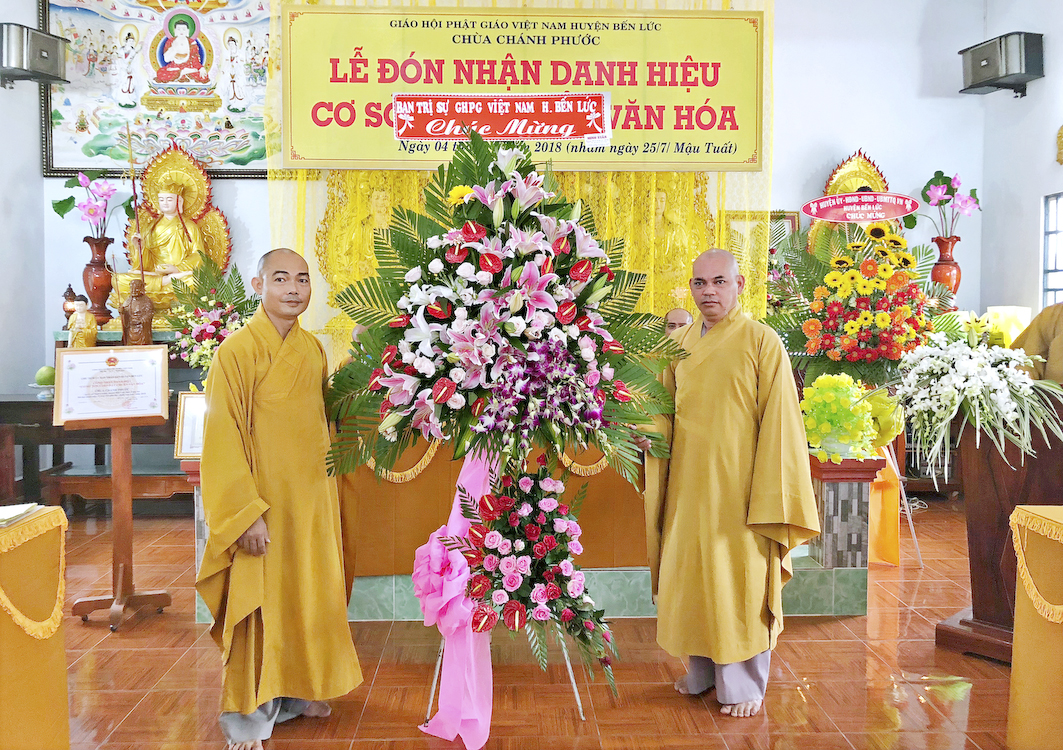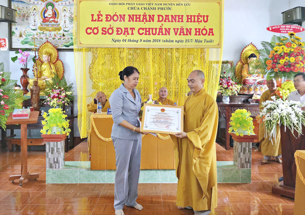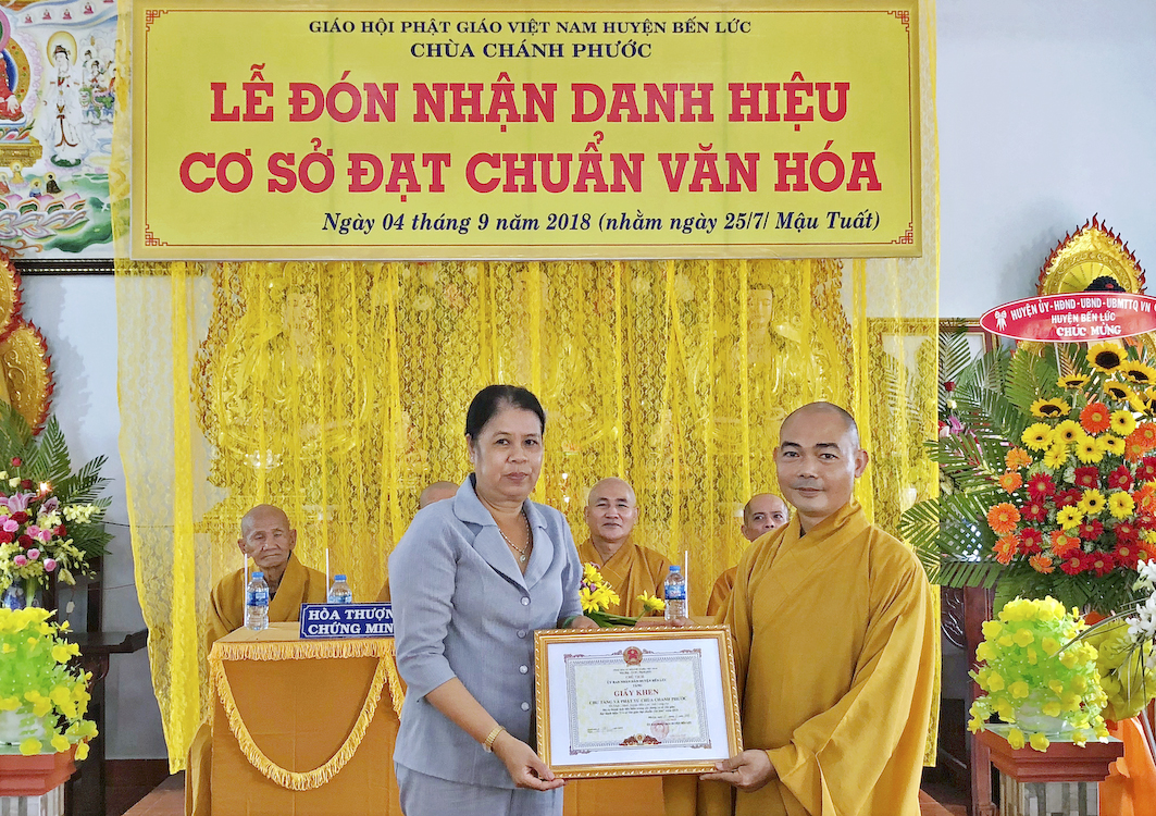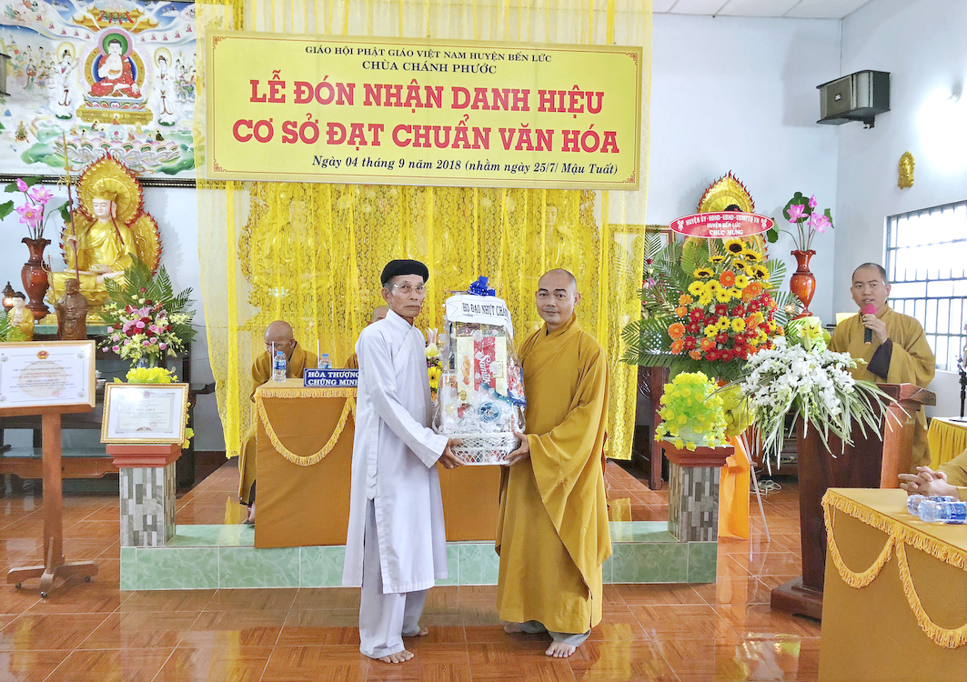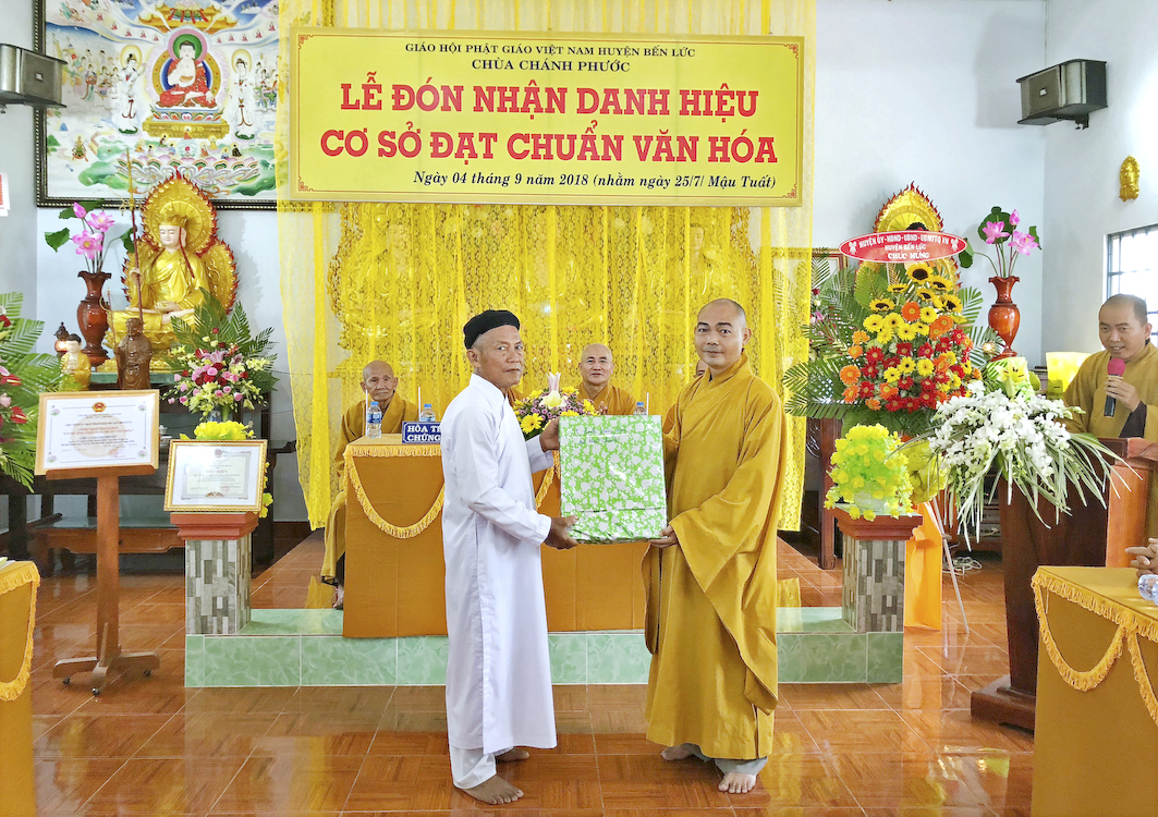 Trong buổi lễ hôm nay, Đại đức Thích Tắc Nhiên, trụ trì chùa Chánh Phước đã vinh dự đón nhận Bằng công nhận, cơ sở thờ tự đạt chuẩn văn hóa và hoa chúc mừng từ lãnh đạo chính quyền Huyện Bến Lức trao tặng.